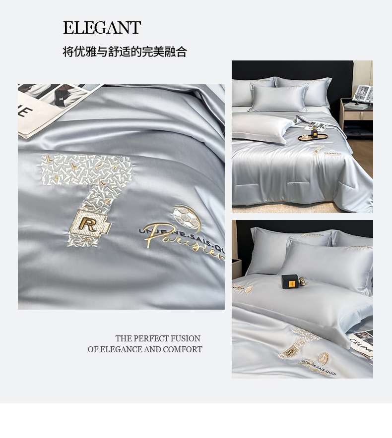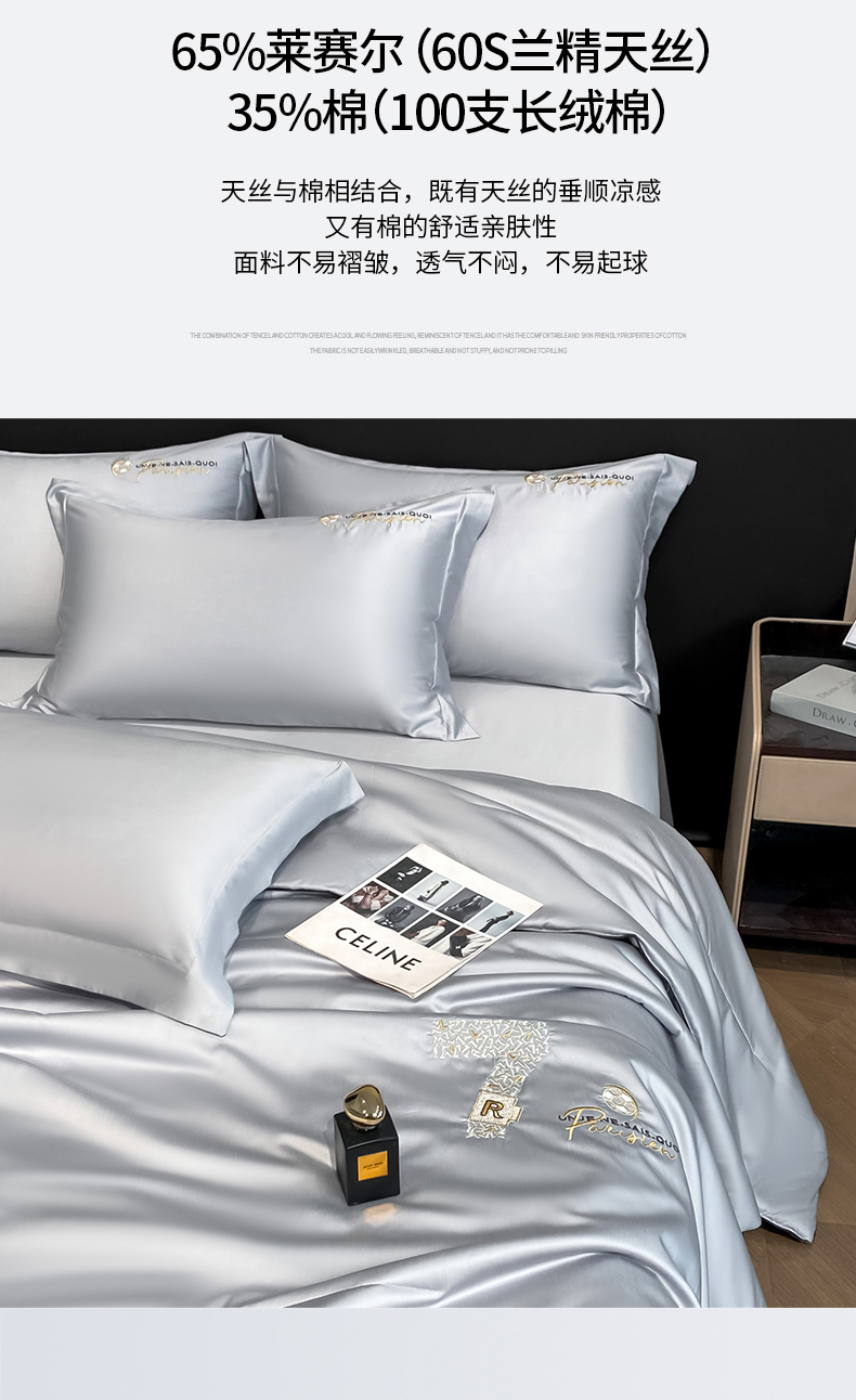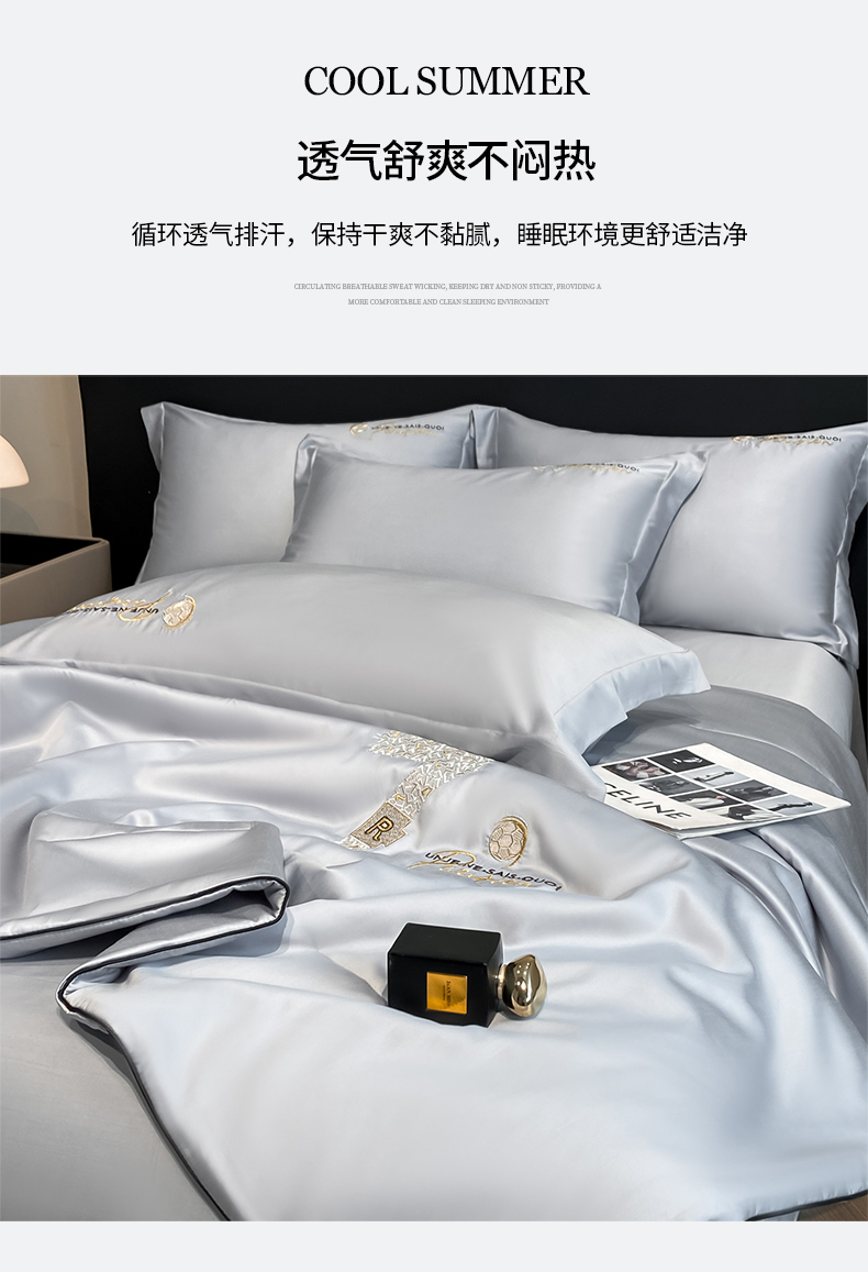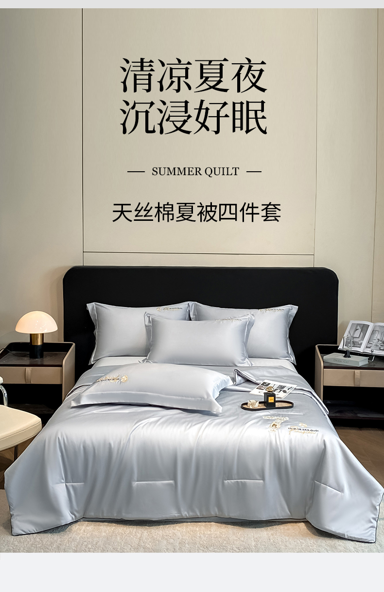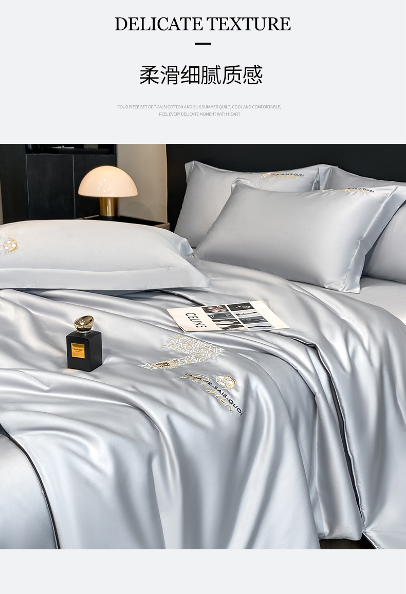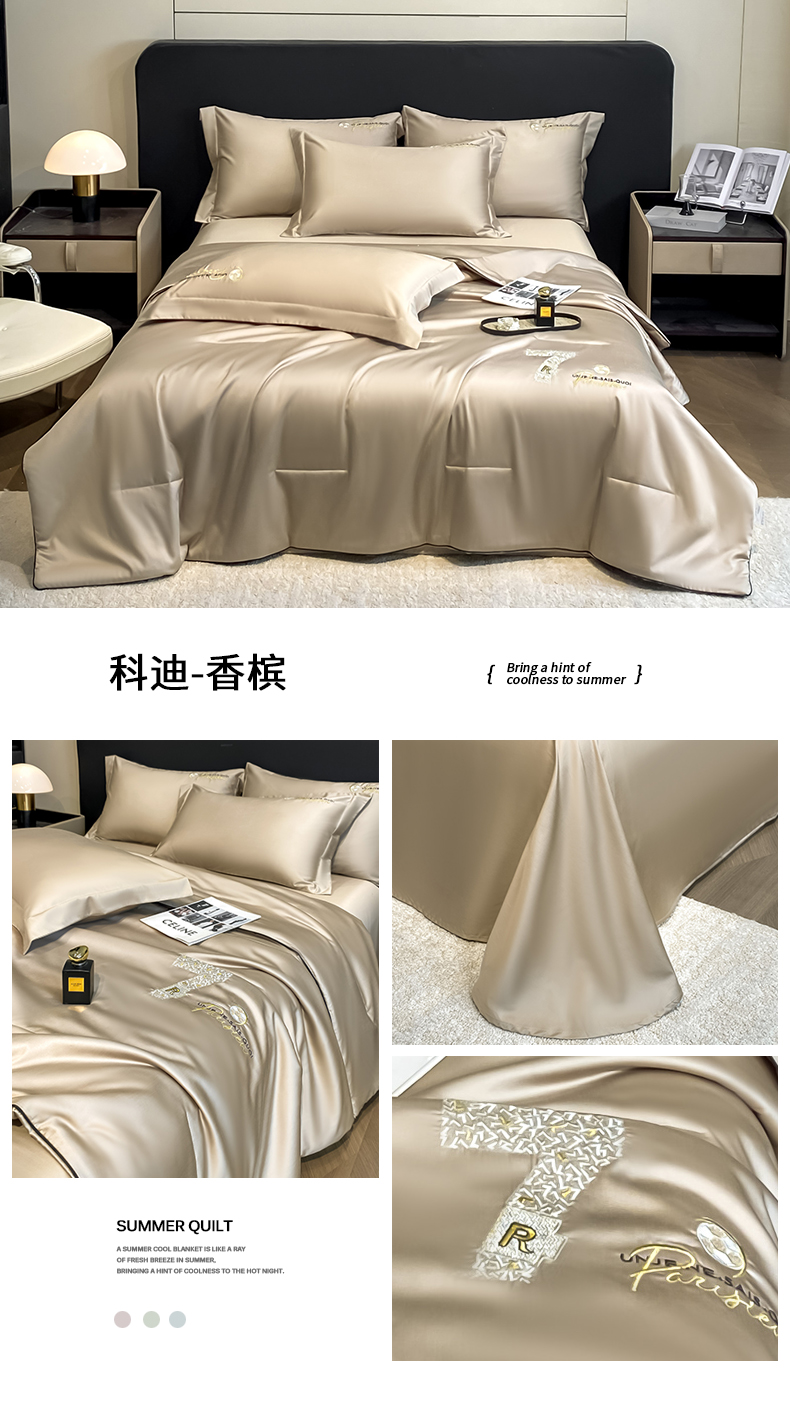 • 91家纺网 家纺一手货源 找家纺 (总)新方向 2026刺绣A类20%蚕丝天丝棉夏被四件套 65%60s兰精天丝 35%100支长绒棉-科迪,科迪-朦胧灰,科迪-香槟