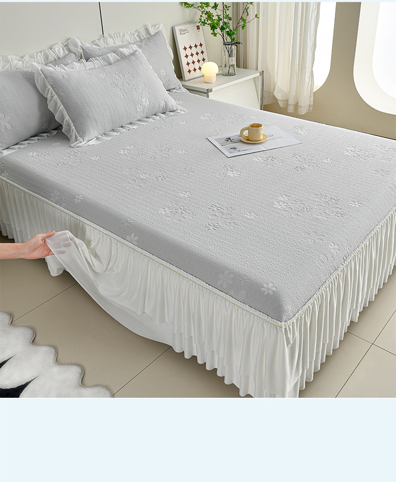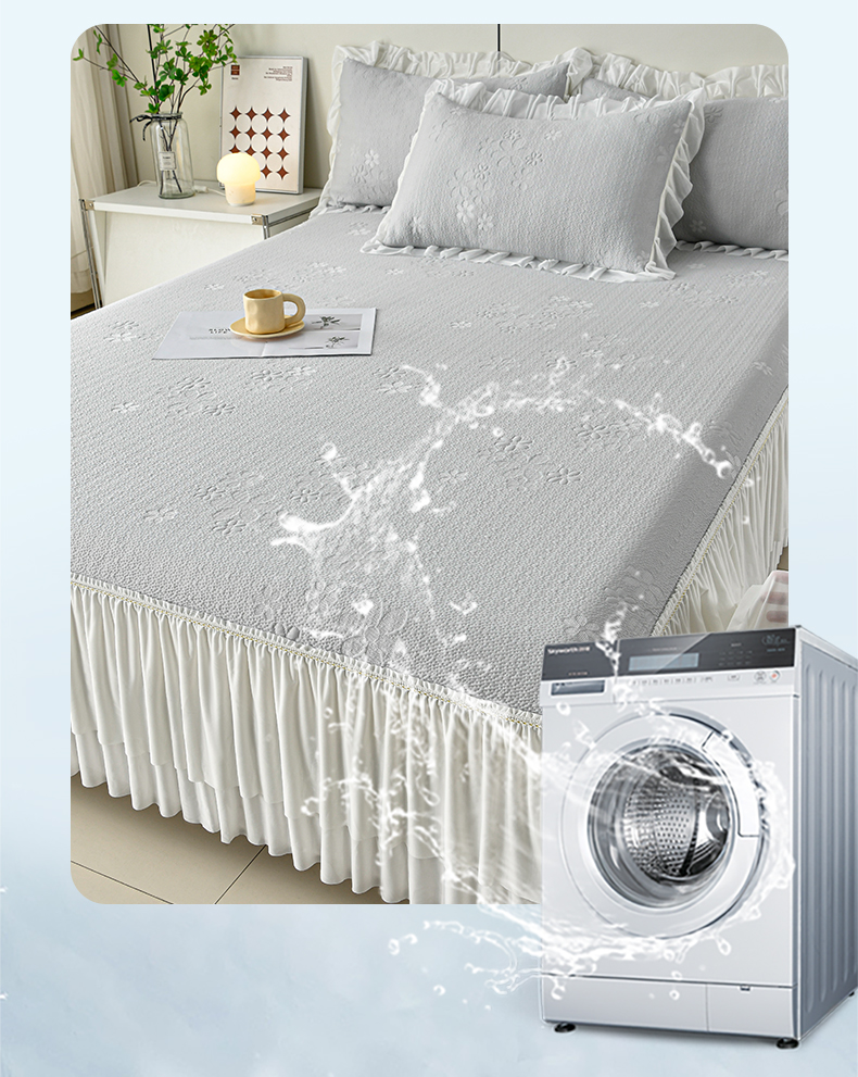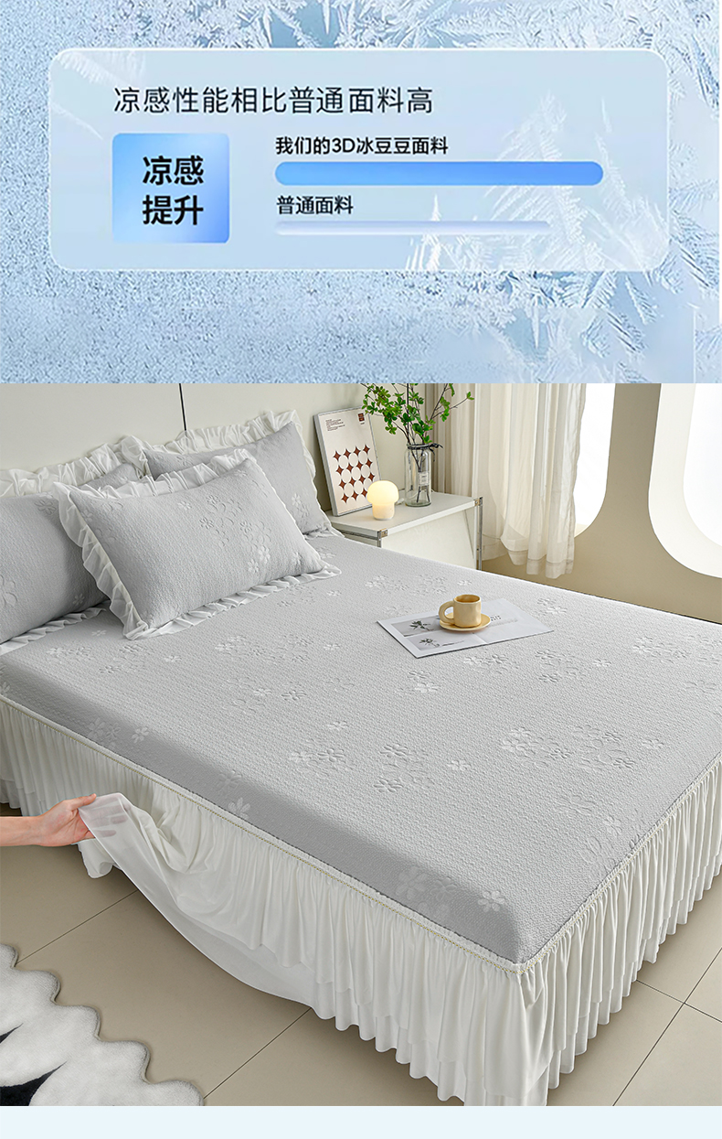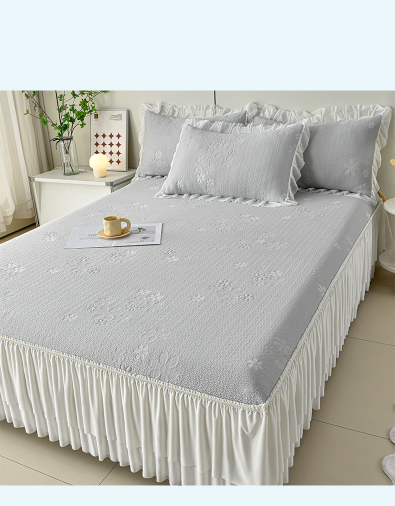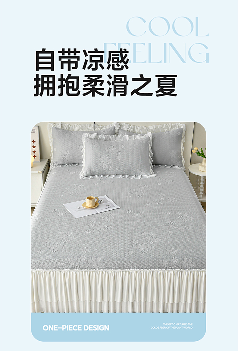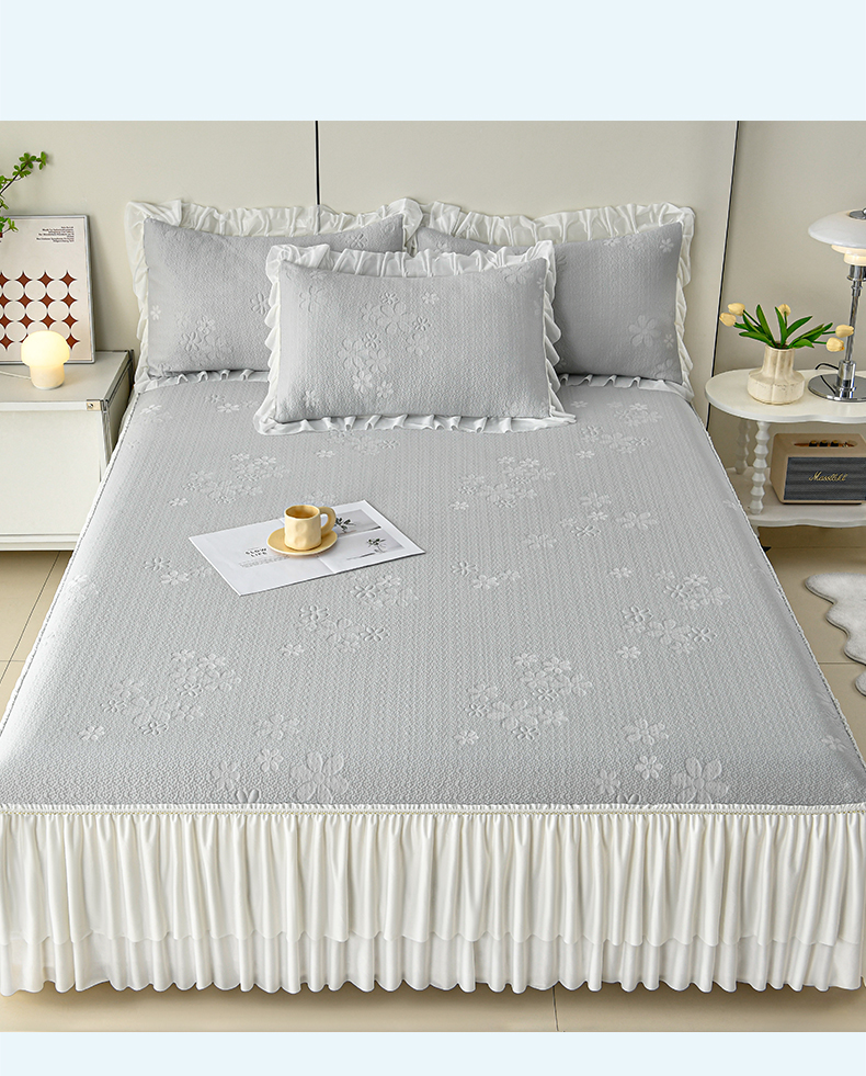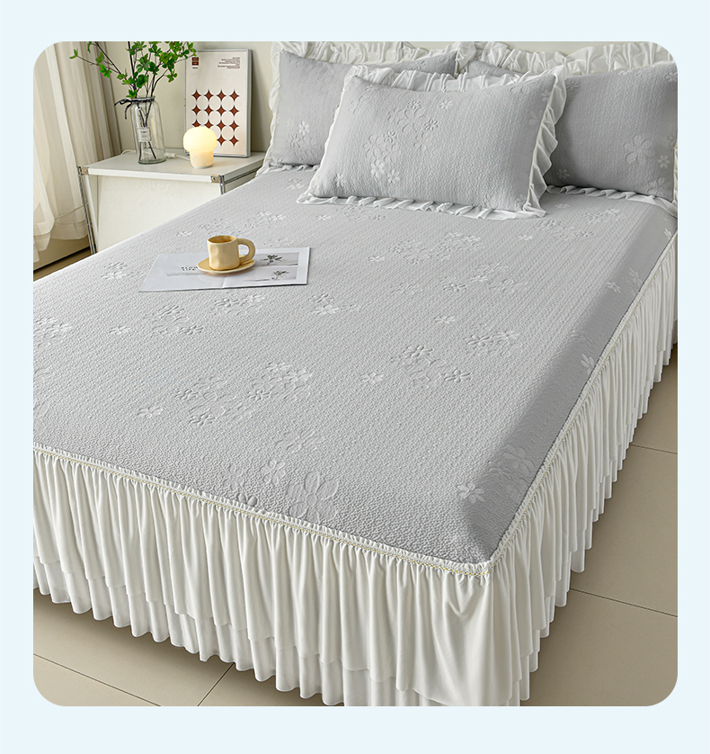 (总)畅畅家纺 2026新款锦氨夏被PE凉感豆豆凉席绣花三明治复合床裙三件套四件套,格韵-粉-床裙款,格韵-灰-床裙款,格韵-蓝-床裙款,格韵-绿-床裙款