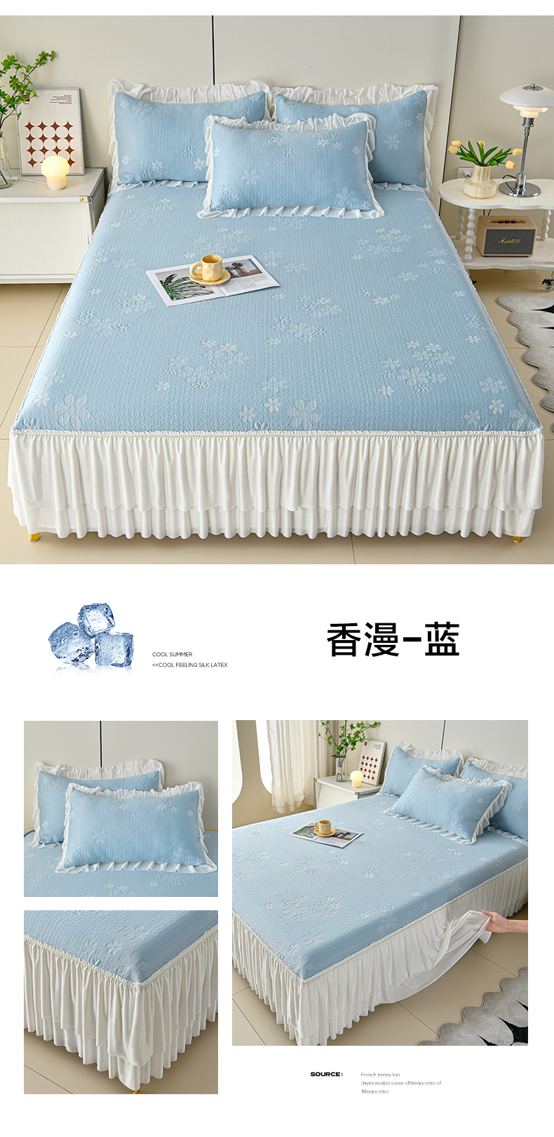 (总)畅畅家纺 2026春夏新款豆豆冰丝印花复合床裙款席子凉席三件套,花颜-蓝,花语-绿,柔梦-绿,柔梦-紫,炫彩-粉,栀子-蓝