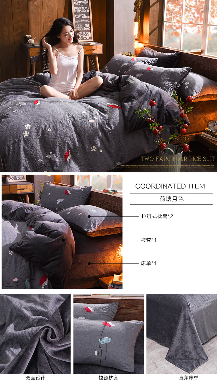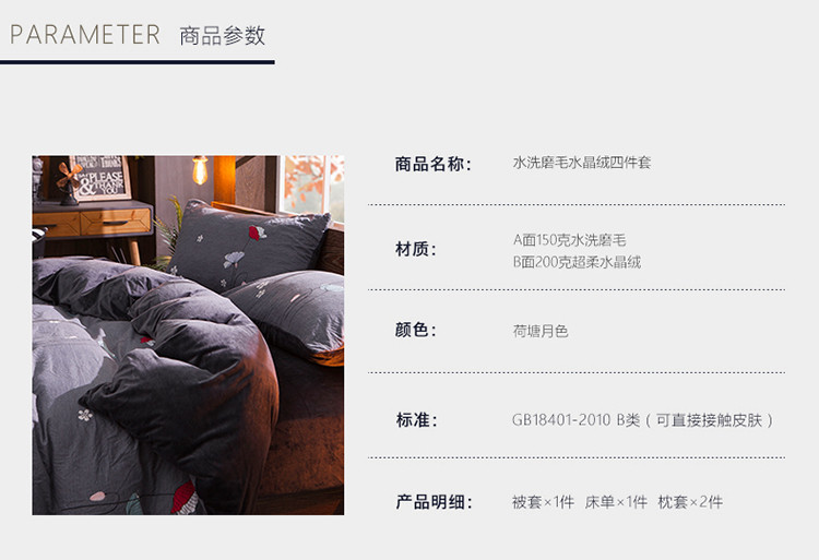 商品名称:芃成家纺 水洗磨毛加绒四件套 荷塘月色