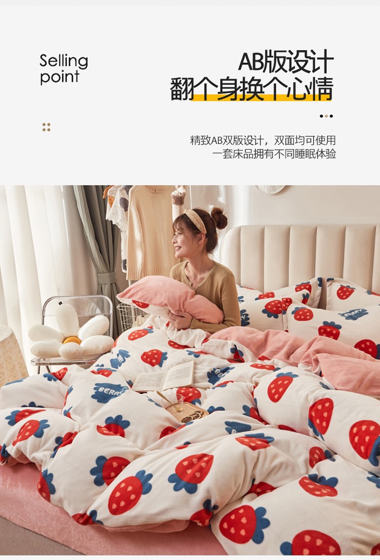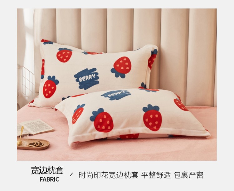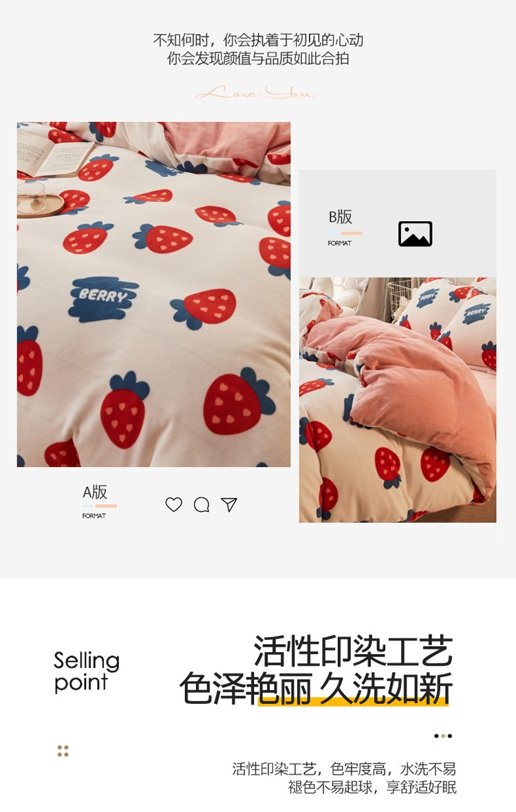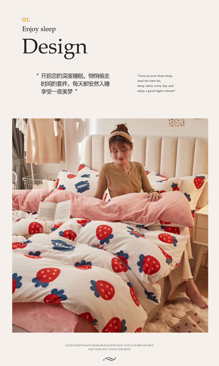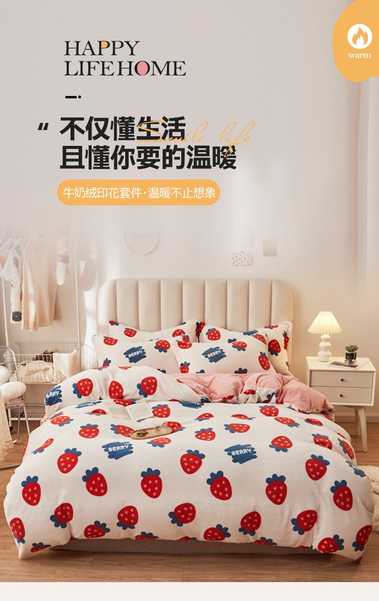 当前位置: 91家纺网 > 商品网购 > 床品套件 > 四件套 > 牛奶绒四件套 > 寐居家纺 2021新款印花牛奶绒四件套浅色调 甜心草莓