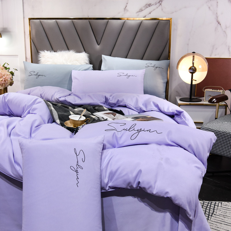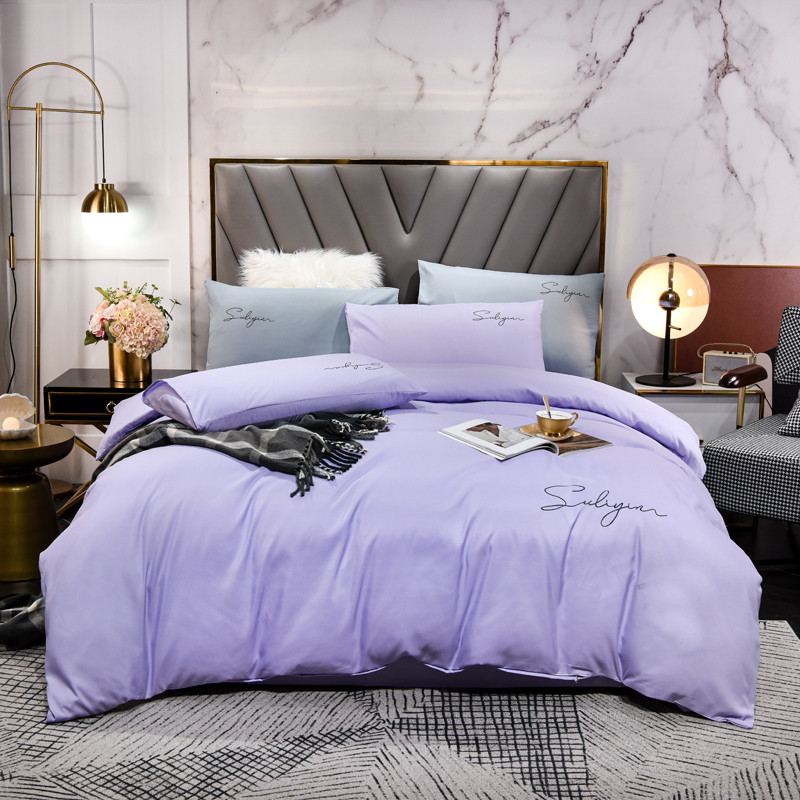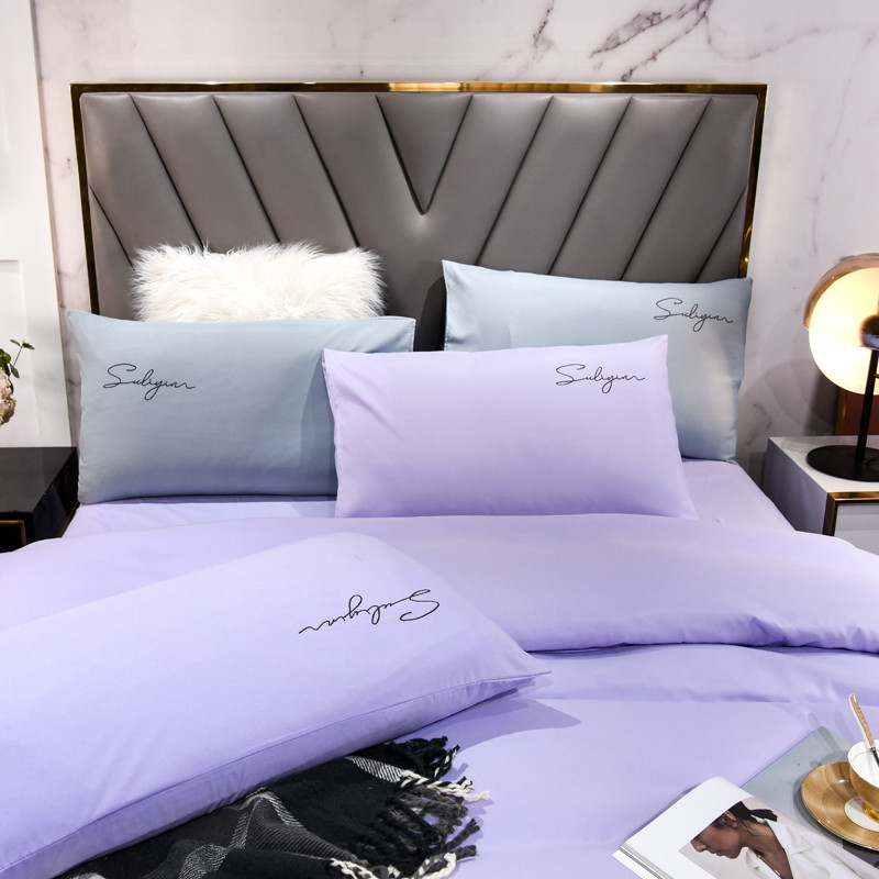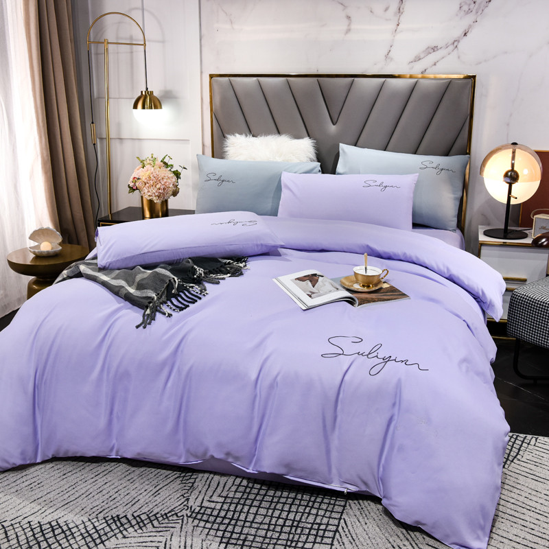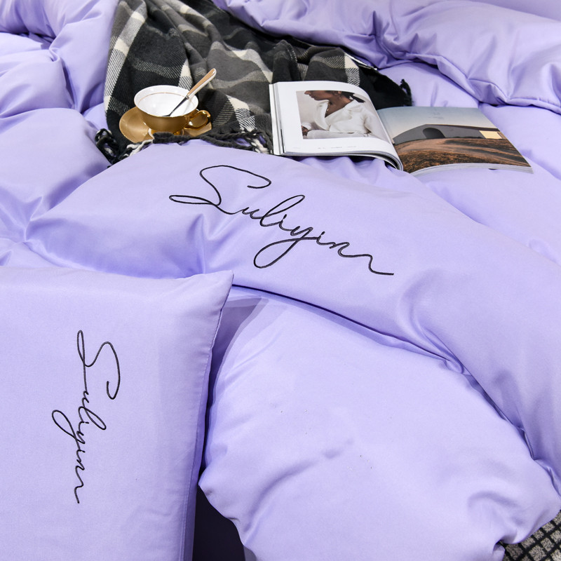 孟鑫家纺 2021新款加厚纯色刺绣磨毛四件套 雪青