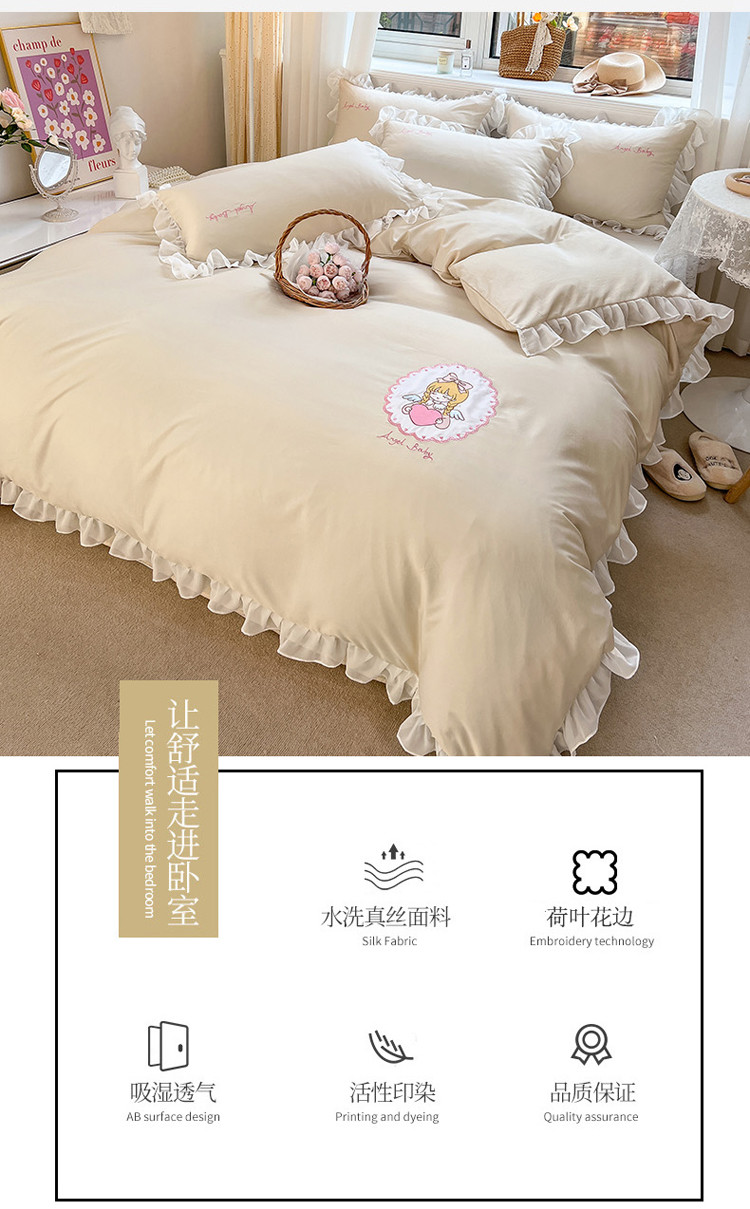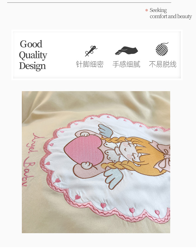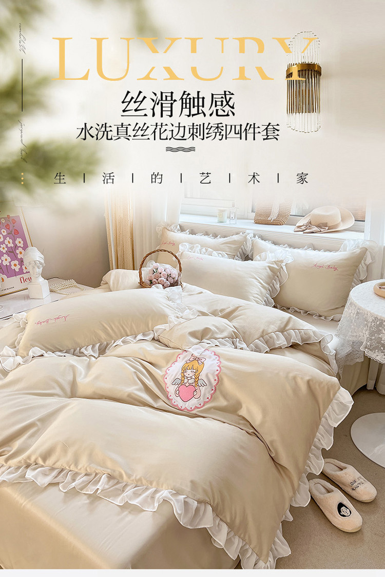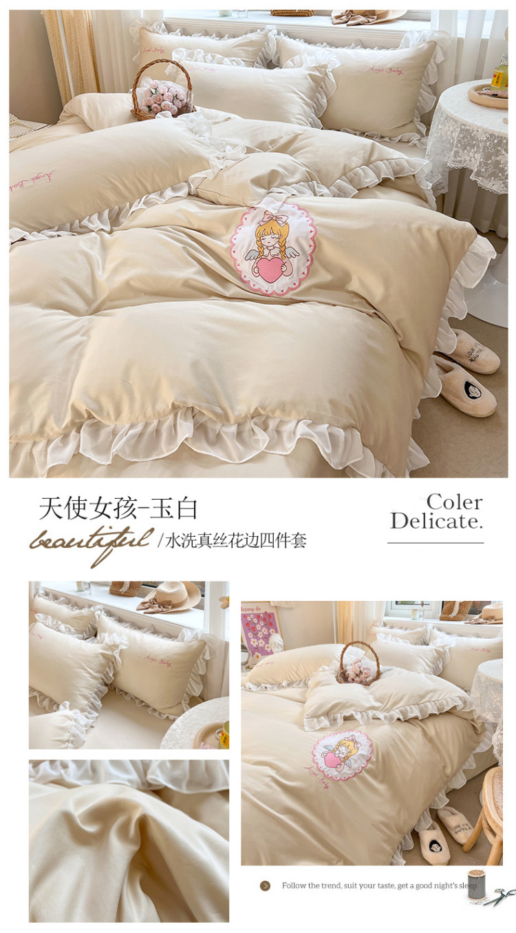 当前位置: 91家纺网 > 商品网购 > 床品套件 > 四件套 > 水洗真丝四件套 > 沐慕 22新款水洗真丝刺绣花边四件套 天使女孩-玉白