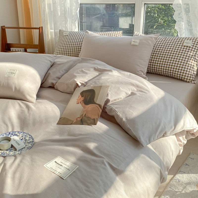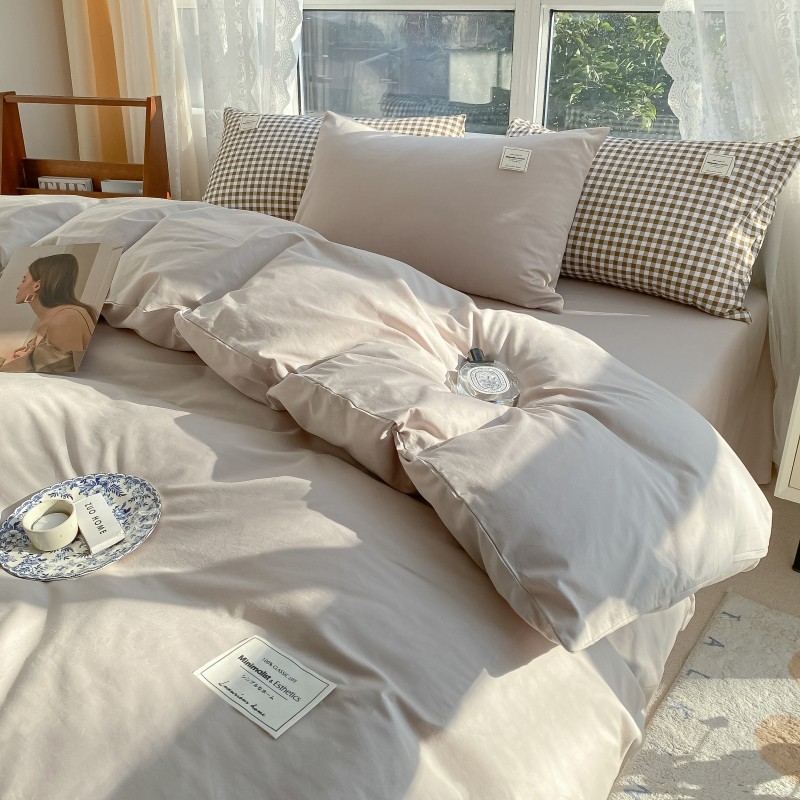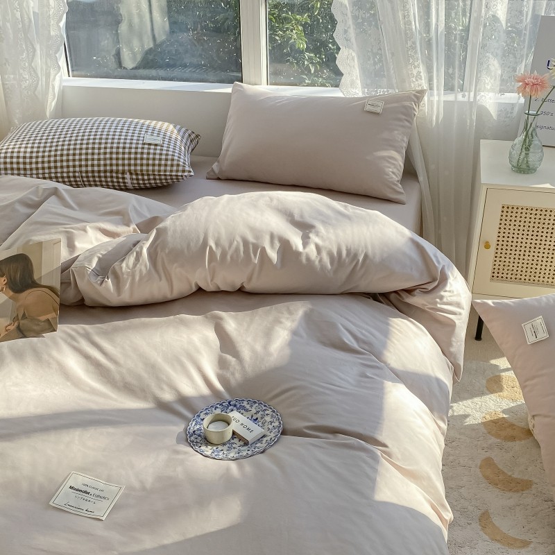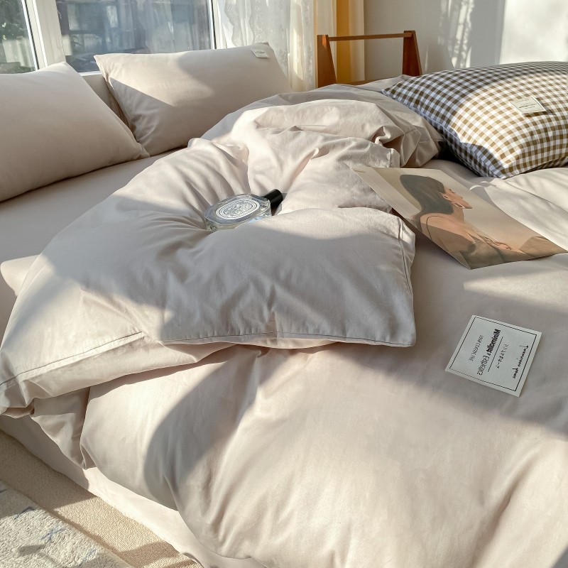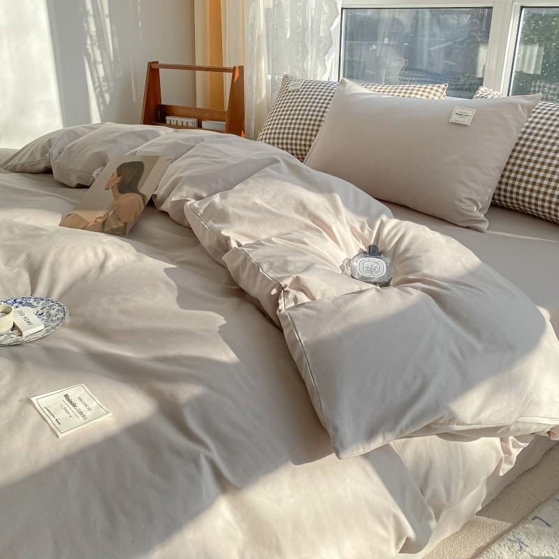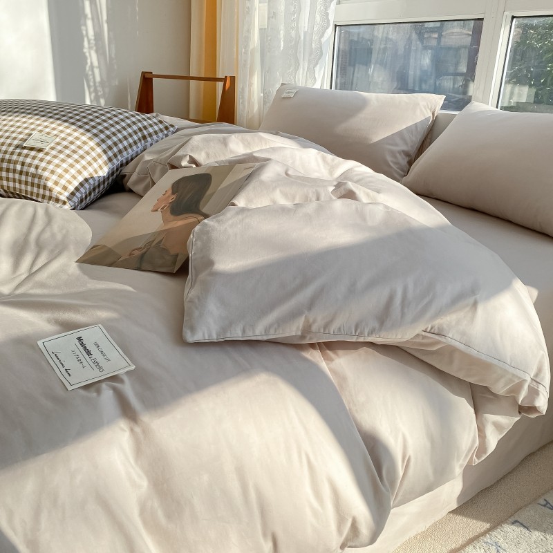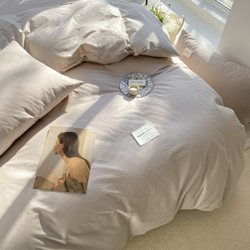 2025小清新40支水洗全棉纯色双拼四件套单被套 米驼