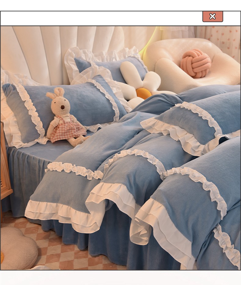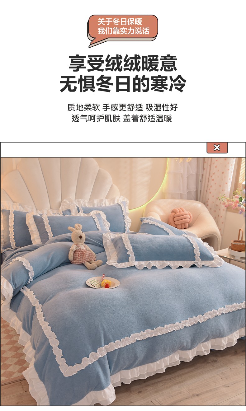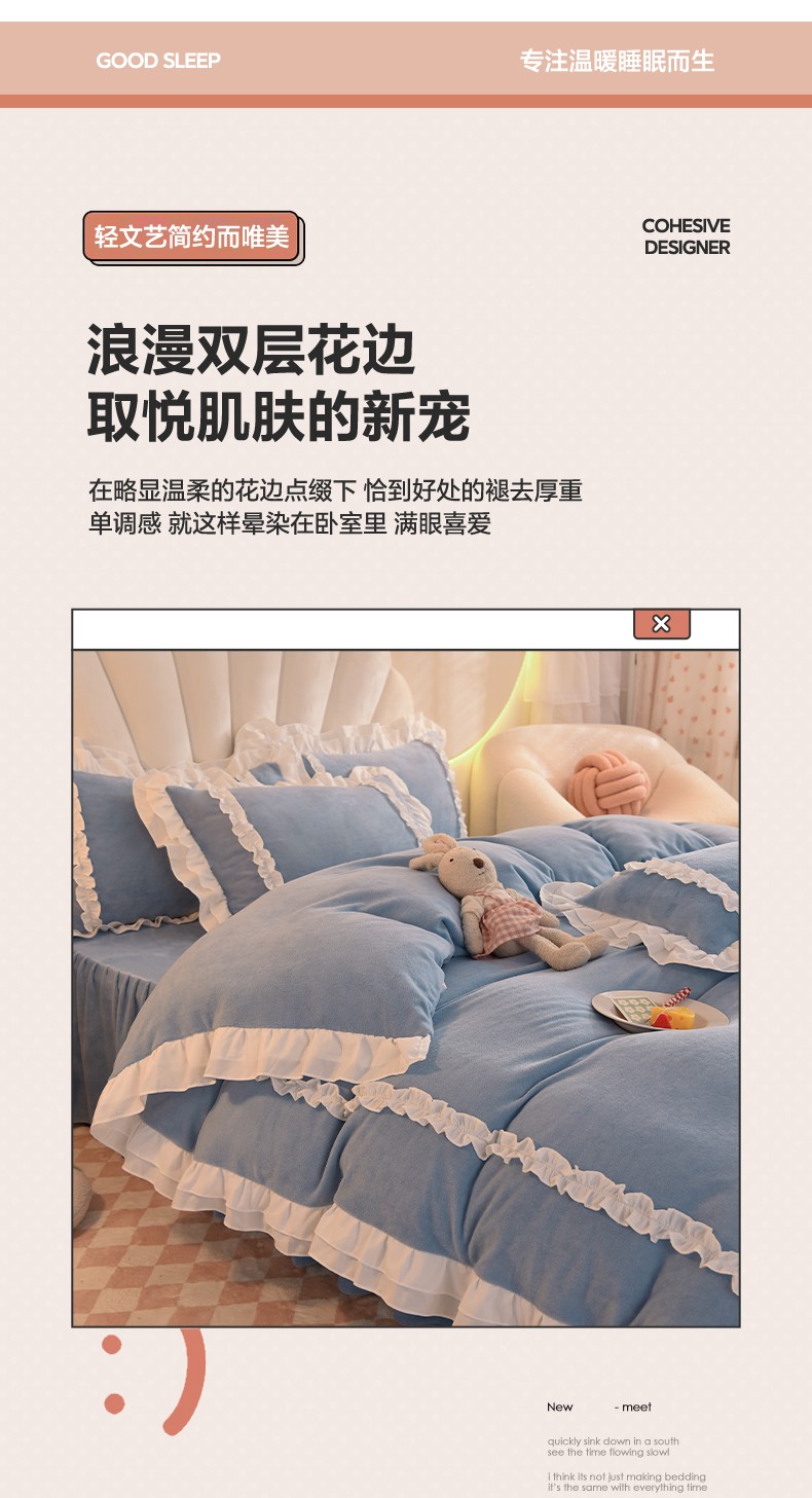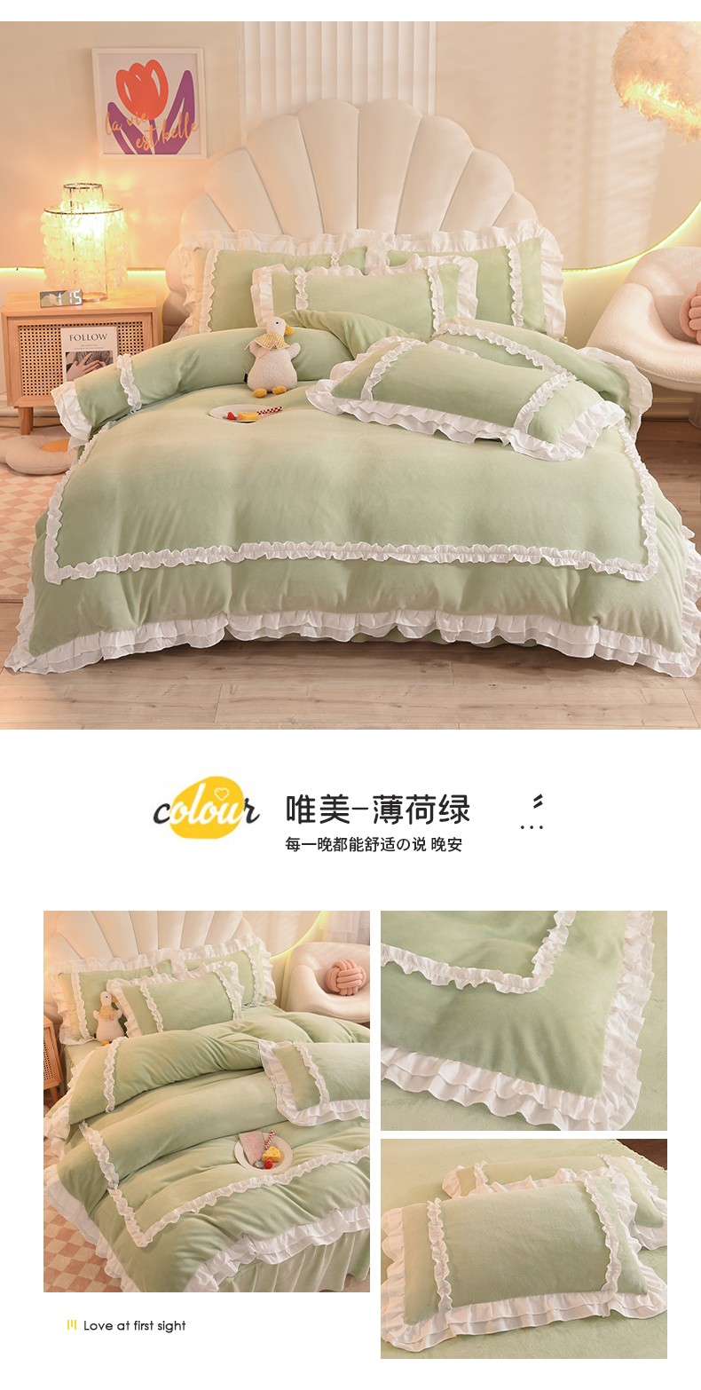 当前位置: 91家纺网 > 商品网购 > 床品套件 > 四件套 > 牛奶绒四件套 > 逸尚阁-2022新款双层花边牛奶绒四件套件套 唯美-薄荷绿
