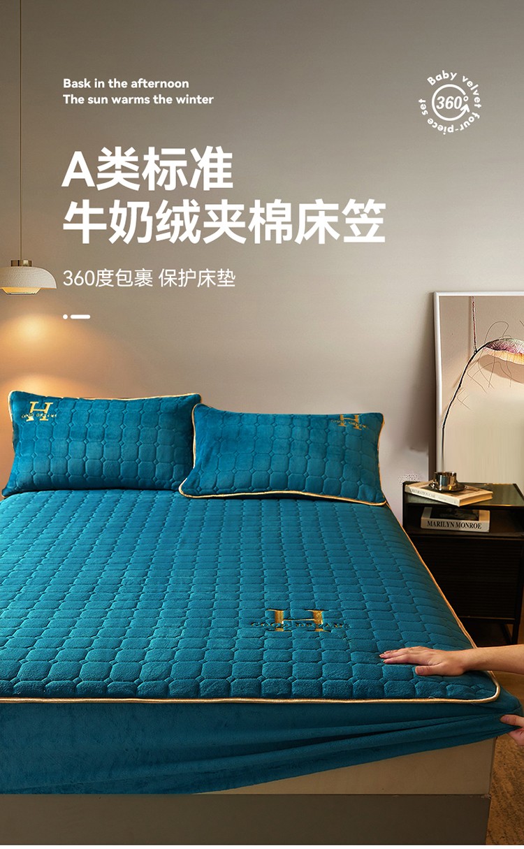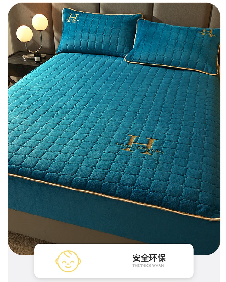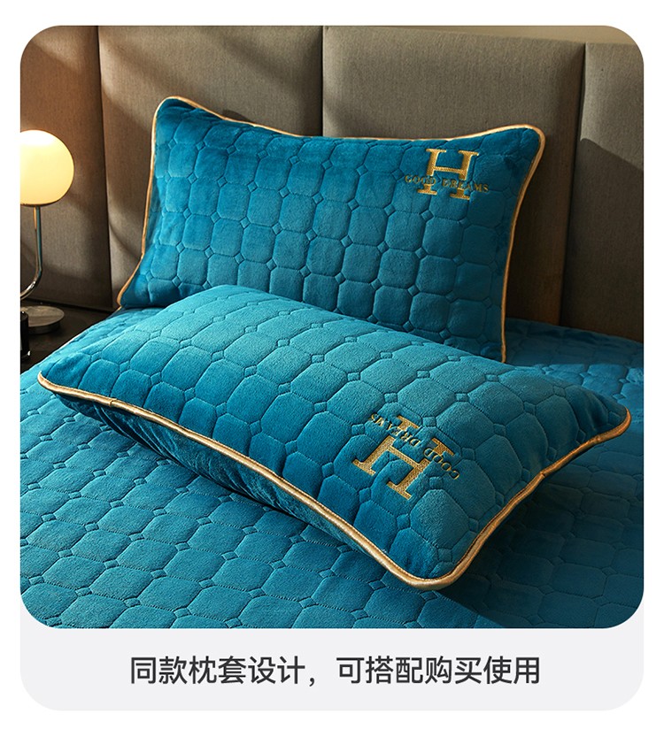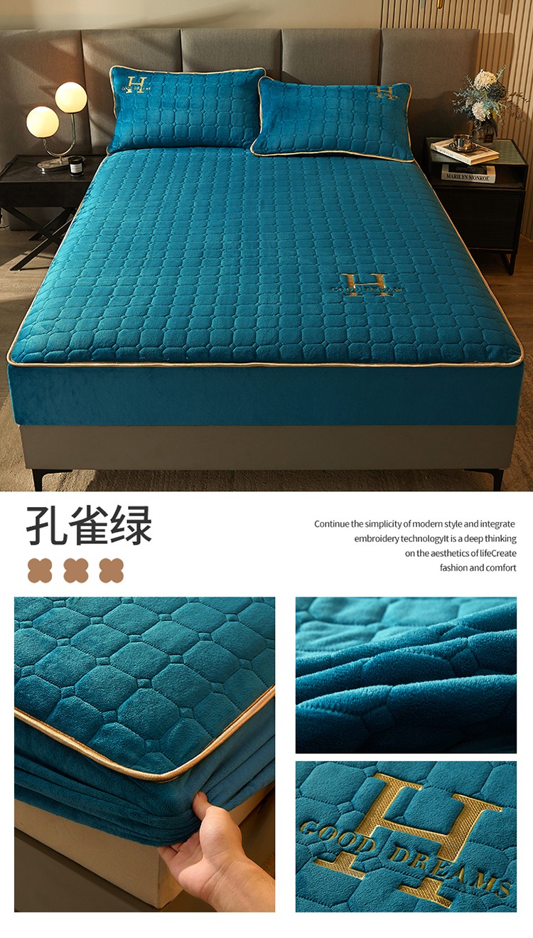 恒爱2022秋冬新款A类牛奶绒刺绣夹棉单床笠--H系列孔雀绿