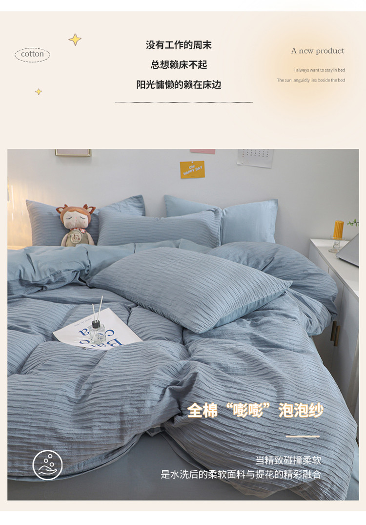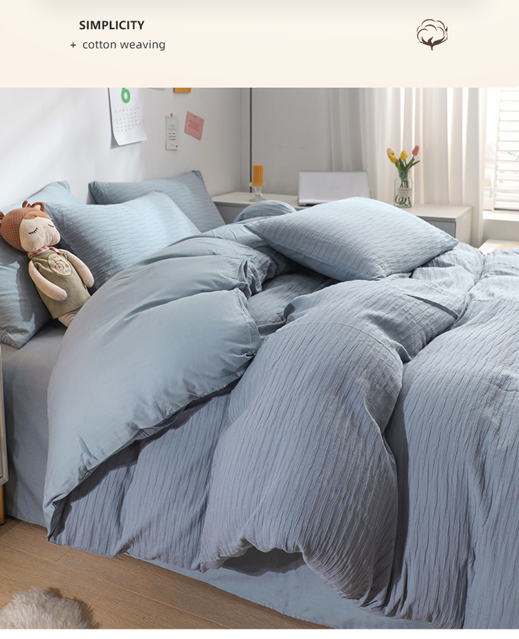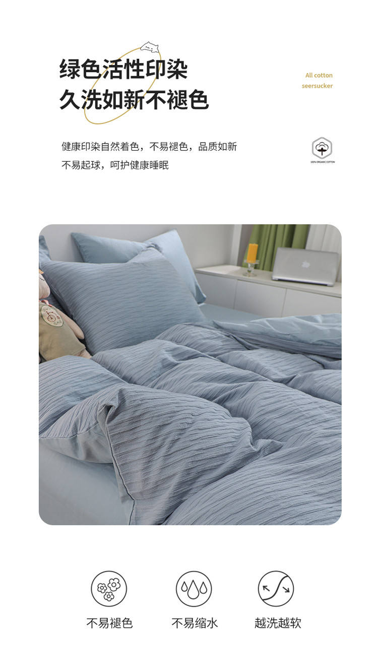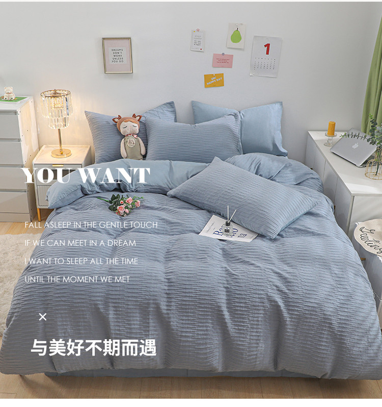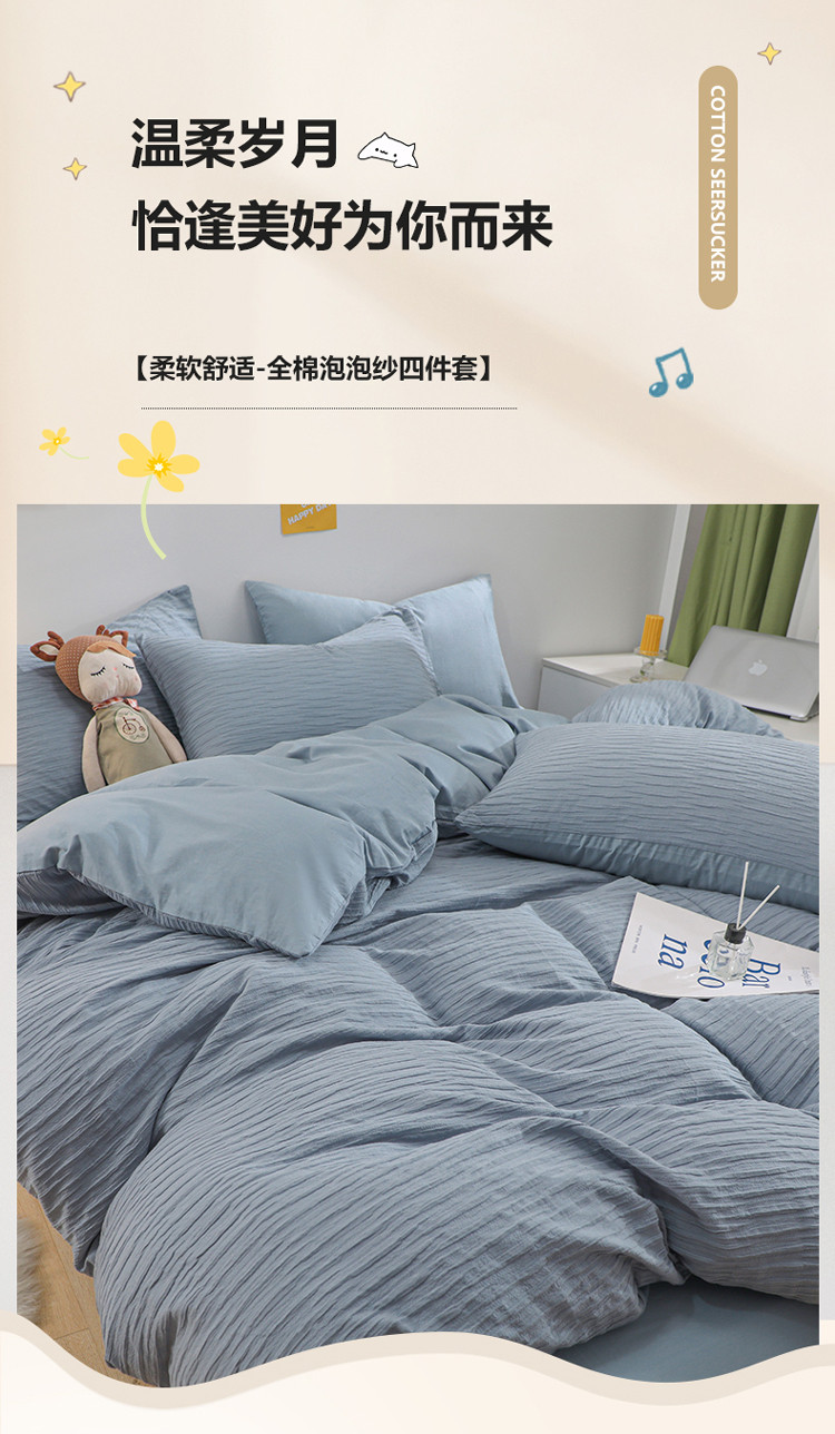 当前位置: 91家纺网 > 商品网购 > 床品套件 > 四件套 > 全棉普通四件套 > 沐晴 2022新款简约纯棉双拼泡泡纱全棉床单床笠款四件套 雾霾蓝
