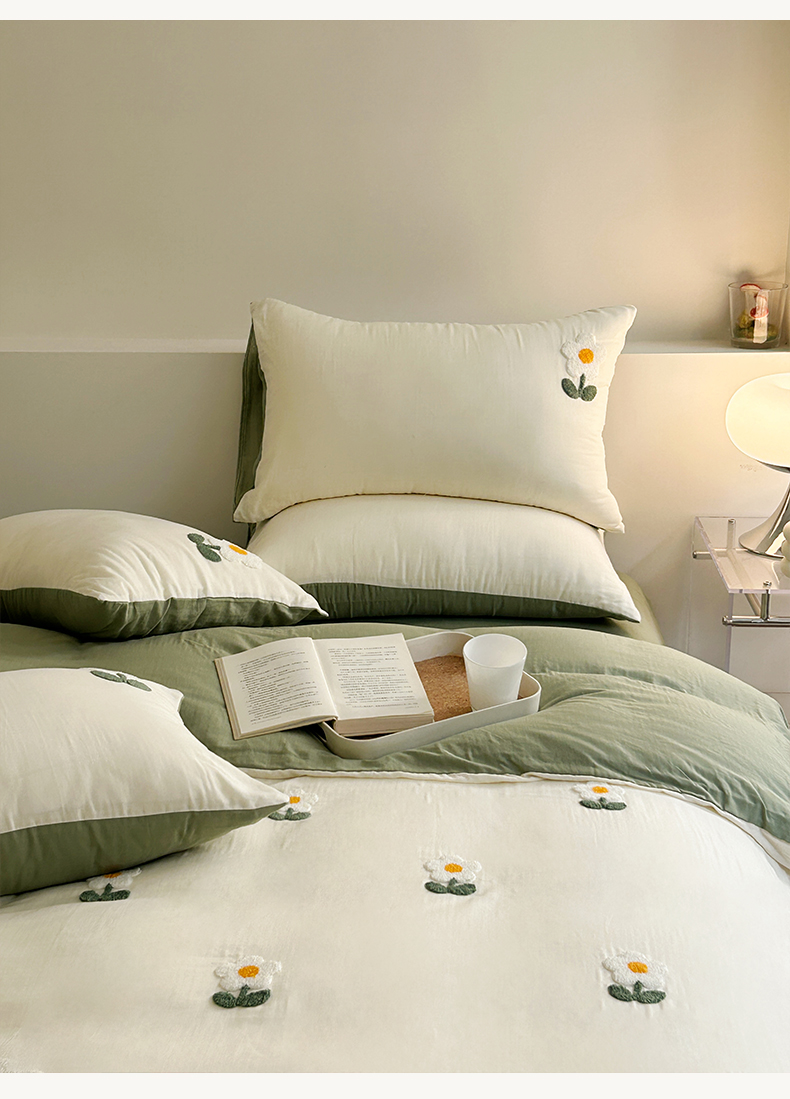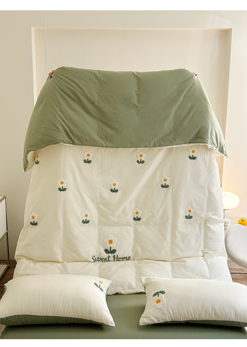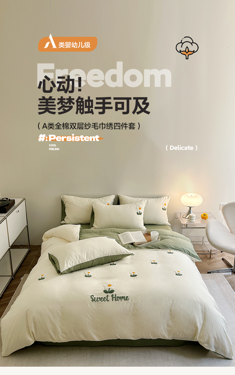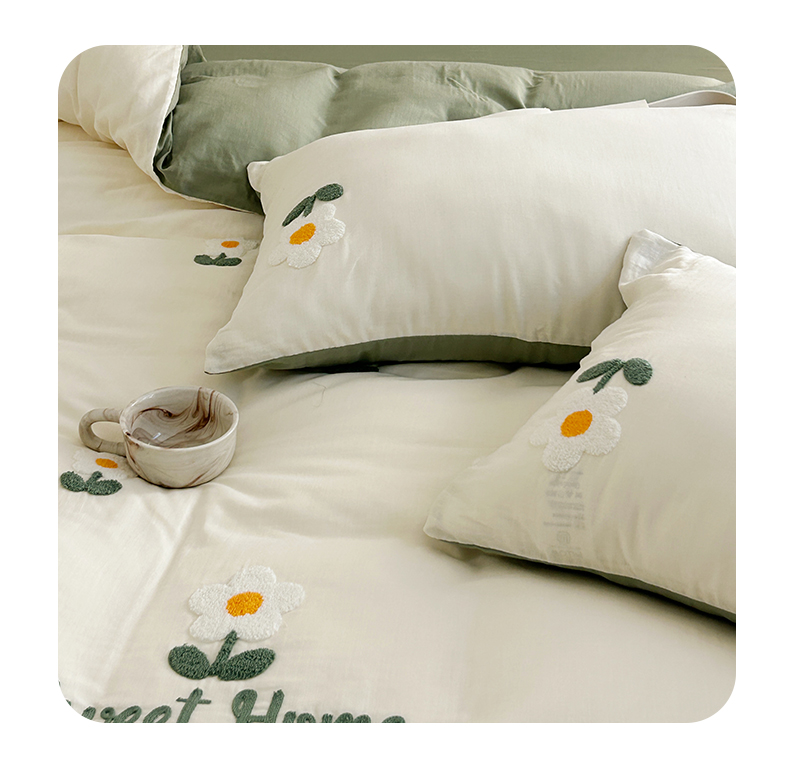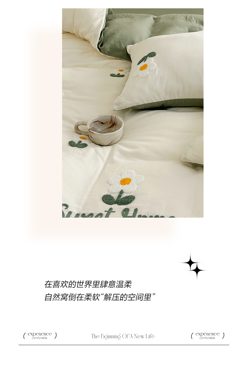 商品名称:雅居纺家纺 2023新款全棉A类双层纱毛巾绣四件套 向阳花