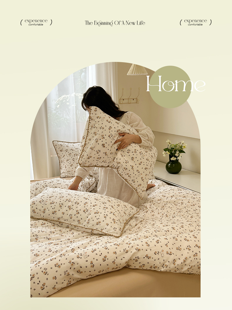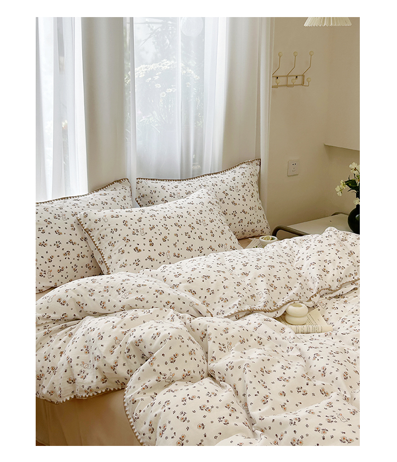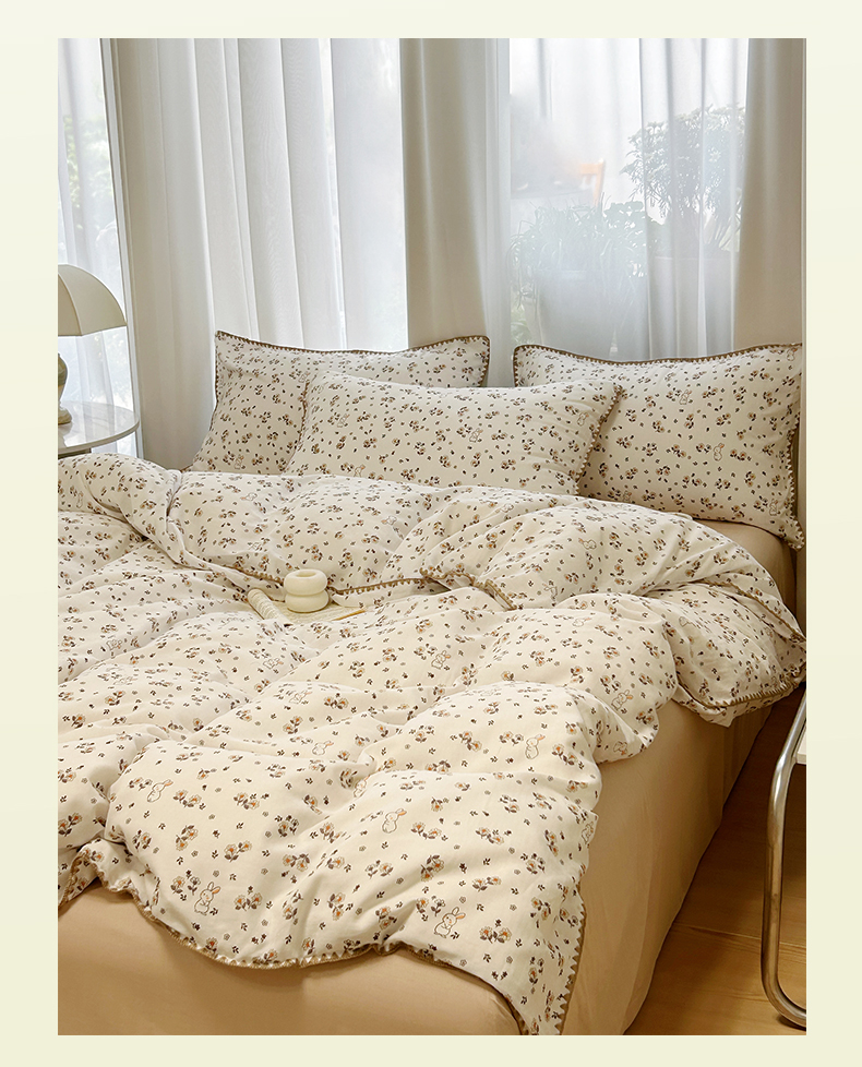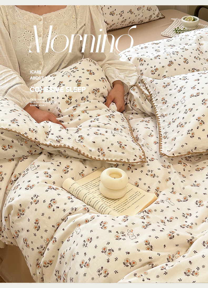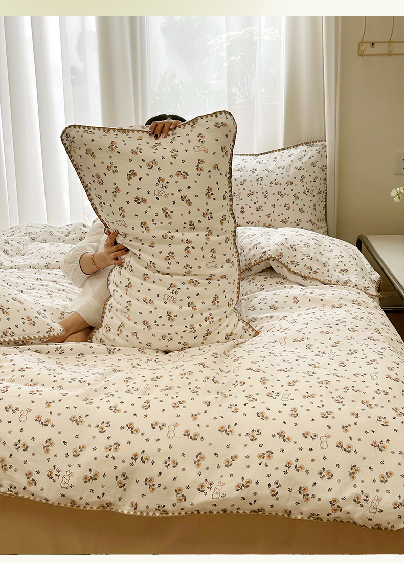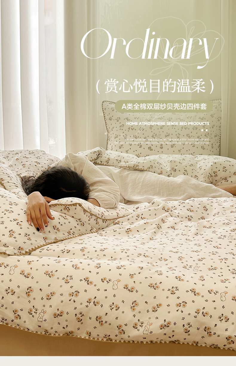 雅居纺家纺 2023新款全棉A类双层纱贝壳边四件套 花丛兔