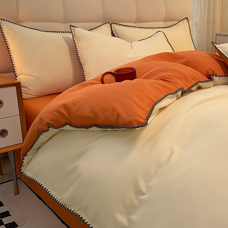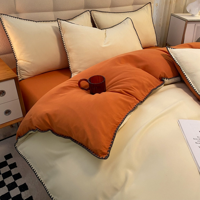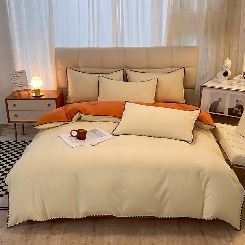 妖妖家纺 2023新款水洗棉贝壳边纯色三角针四件套 浅黄+焦糖
