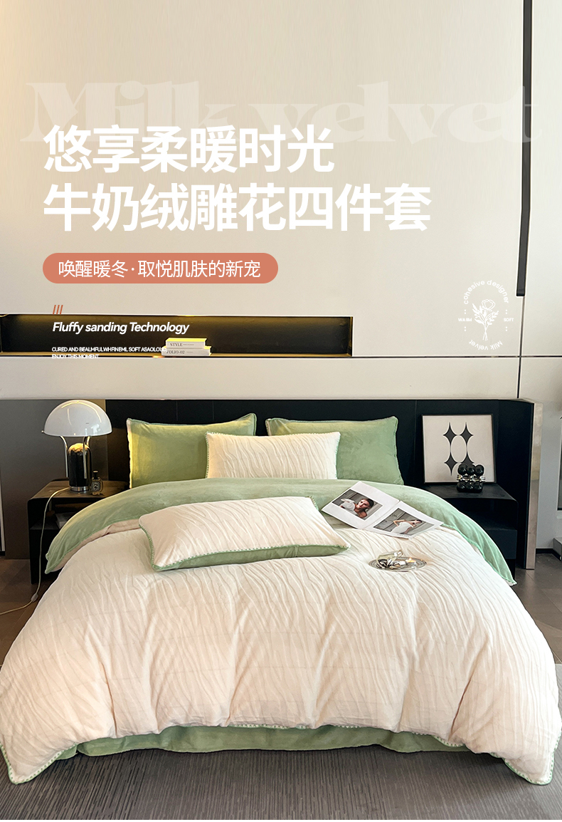 (总)澳梵 2023新款雕花牛奶绒四件套,冬日花信-嫩绿,冬日花信-粉,巴洛特-嫩黄,巴洛特-草绿,浪漫花都-灰,浪漫花都-白,浪漫花都-粉,玫瑰庄园-米黄,玫瑰庄园-绿,玫瑰庄园-蓝