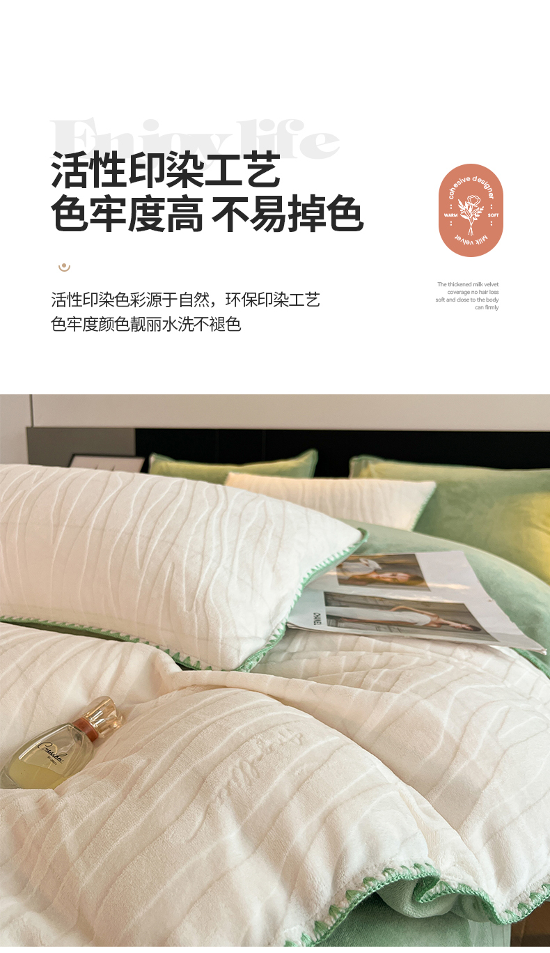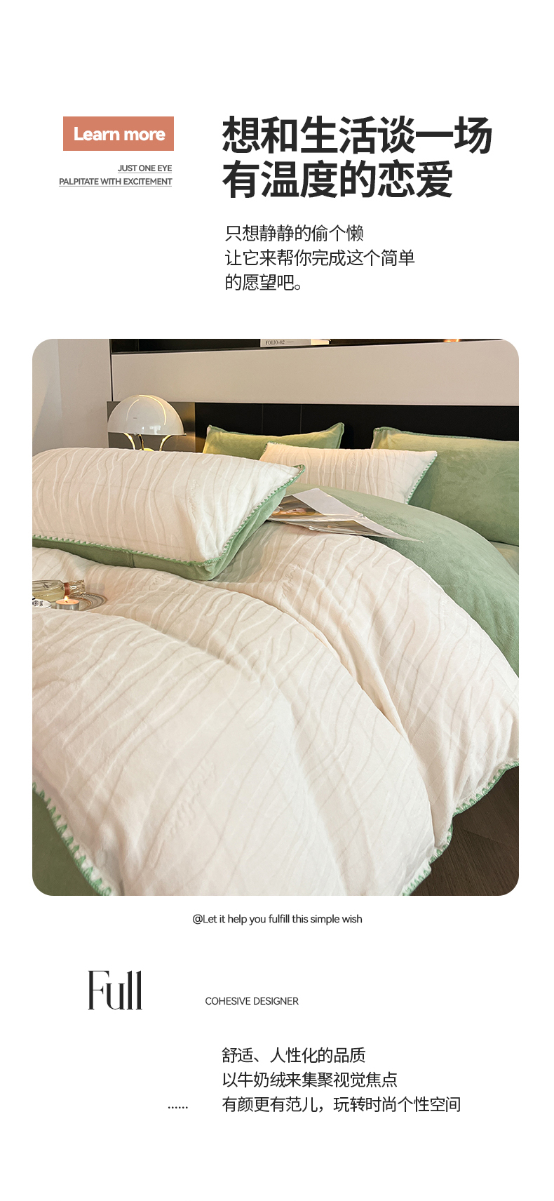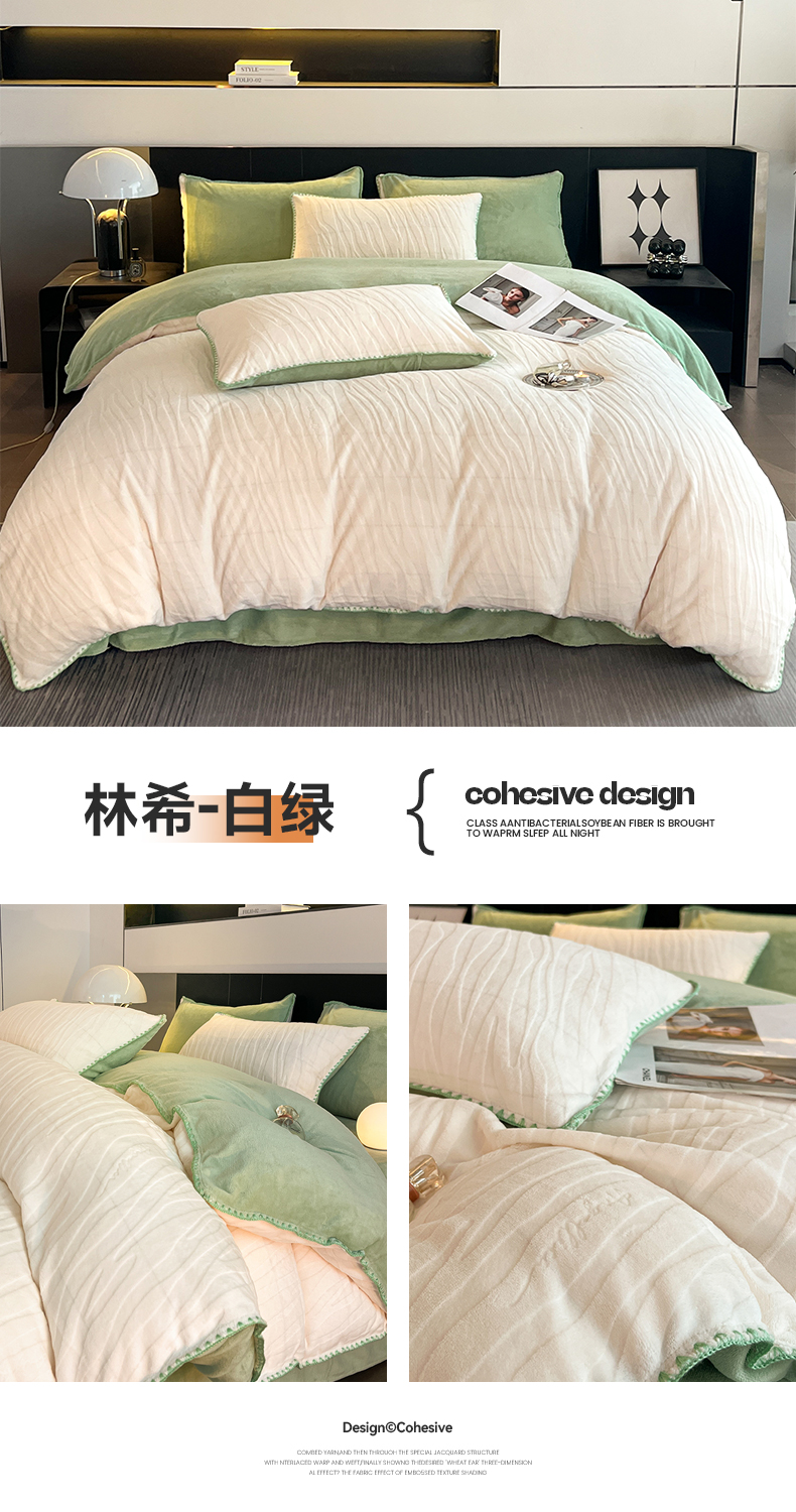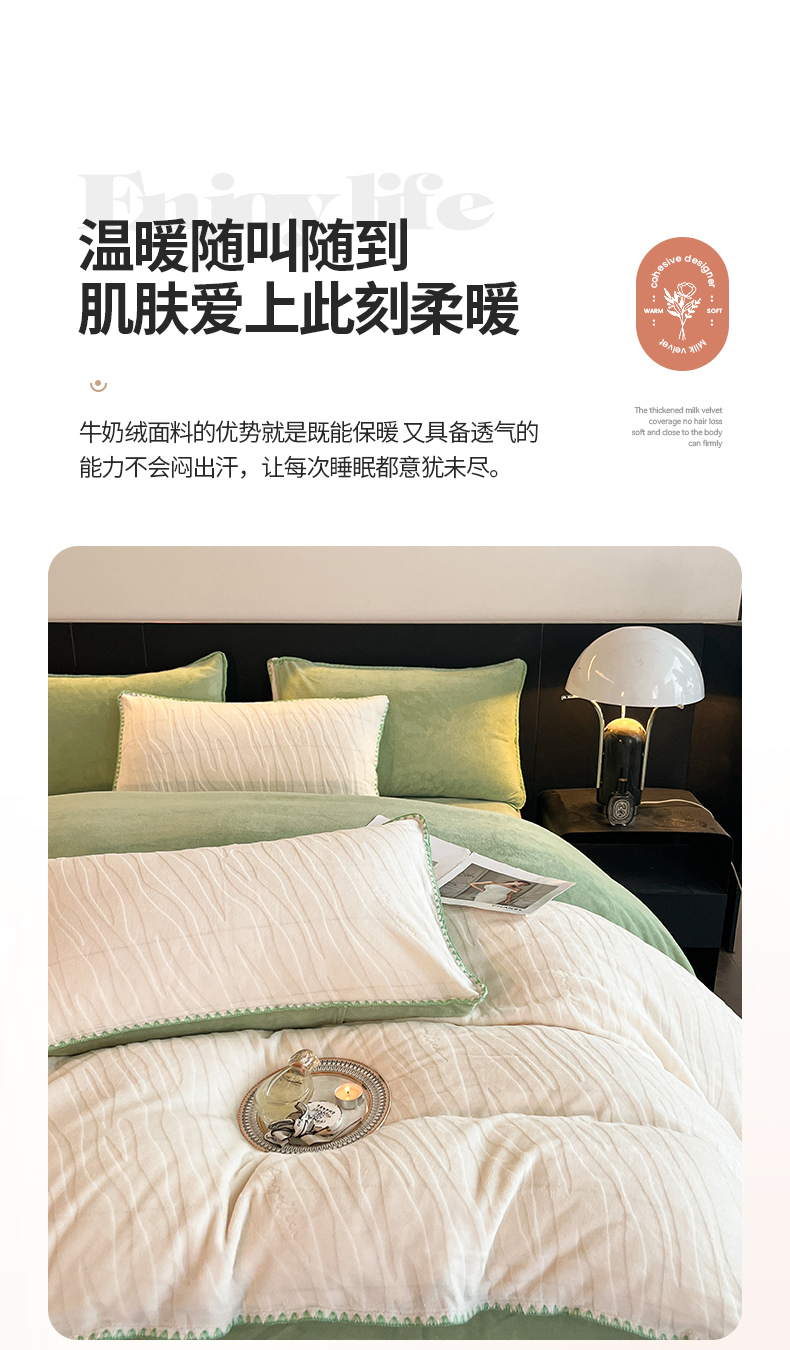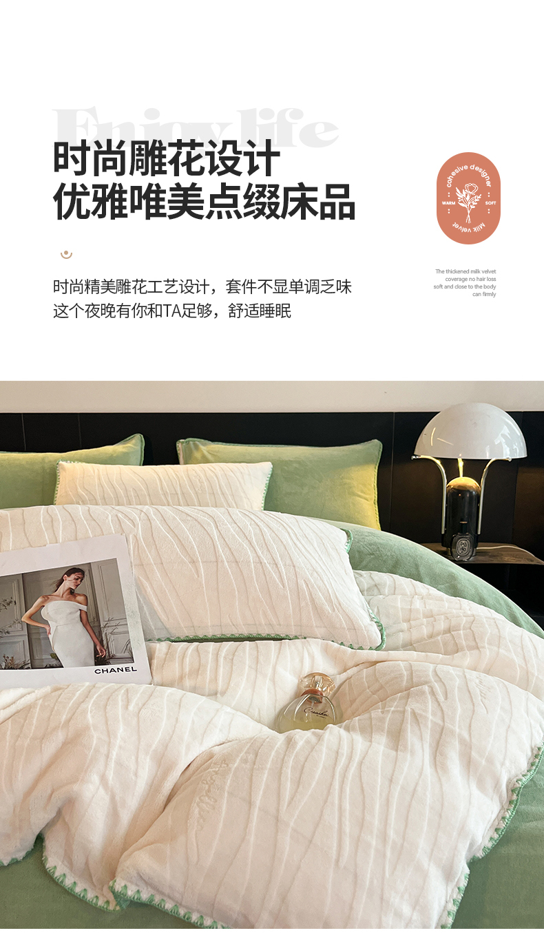 商品名称:澳梵 2023新款雕花牛奶绒贝壳边工艺四件套 林希-白绿