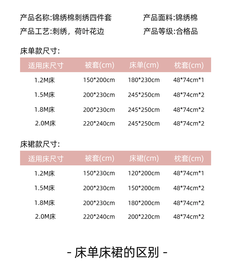 2.0m床裙款四件套(被套220X220CM 床裙200x220CM 枕套48X74CM 2只)