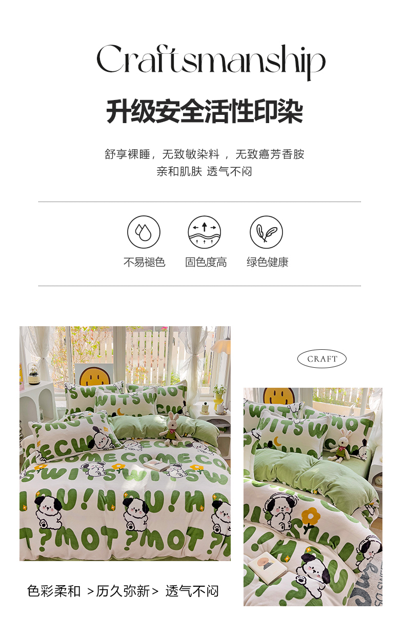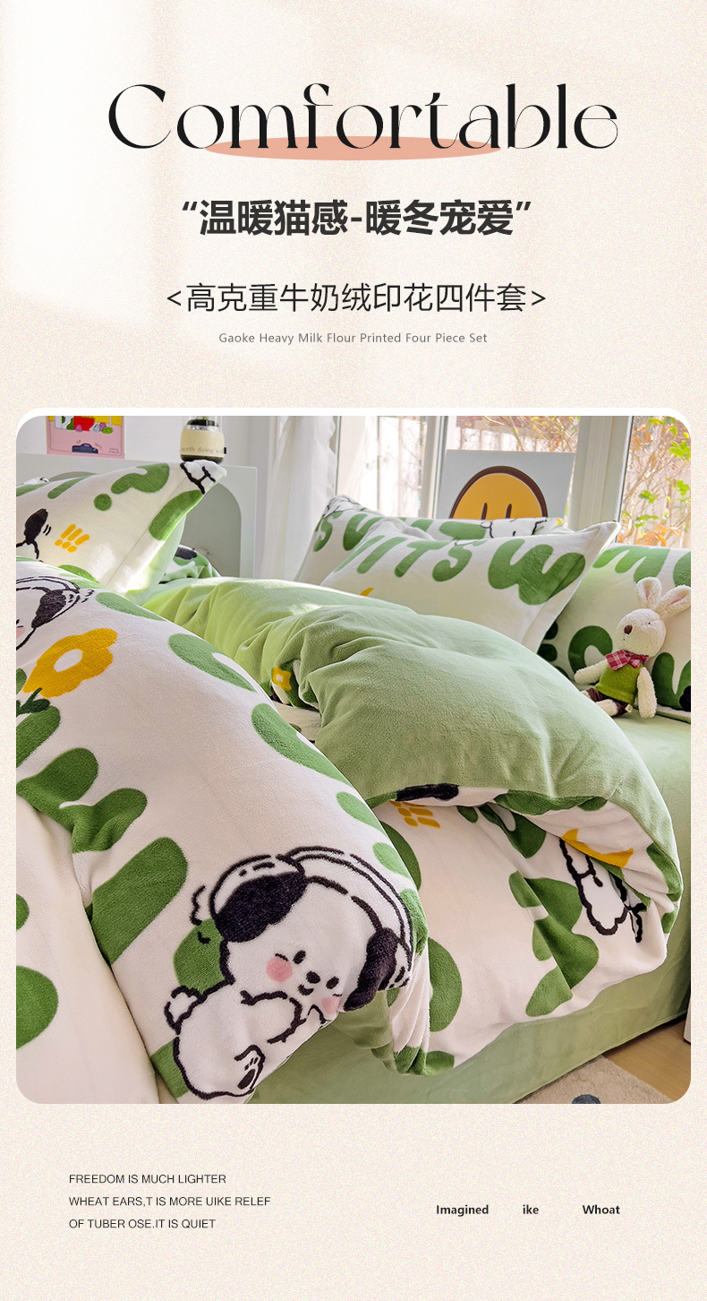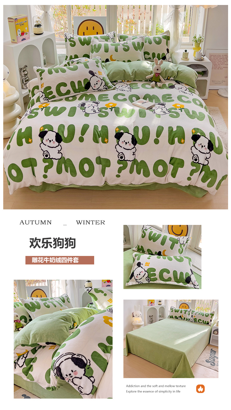 当前位置: 91家纺网 > 商品网购 > 床品套件 > 四件套 > 牛奶绒四件套 > 包小包 2023直播爆款220g高克重印花小清新牛奶绒四件套 欢乐狗狗