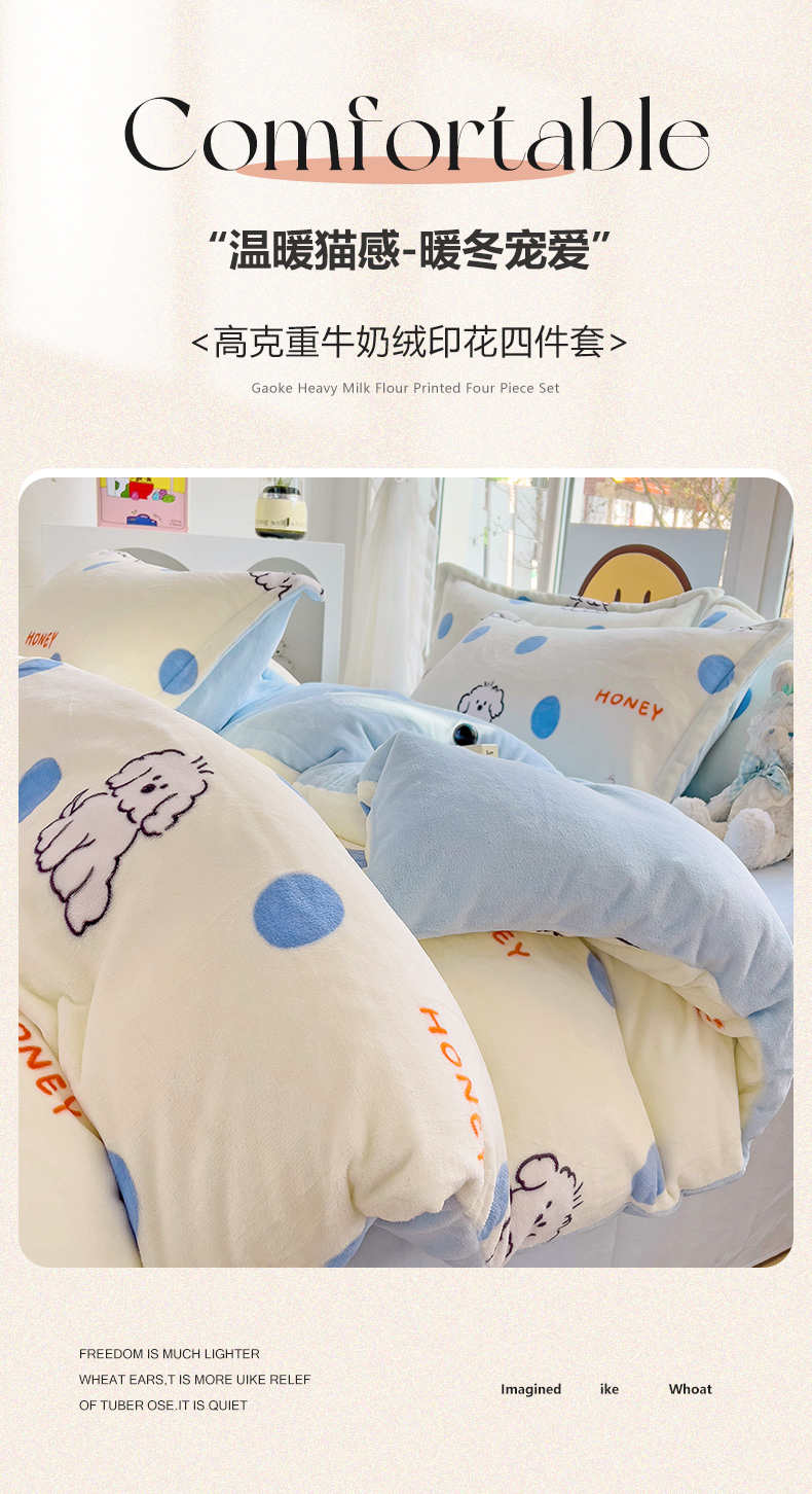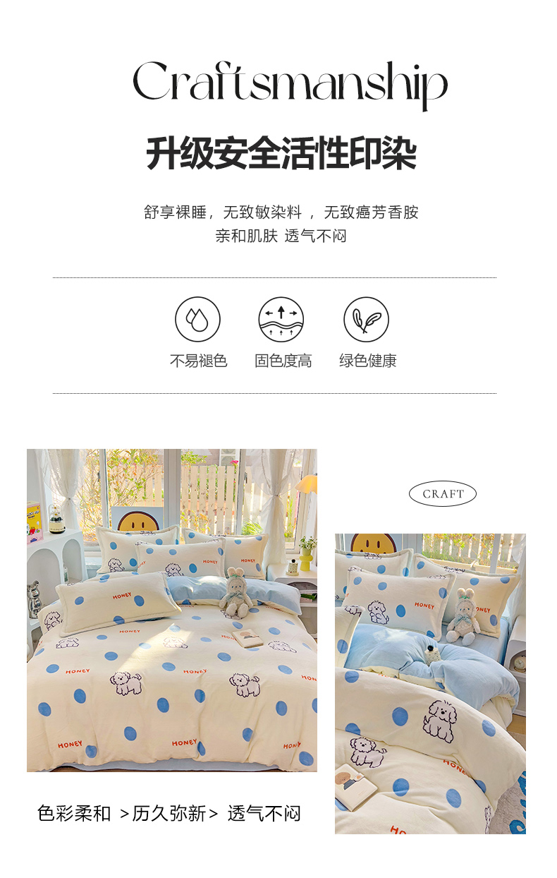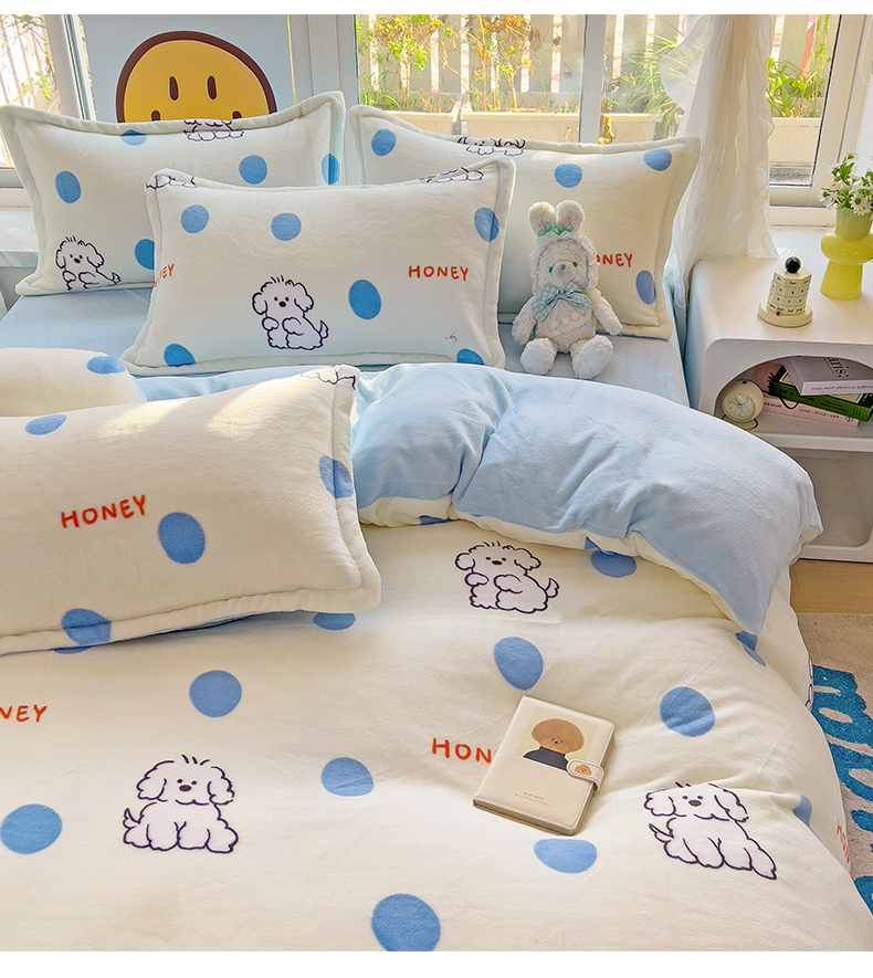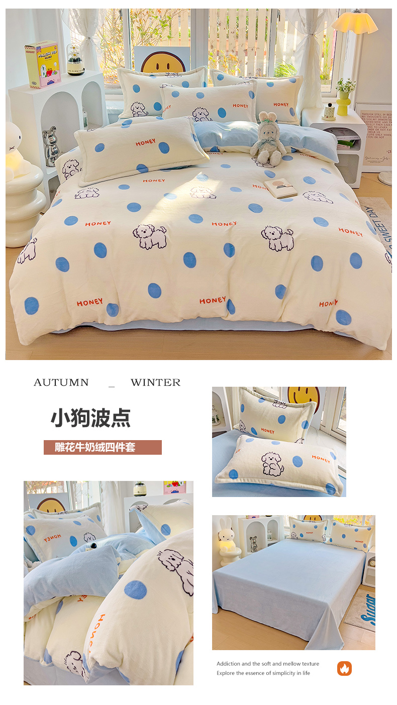 当前位置: 91家纺网 > 商品网购 > 床品套件 > 四件套 > 牛奶绒四件套 > 包小包 2023直播爆款220g高克重印花小清新牛奶绒四件套 小狗波点