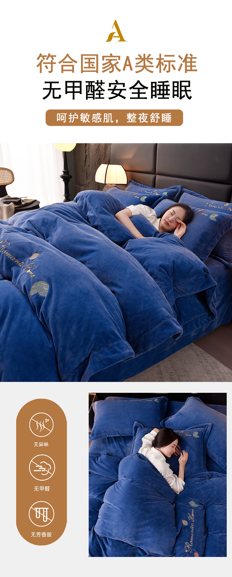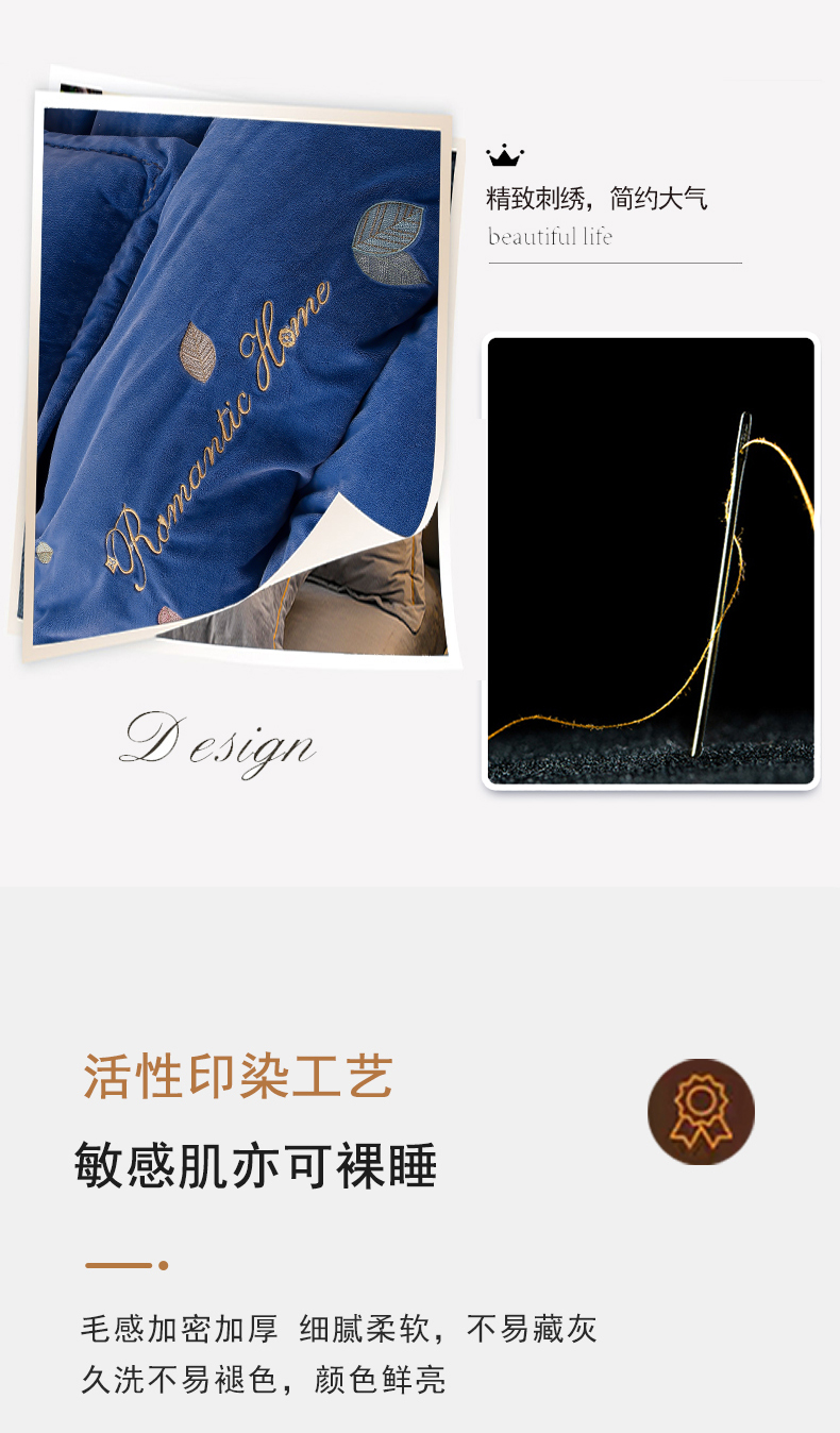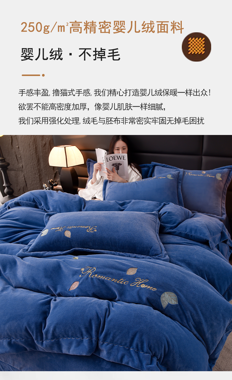 当前位置: 91家纺网 > 商品网购 > 床品套件 > 四件套 > 宝宝绒四件套 > 瑞驰家纺 2023新款A类达标加厚保暖婴儿绒四件套 艾丽莎系列 艾丽莎-宾利蓝