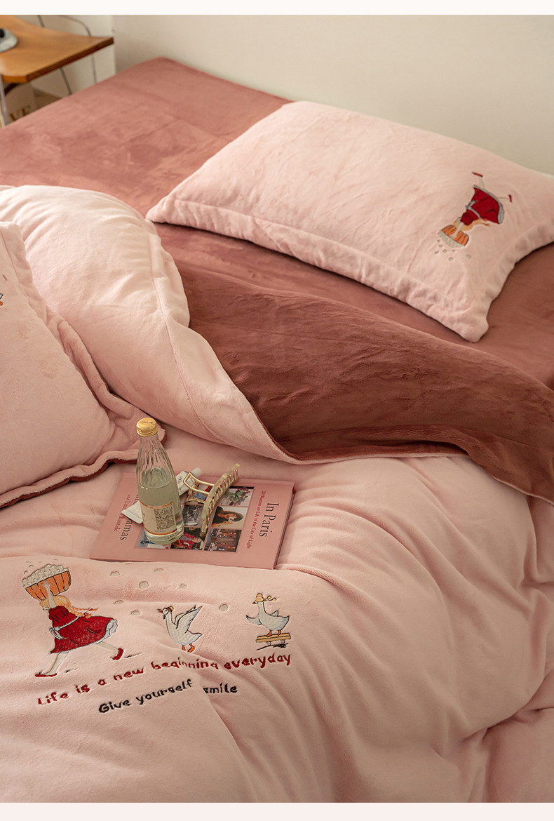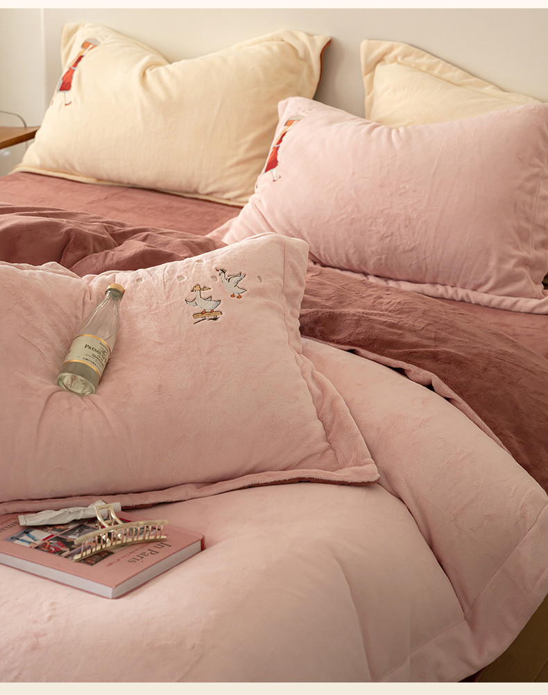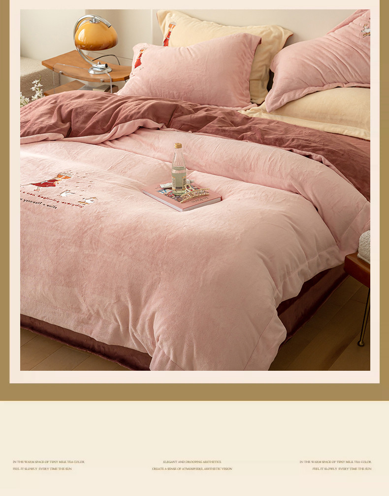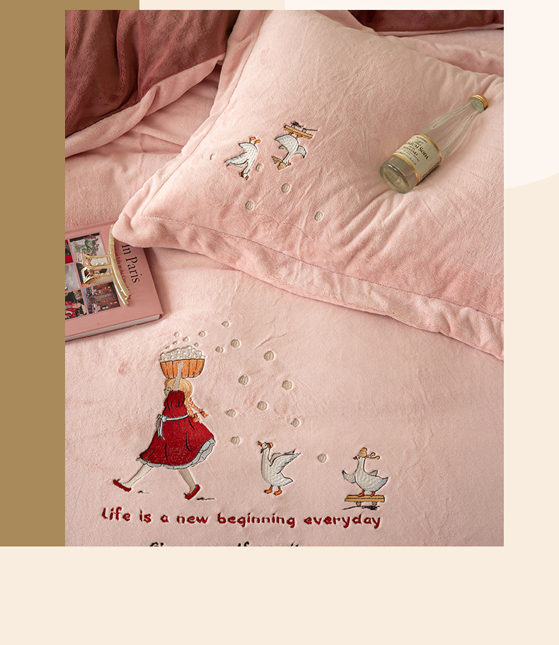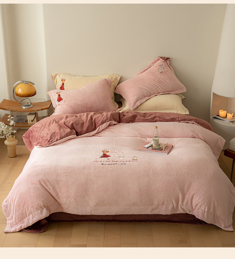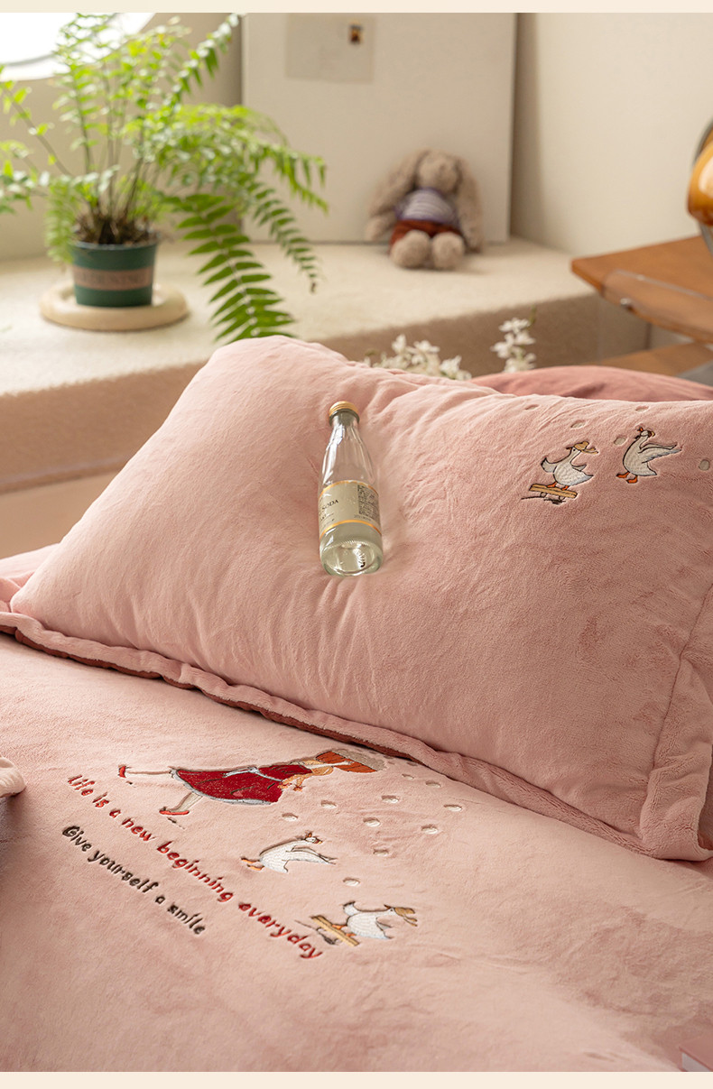 名品优仓 2023新款高克重牛奶绒绣花四件套-安吉拉 安吉拉-浅樱粉