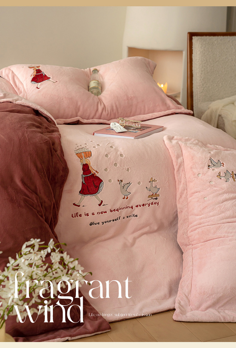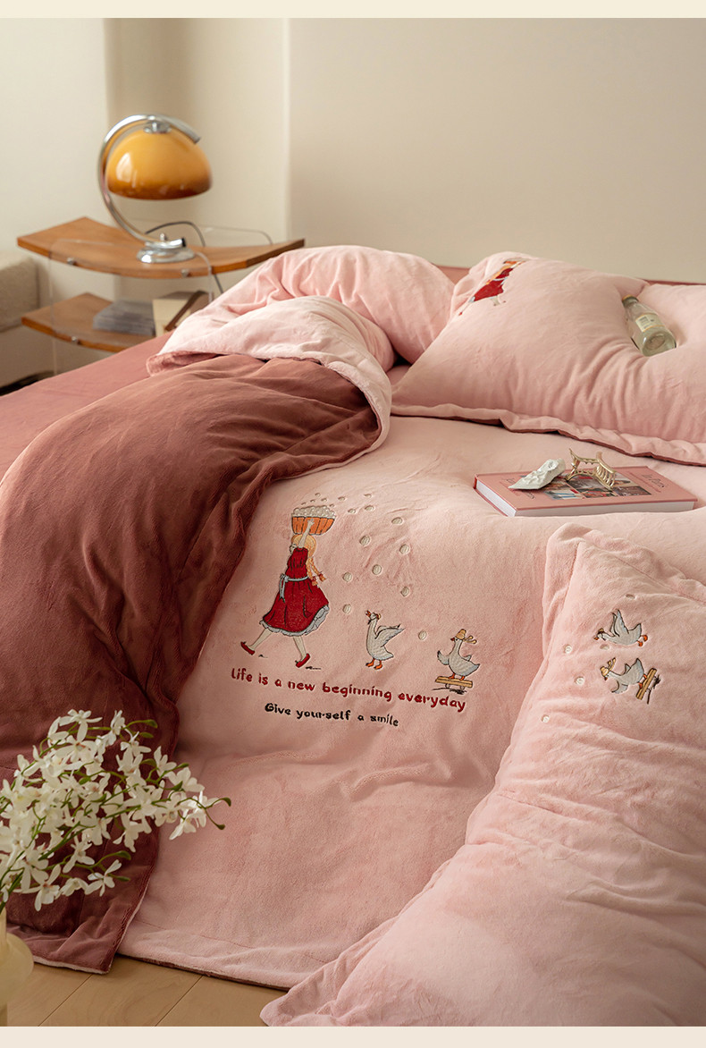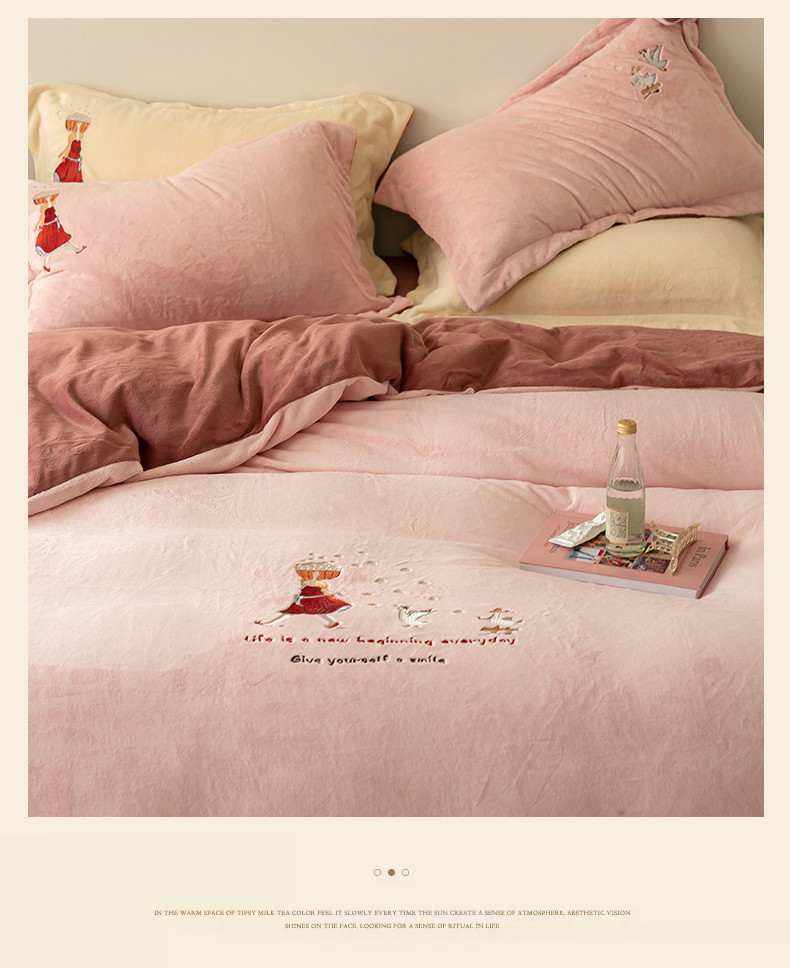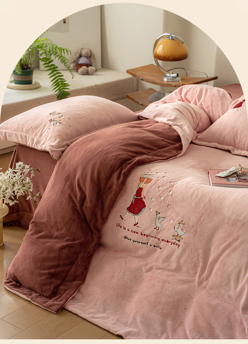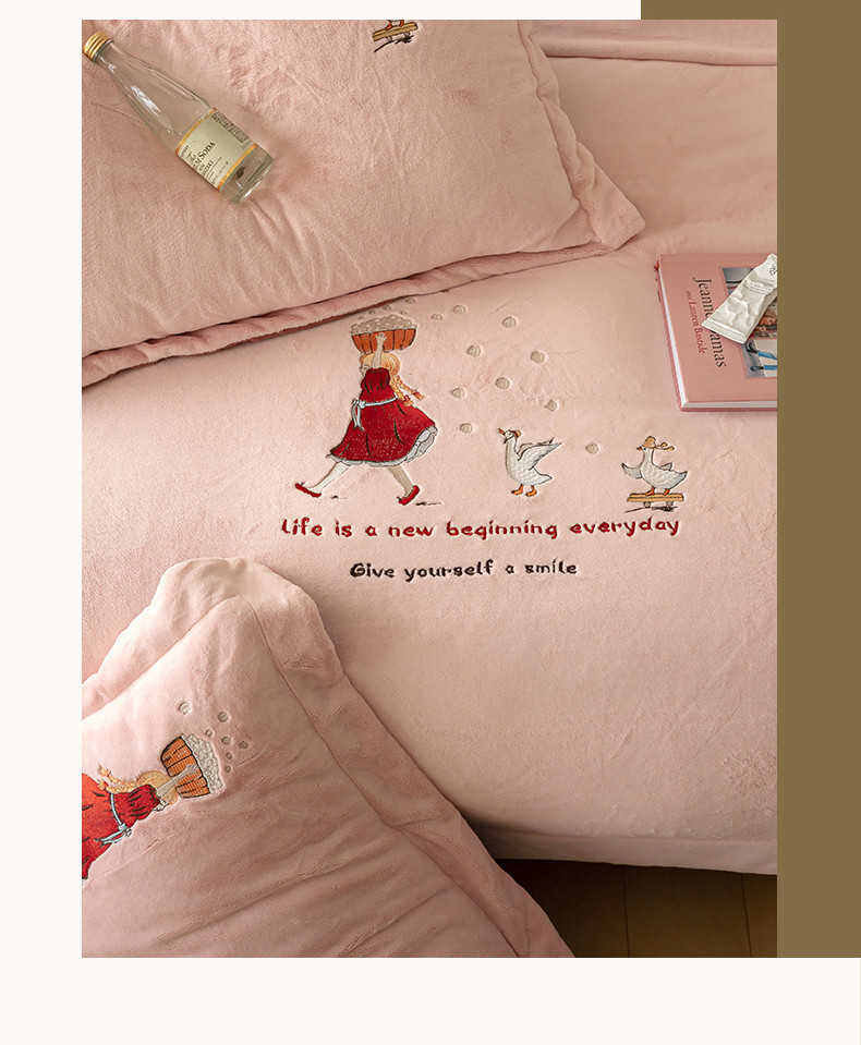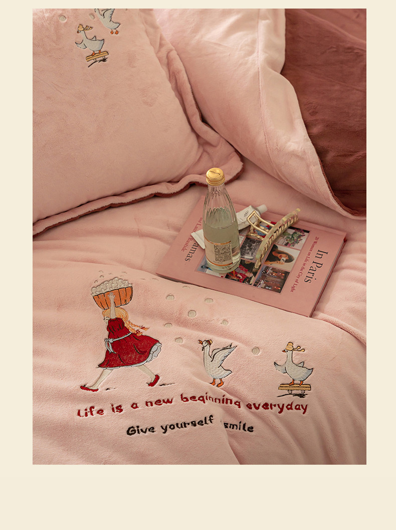 名品优仓 2023新款高克重牛奶绒绣花四件套-安吉拉 安吉拉-浅樱粉