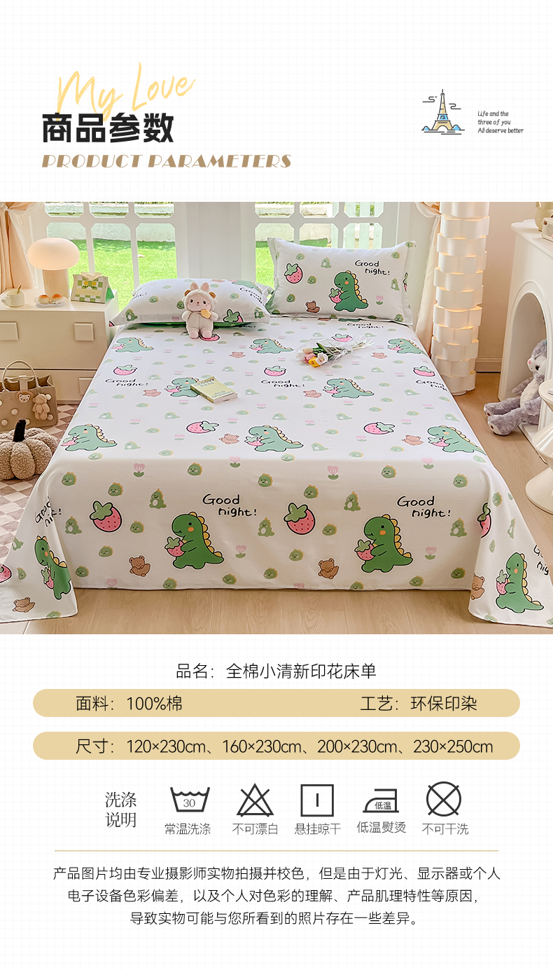 商品名称:绵庭家纺 2023新款12868系列全棉小清新印花单床单 恐龙贝贝