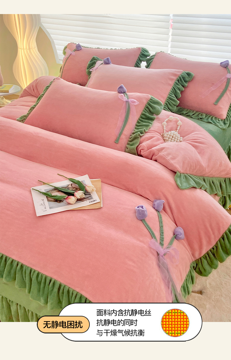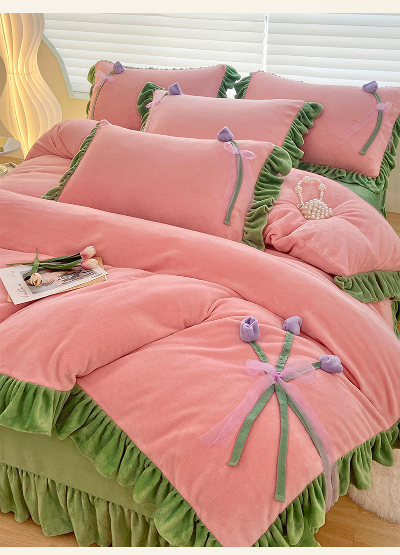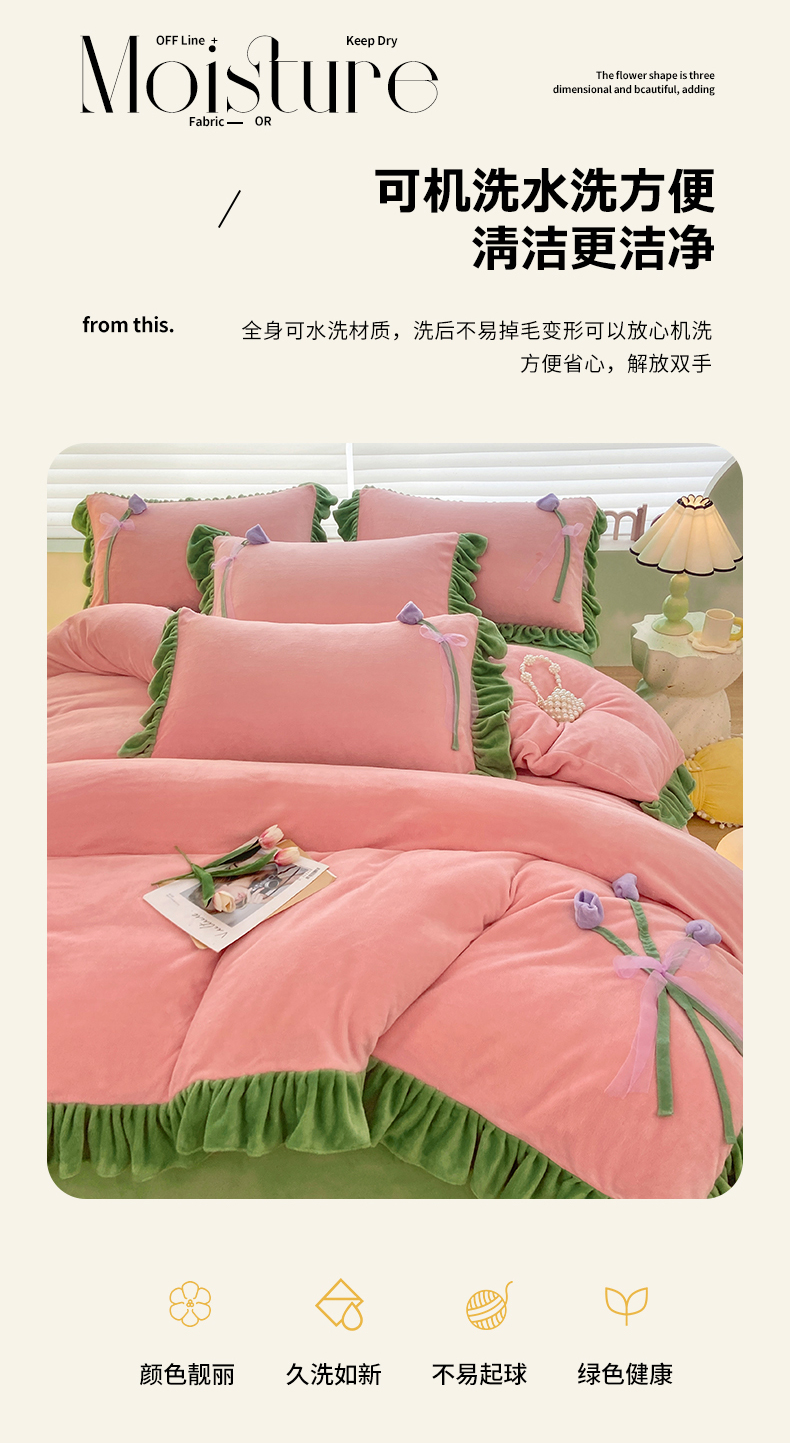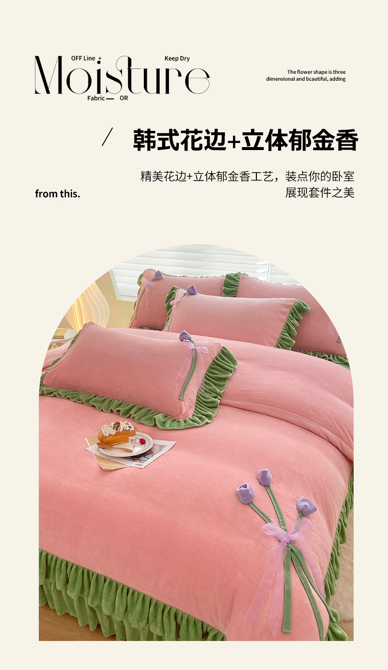 商品名称:言熙居 2024新款法莱绒牛奶绒高克重郁金香系列韩版四件套 郁金香粉