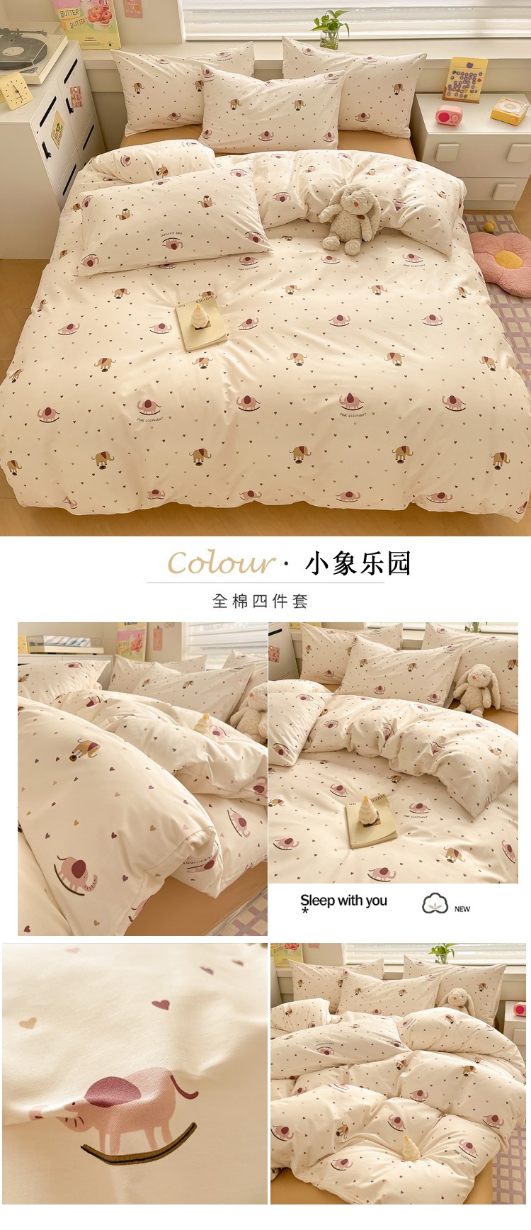 当前位置: 91家纺网 > 商品网购 > 床品套件 > 四件套 > 全棉普通四件套 > 柠馨 2024新款全棉13376乖萌系列四件套(第六批) 小象乐园