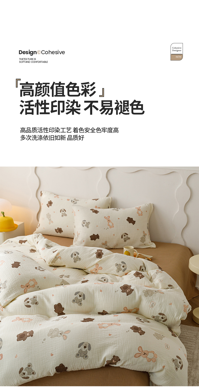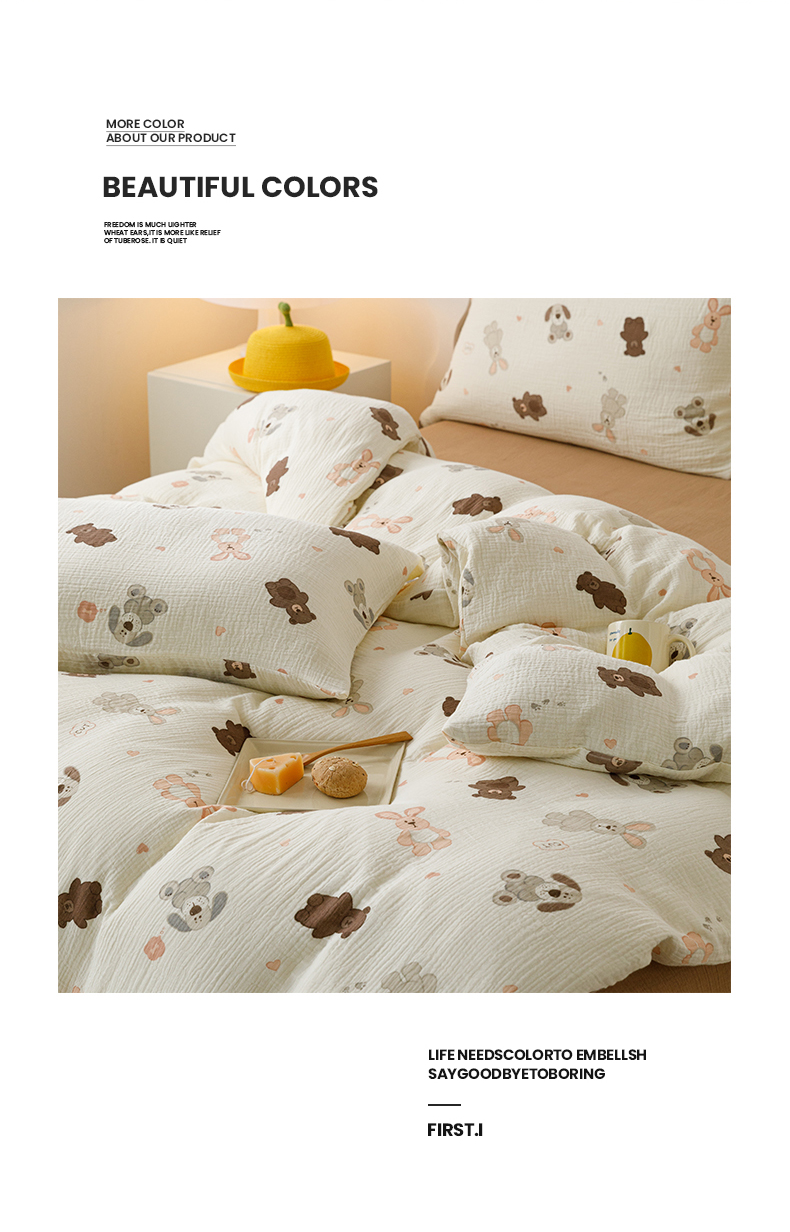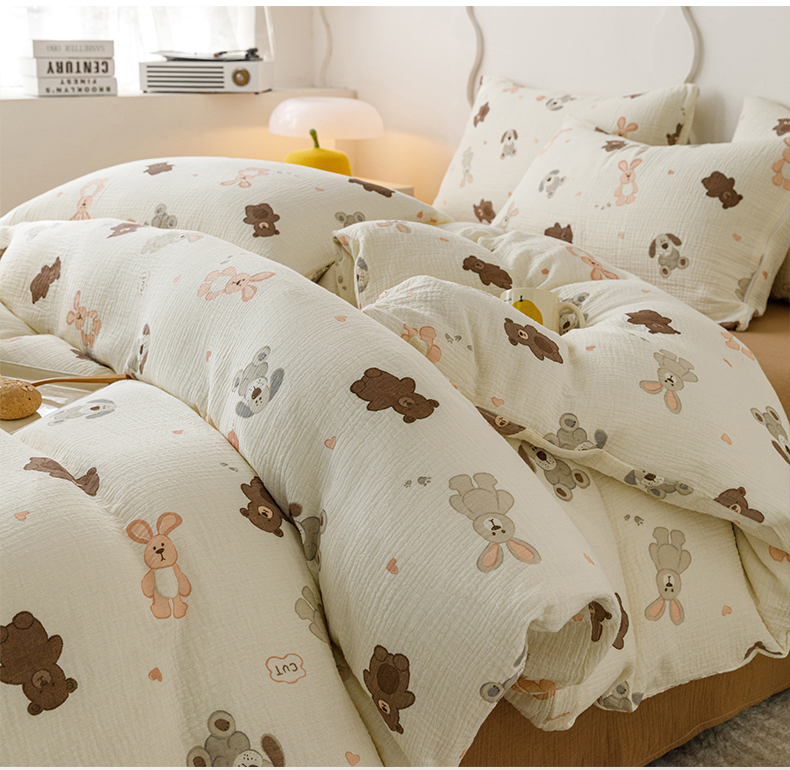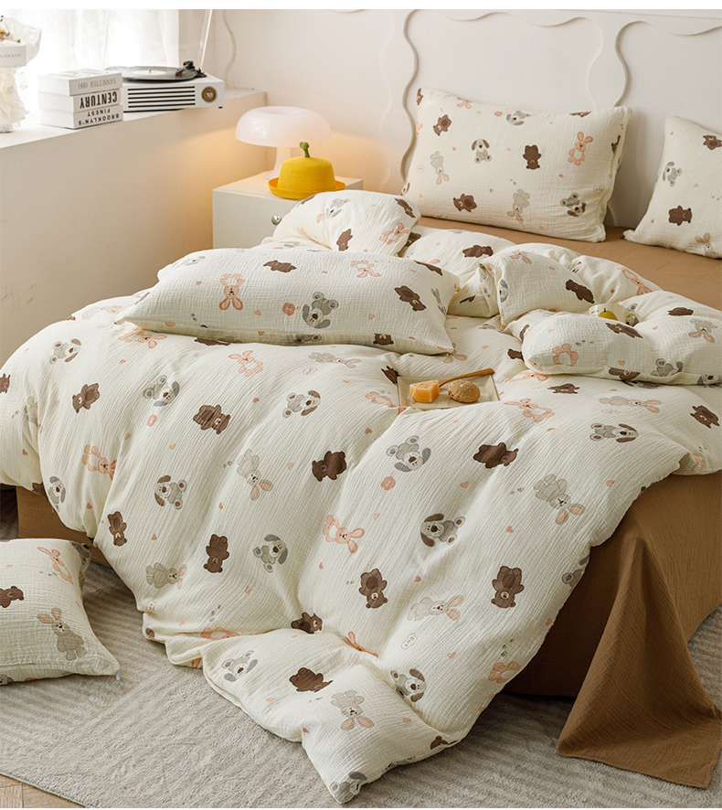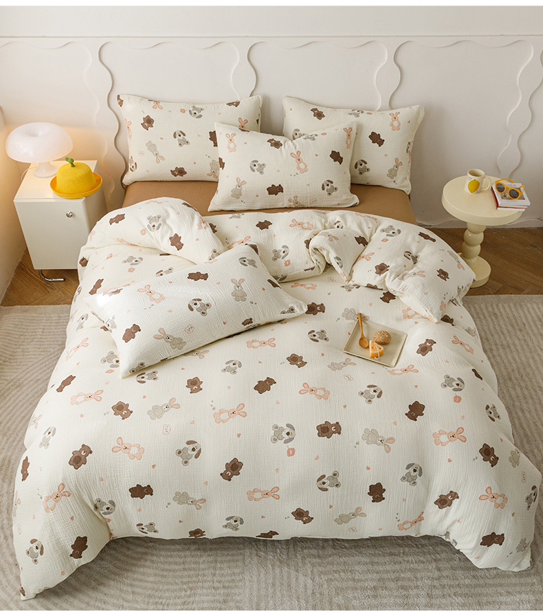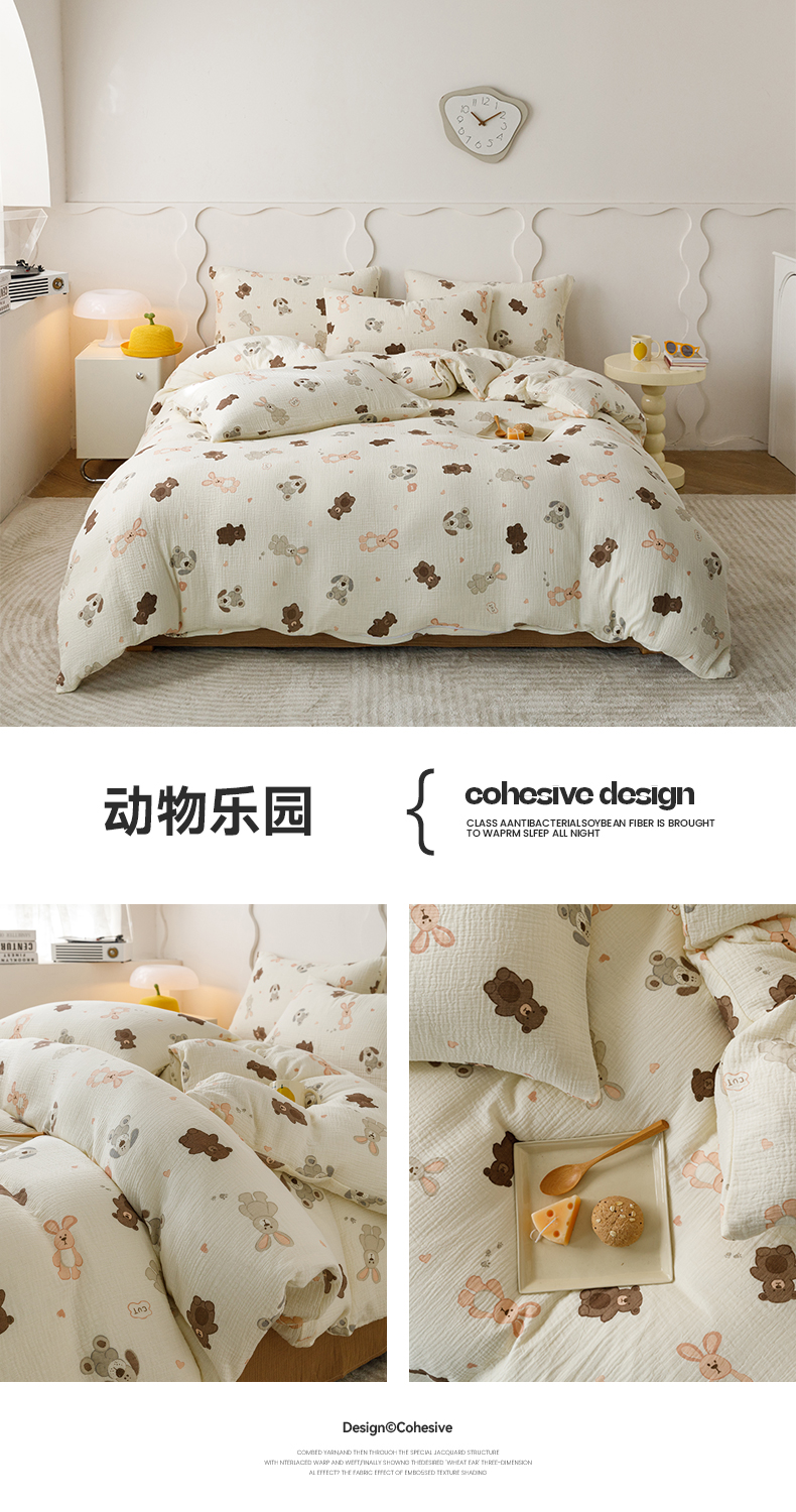 商品名称:蜜柚 2024新款全棉双层皱皱纱四件套 动物乐园