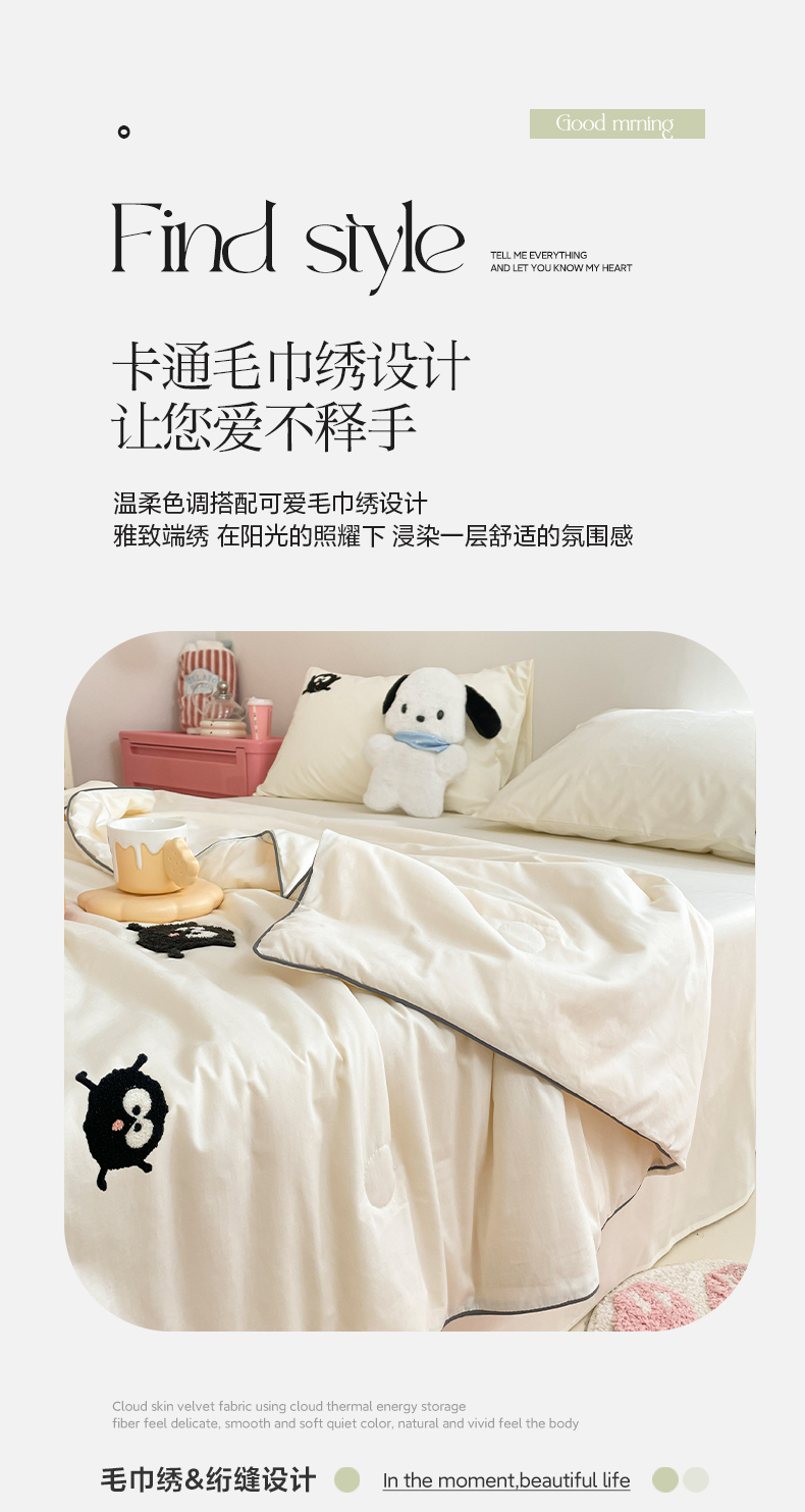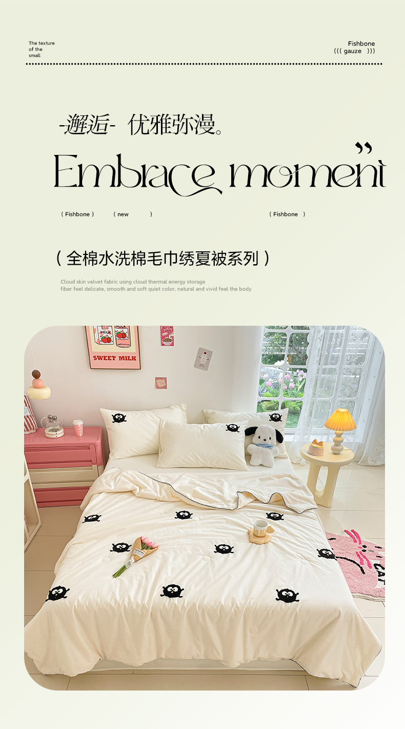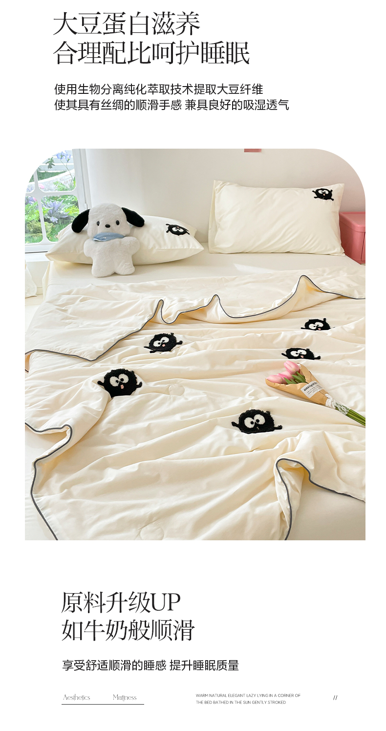 当前位置: 91家纺网 > 商品网购 > 被子 > 夏被 > 莱登卡奴 2025春夏款全棉水洗棉毛巾绣大豆夏被 可爱煤球