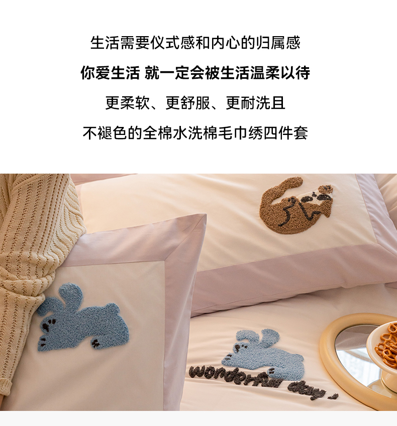 (总)名品优仓2023新款毛巾绣撞色荷叶边四件套,拾光兔,铃兰花开,爱丽兔,太阳花清爽绿,太阳花芝芝奶绿,兔然暴富