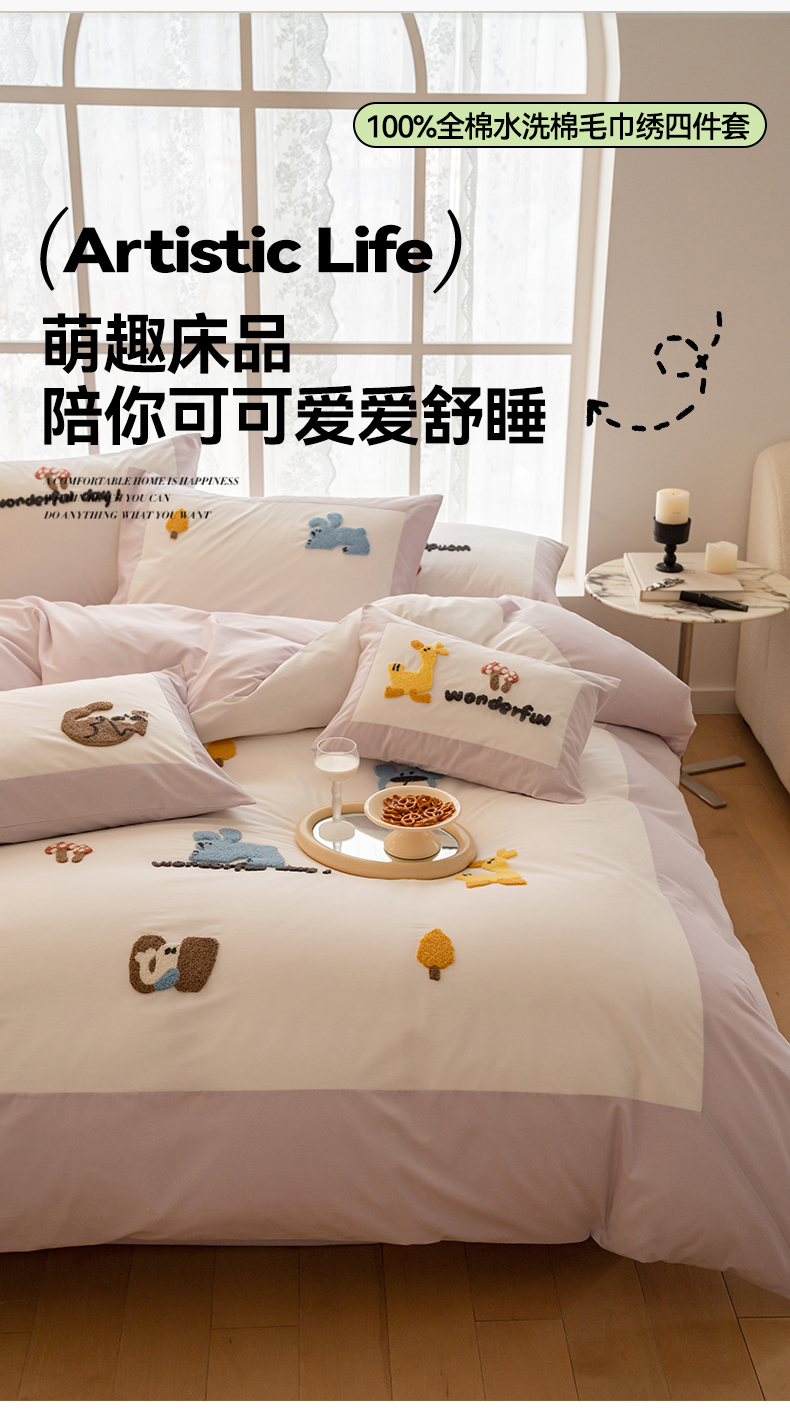 名品优仓 2023新款水洗棉毛巾绣撞边款式四件套-玫瑰熊 风信子-玲月白,风信子-玲月白