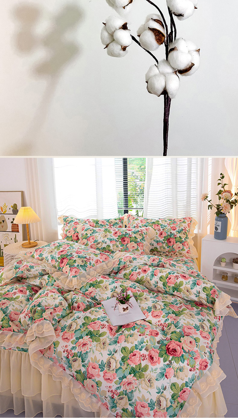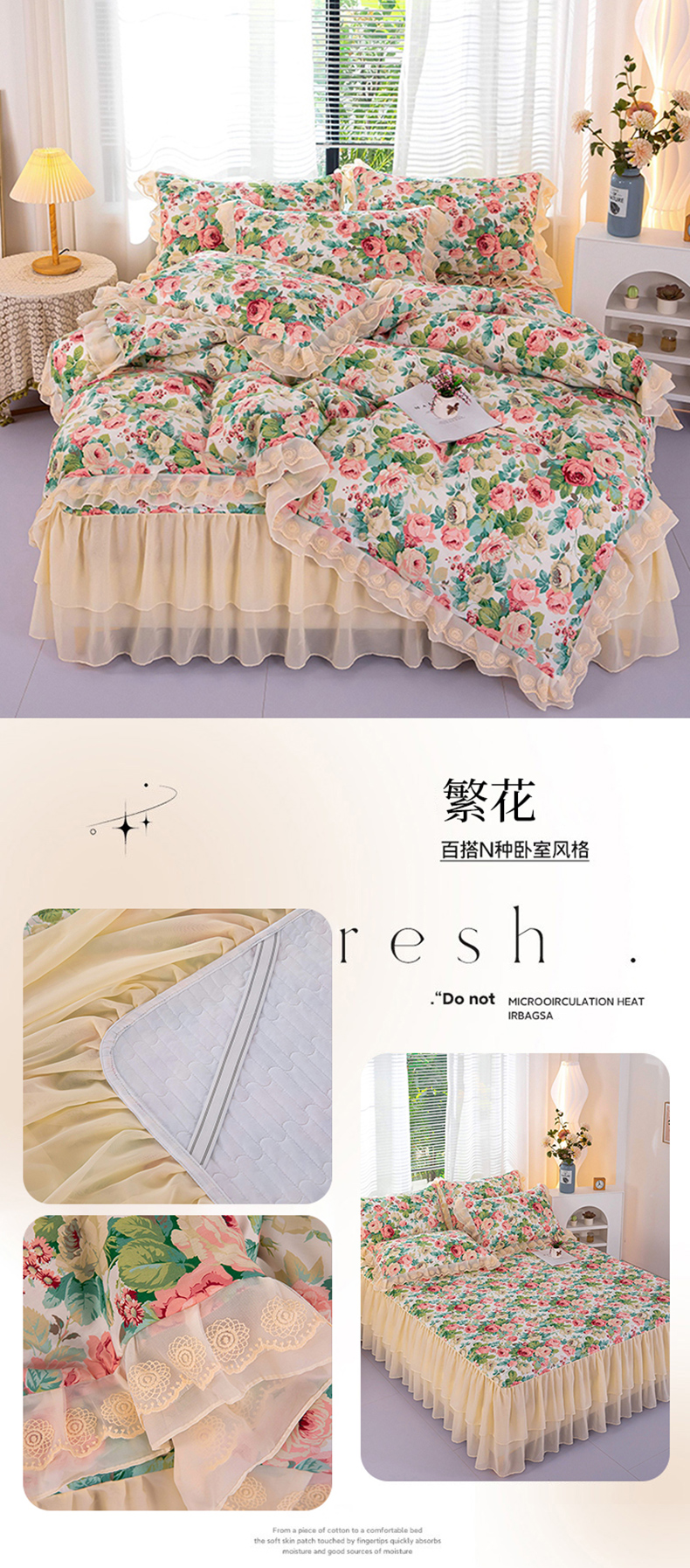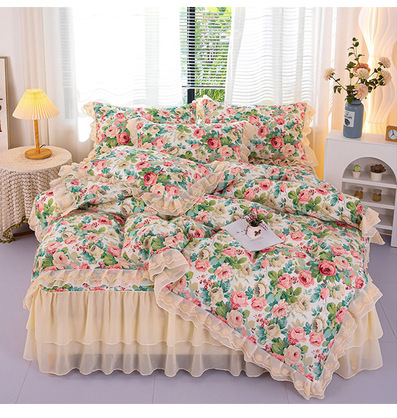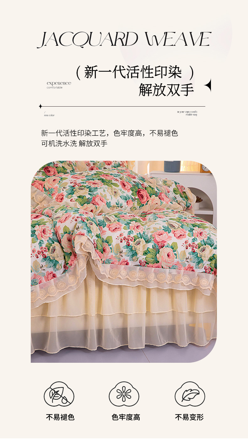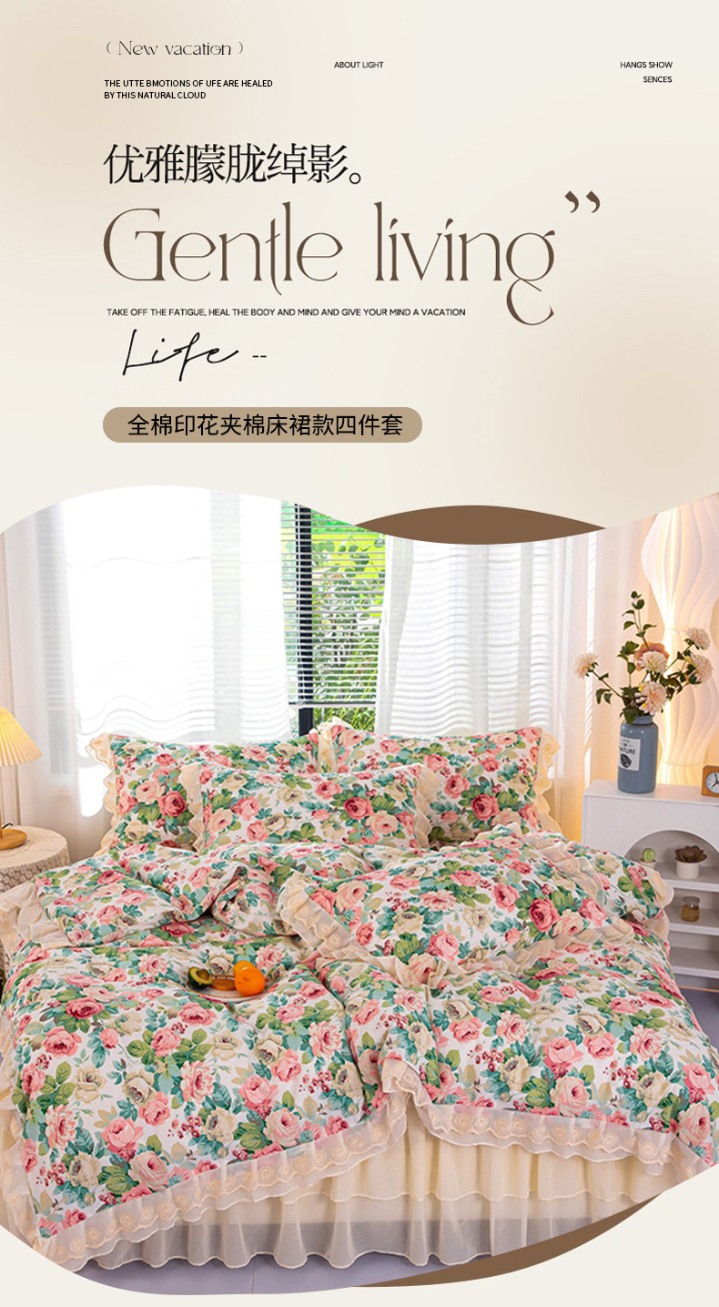 当前位置: 91家纺网 > 商品网购 > 床品套件 > 四件套 > 全棉普通四件套 > 木兰花 2024新款全棉印花被套蕾丝夹棉床裙款四件套 繁花