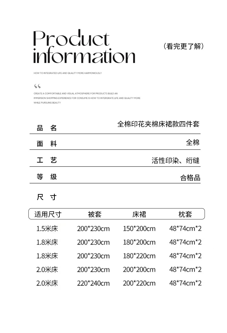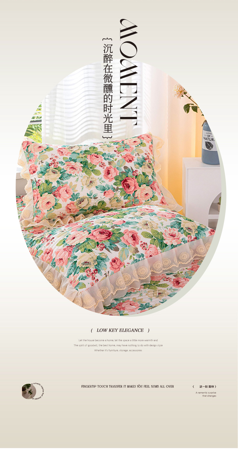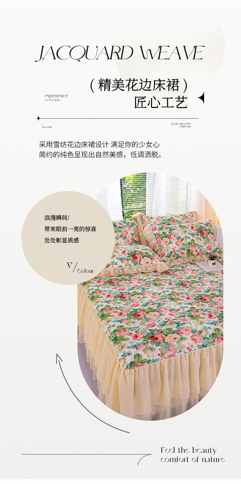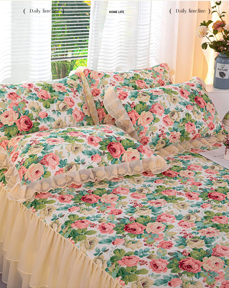 当前位置: 91家纺网 > 商品网购 > 床品套件 > 四件套 > 全棉普通四件套 > 木兰花 2024新款全棉印花被套蕾丝夹棉床裙款四件套 繁花
