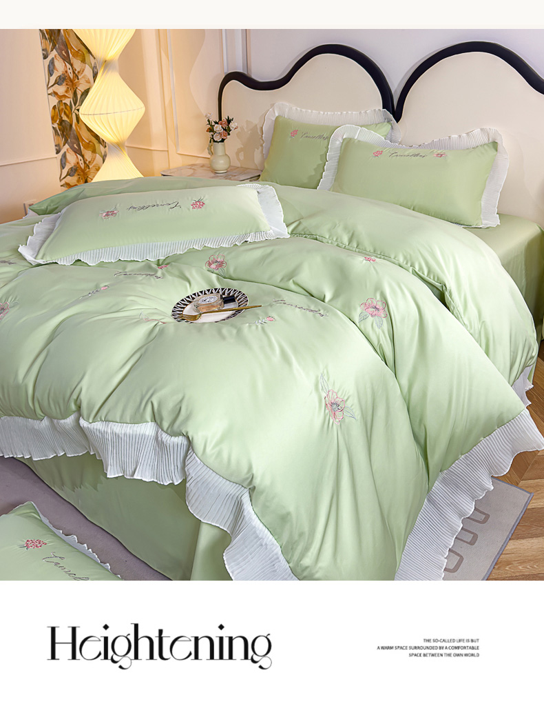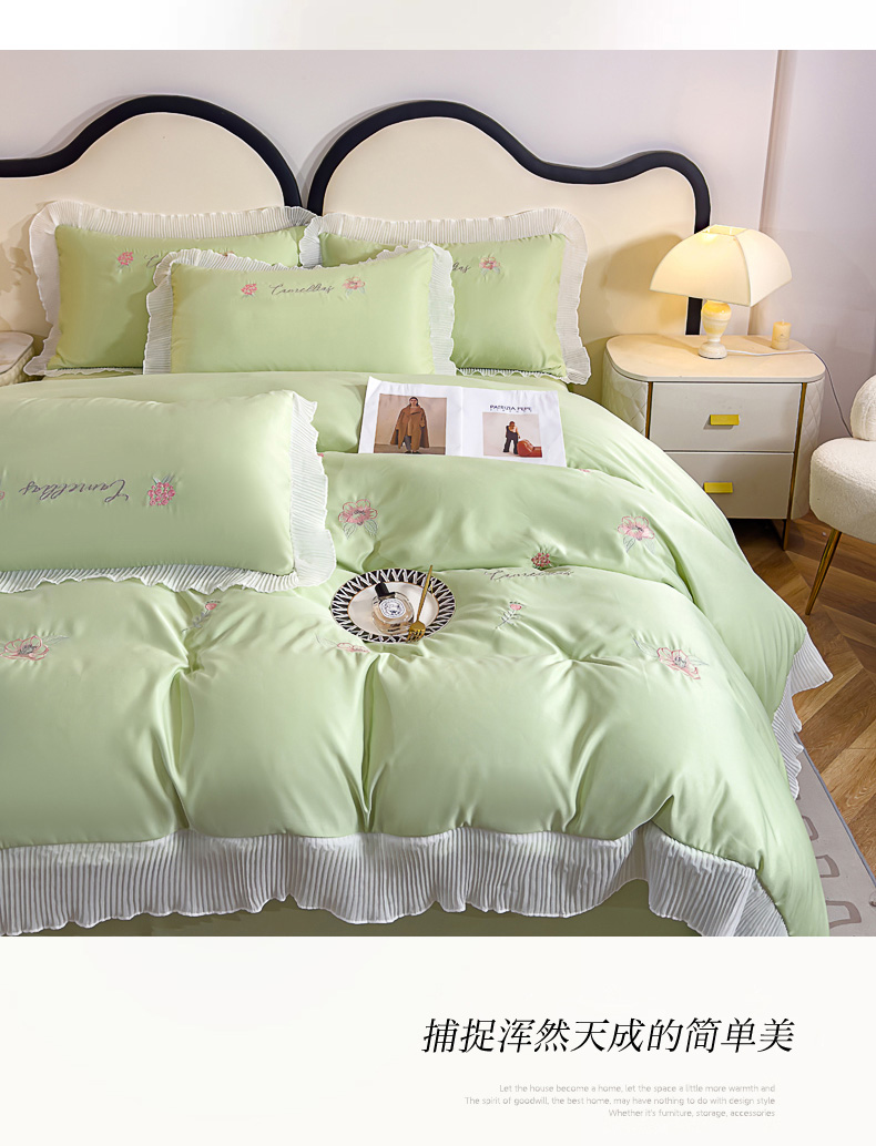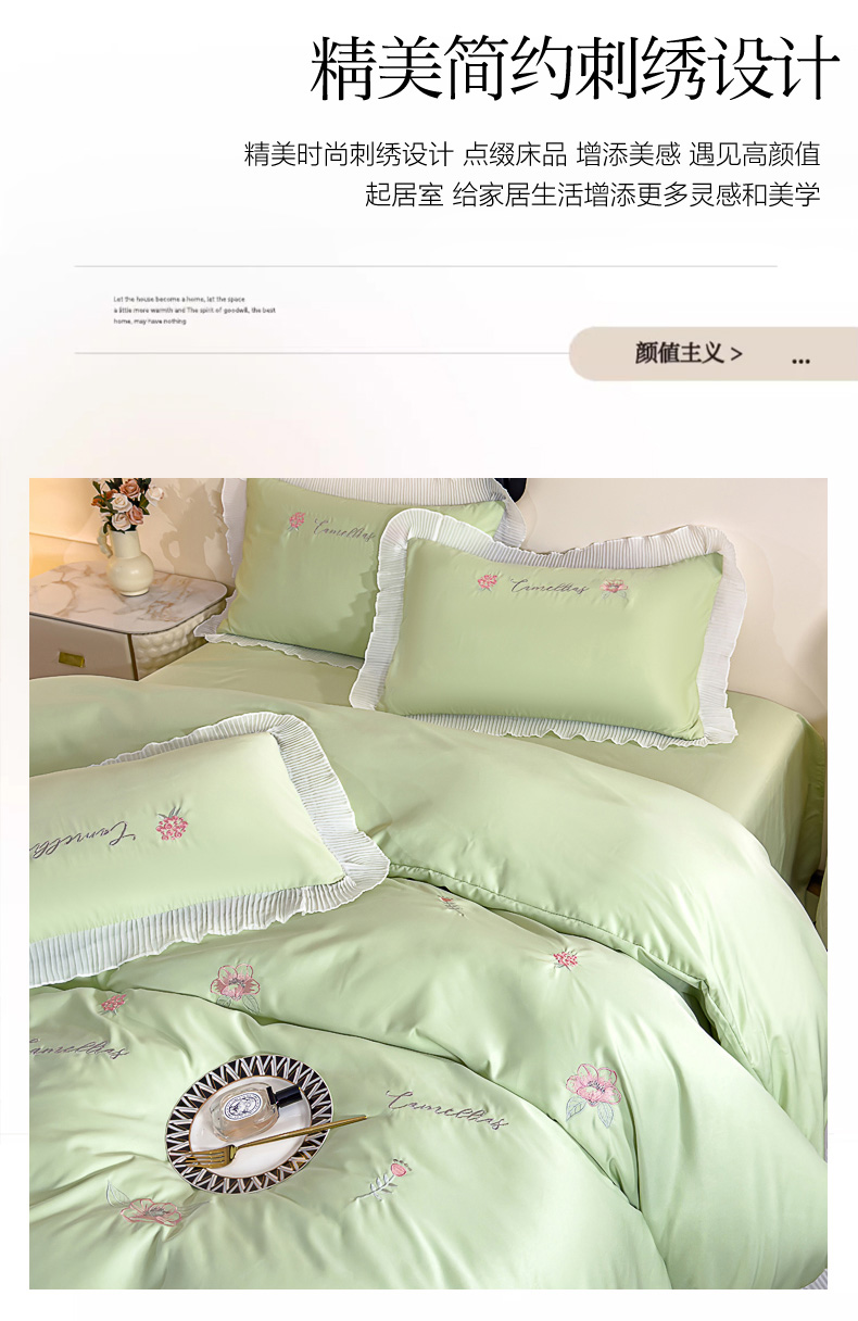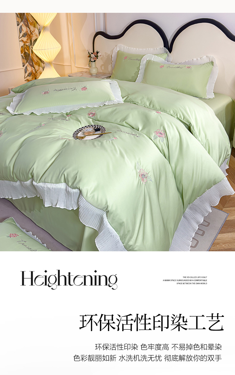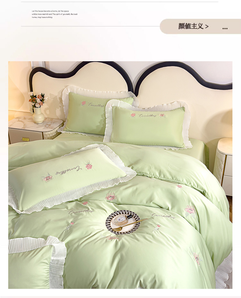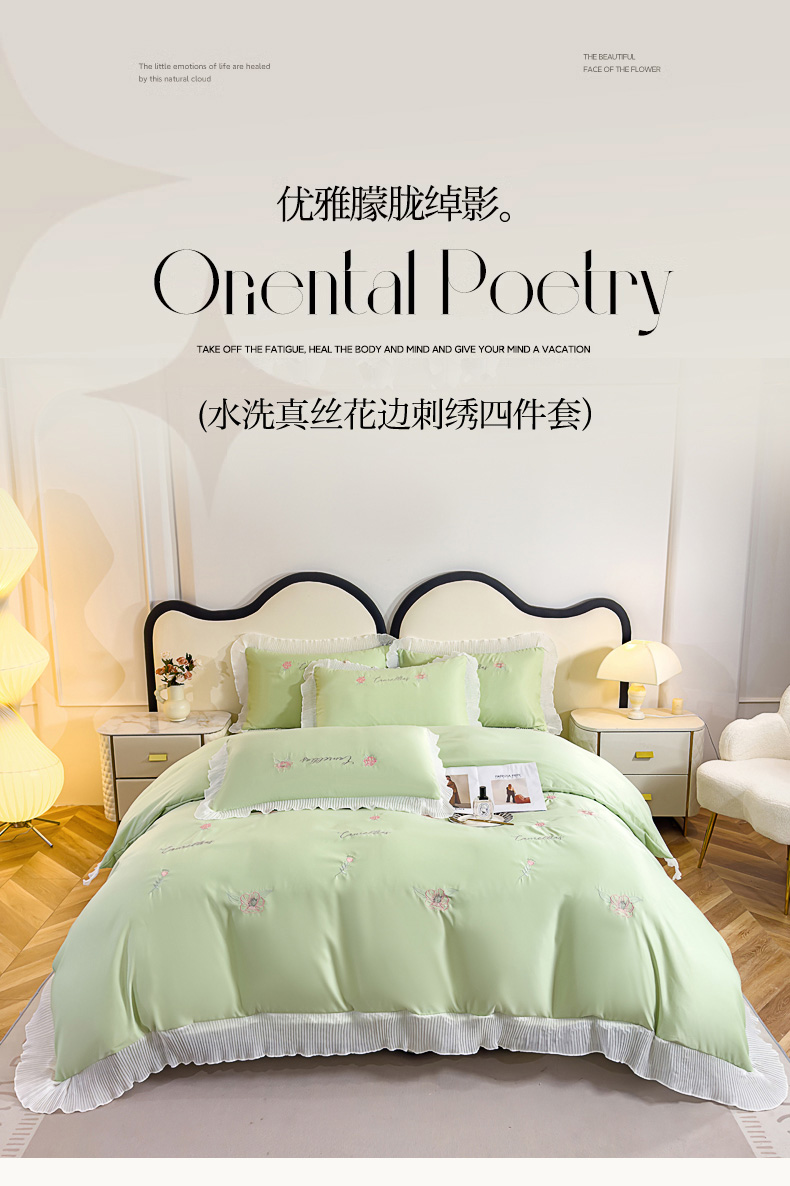 当前位置: 91家纺网 > 商品网购 > 床品套件 > 四件套 > 水洗棉四件套 > 菲儿家纺 2024新款水洗真丝花边刺绣四件套-花样年华系列 香草绿