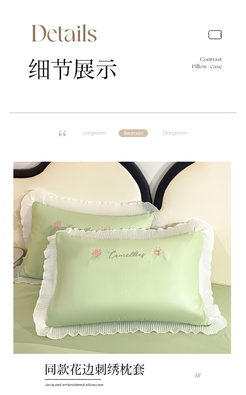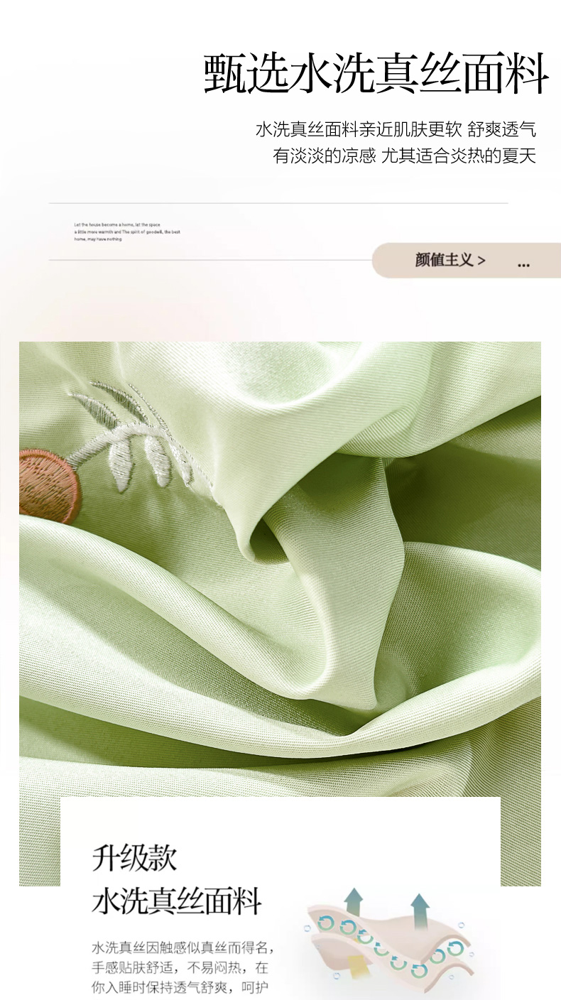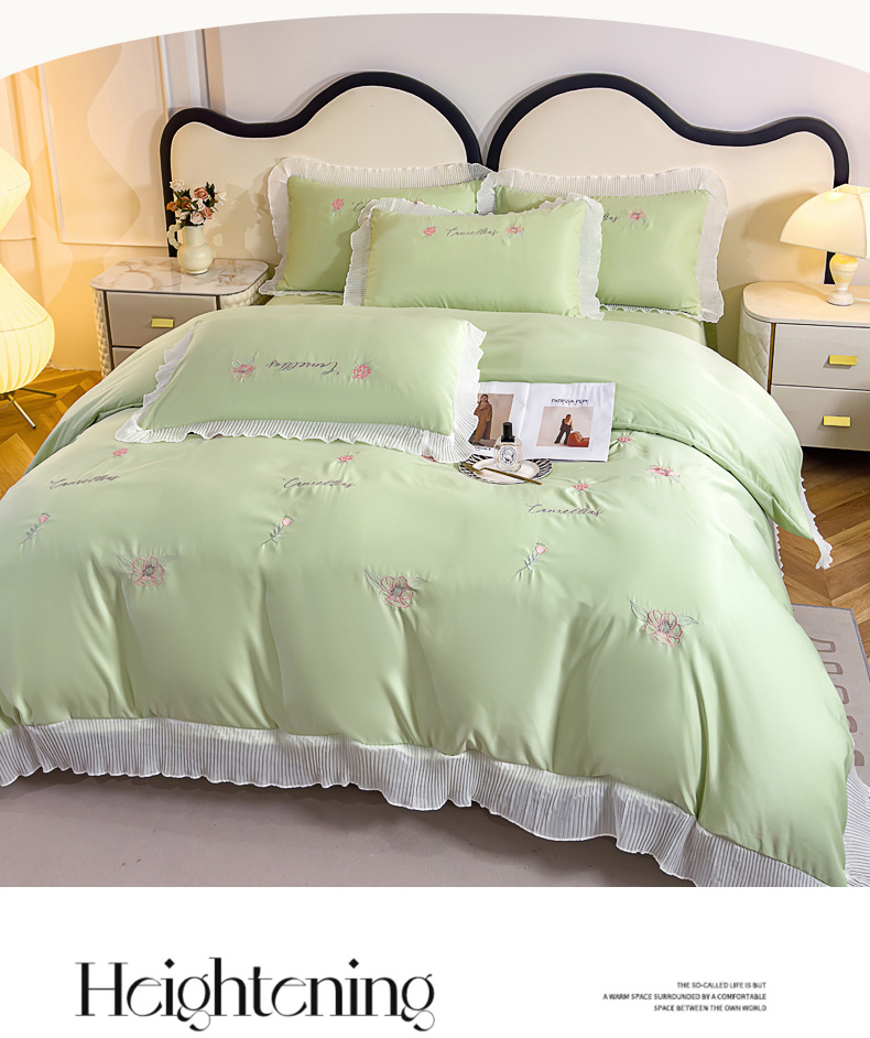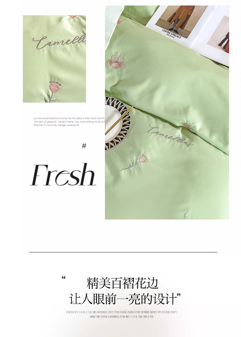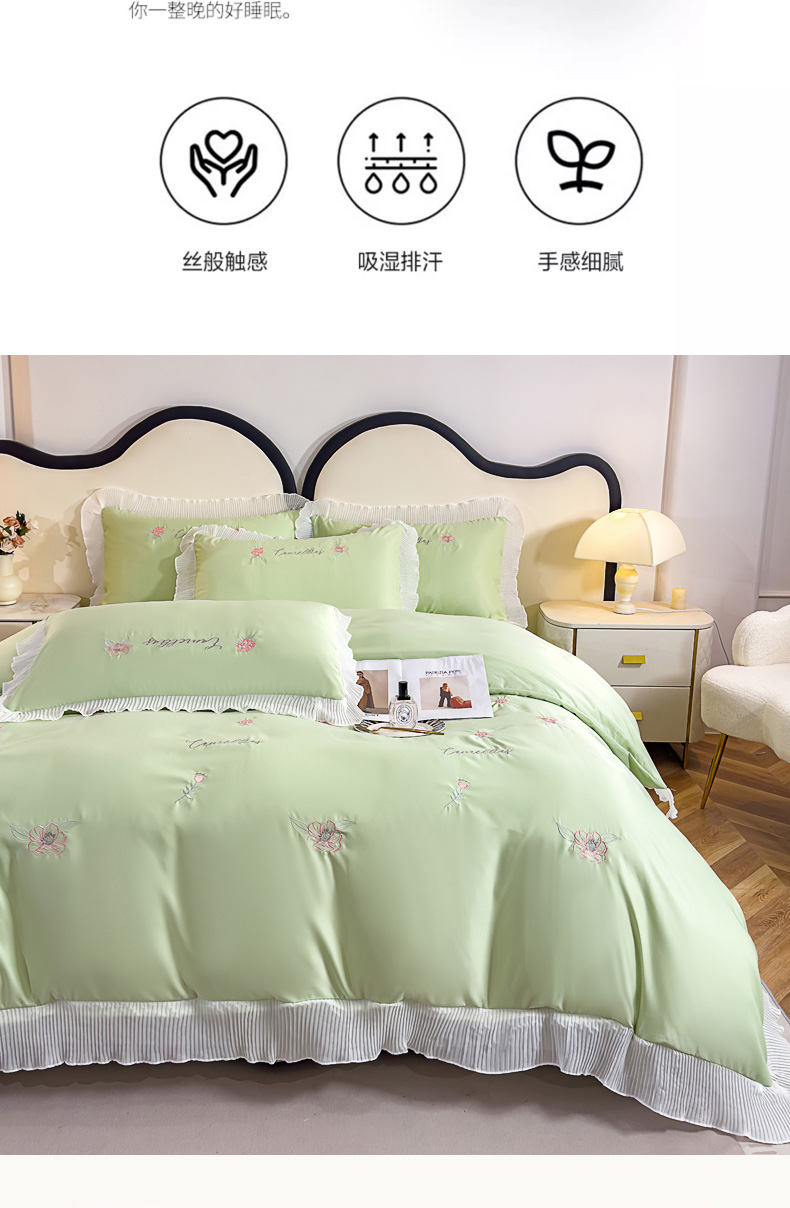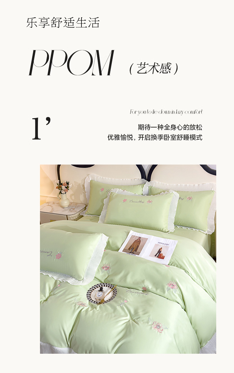 当前位置: 91家纺网 > 商品网购 > 床品套件 > 四件套 > 水洗棉四件套 > 菲儿家纺 2024新款水洗真丝花边刺绣四件套-花样年华系列 香草绿