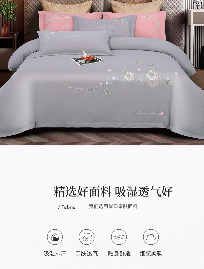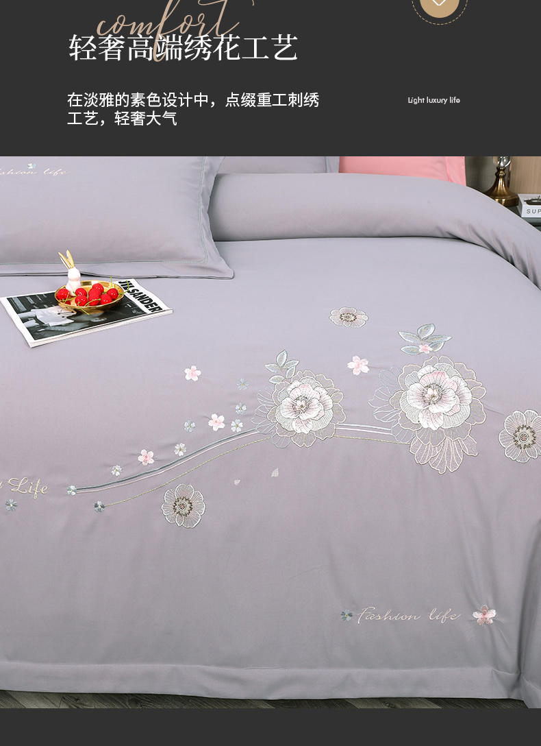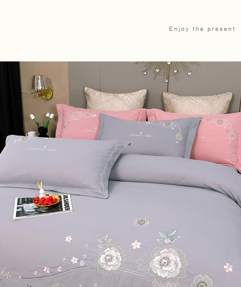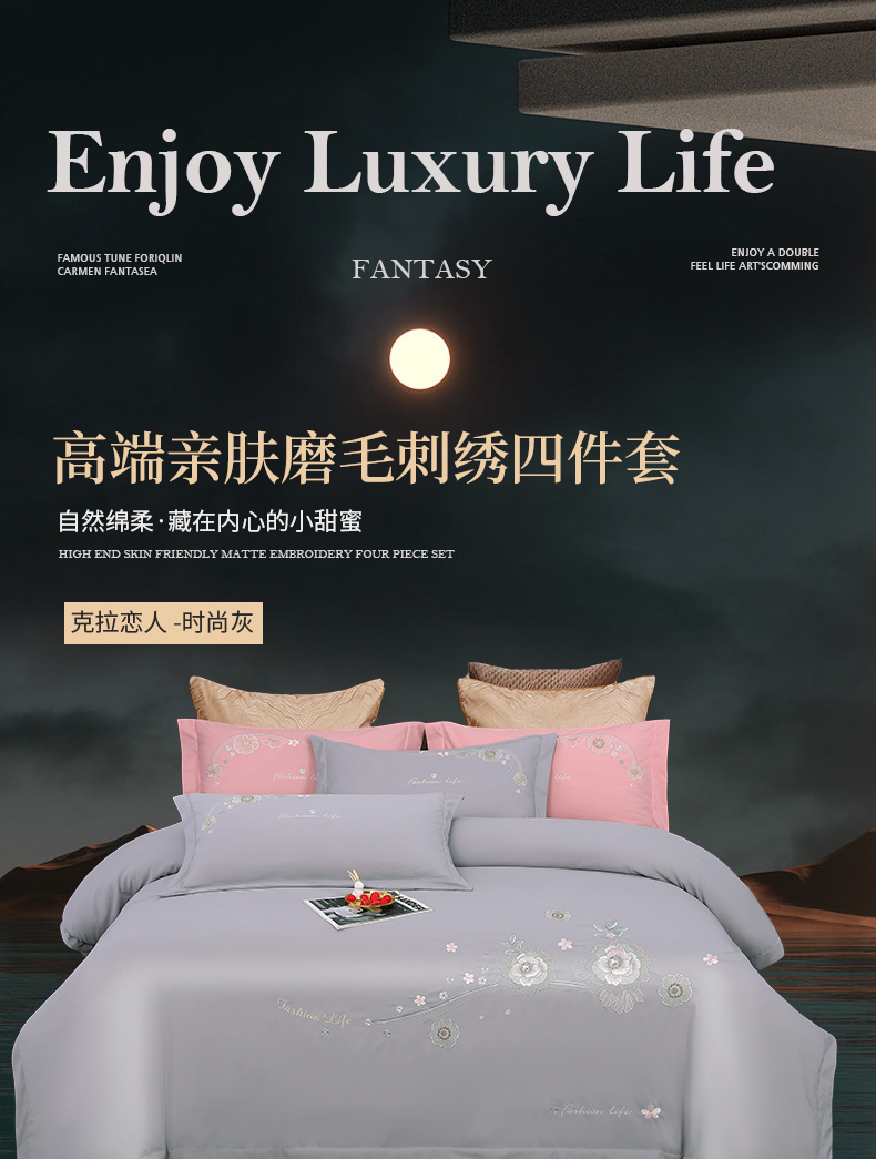 浩情国际 2026四季款斜纹木棉绣花克拉恋人系列四件套 克拉恋人-时尚灰