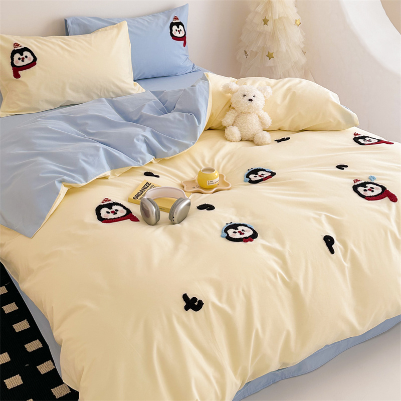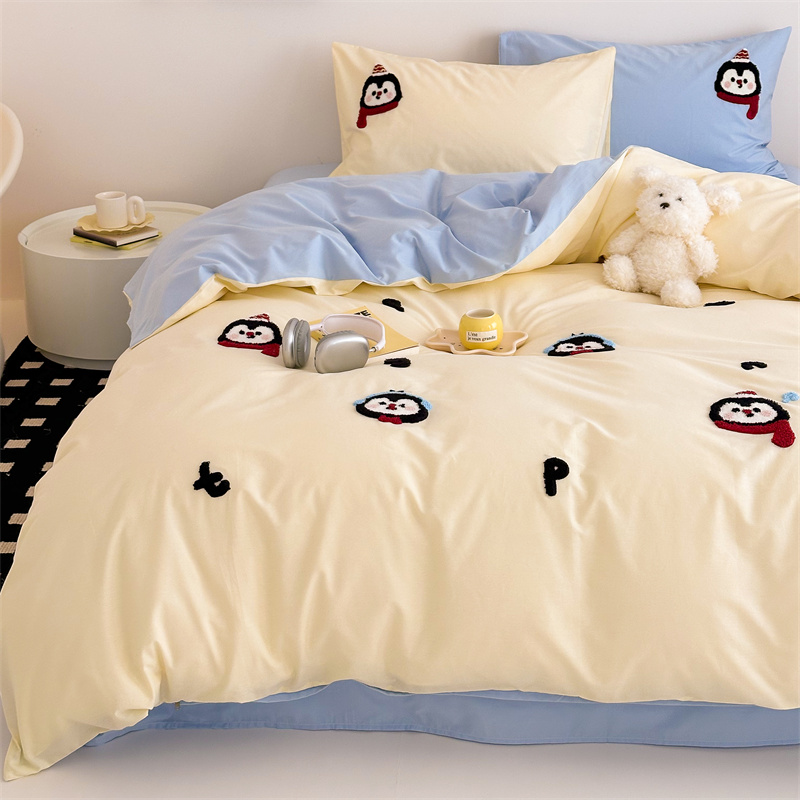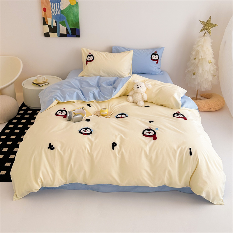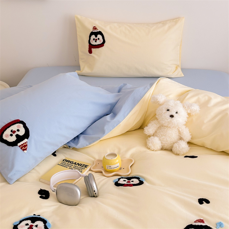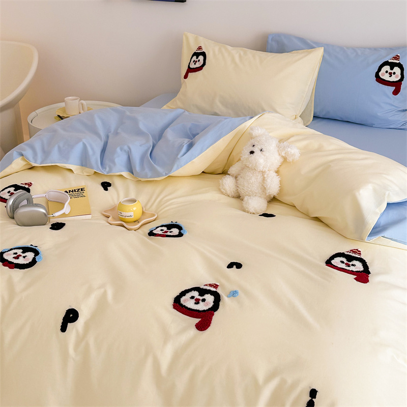 珺柔家纺 2024新款全棉水洗绵毛巾绣四件套 小企鹅