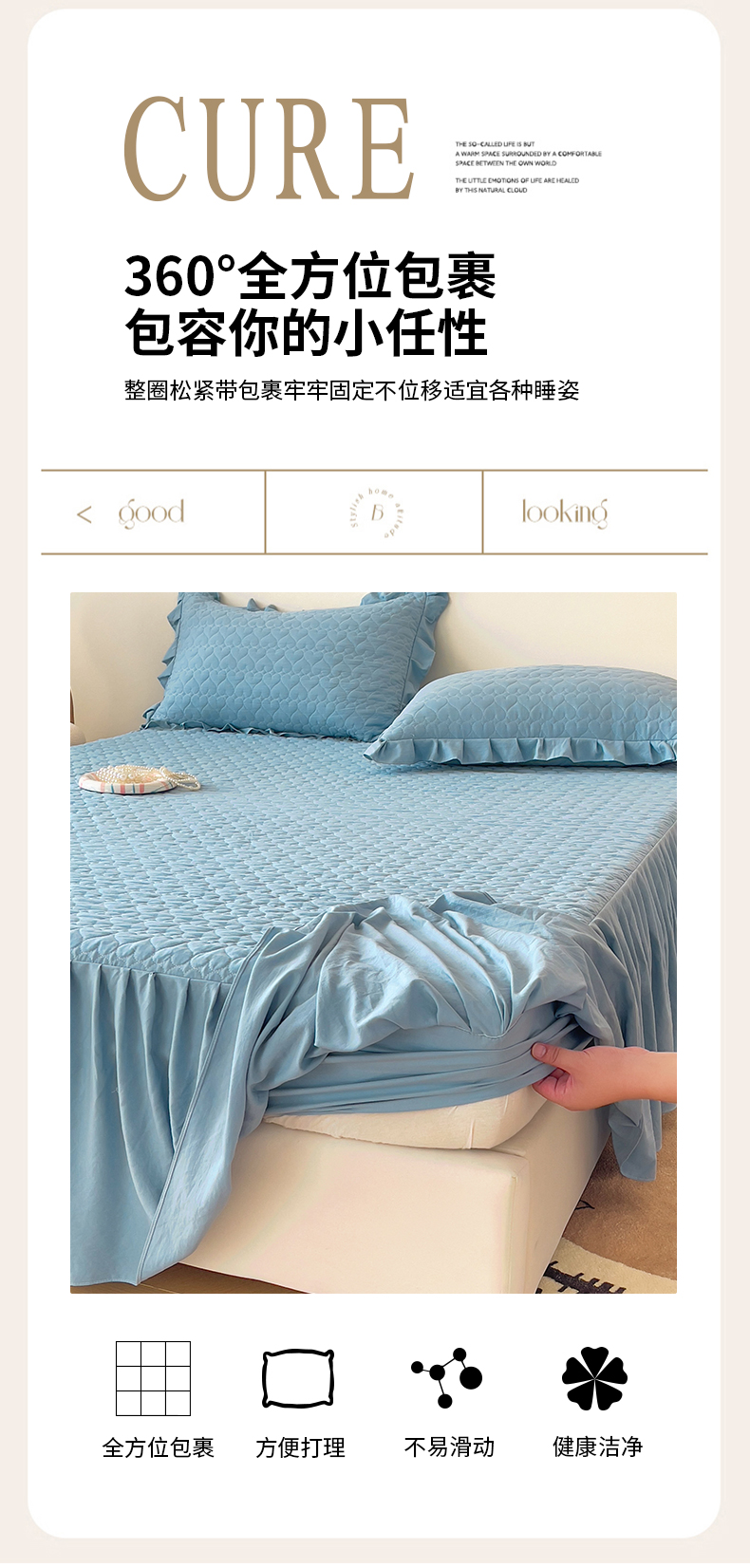 (总)屹成 2024新款高密亲肤天竺棉款夹棉床笠,豆沙色,格调蓝,孔雀绿,经典灰,典雅驼,玳瑁紫