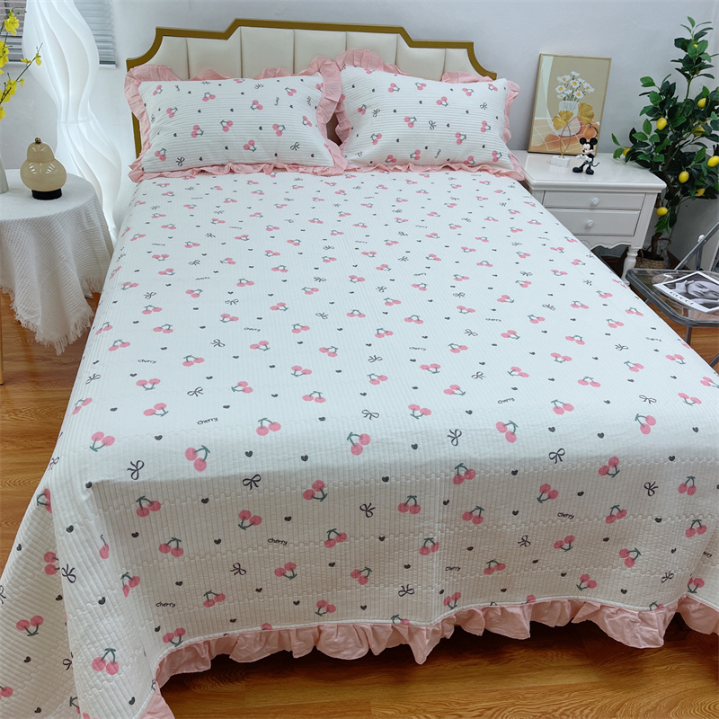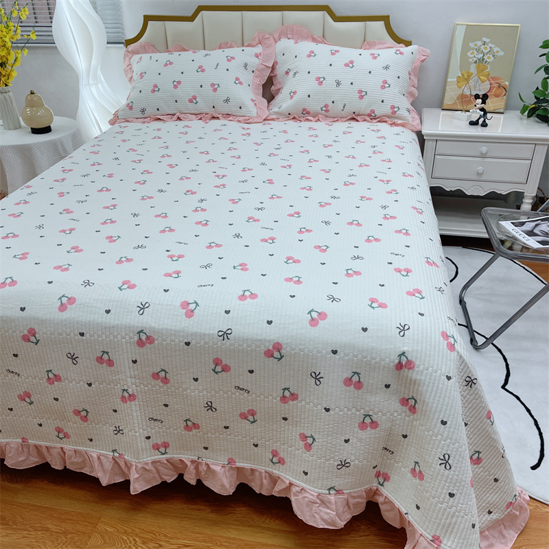 暖居 2024新款A类双层纱全棉床盖三件套防滑不跑床绗缝加厚纯棉床单 爱心樱桃