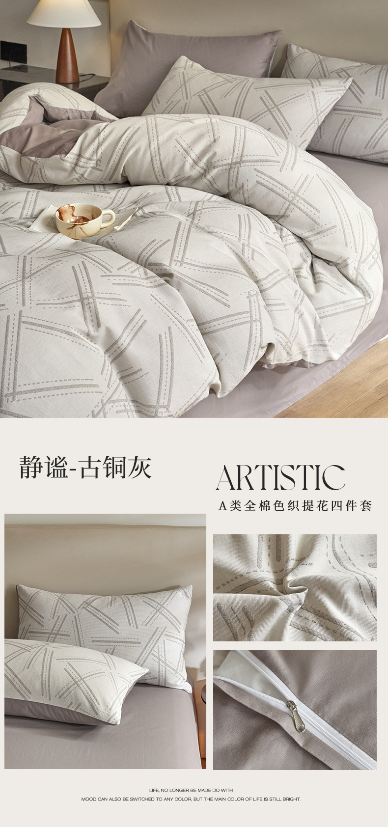 当前位置: 91家纺网 > 商品网购 > 床品套件 > 四件套 > 全棉普通四件套 > 慕色家纺 2024新款A类全棉色织提花四件套系列 静谧-古铜灰