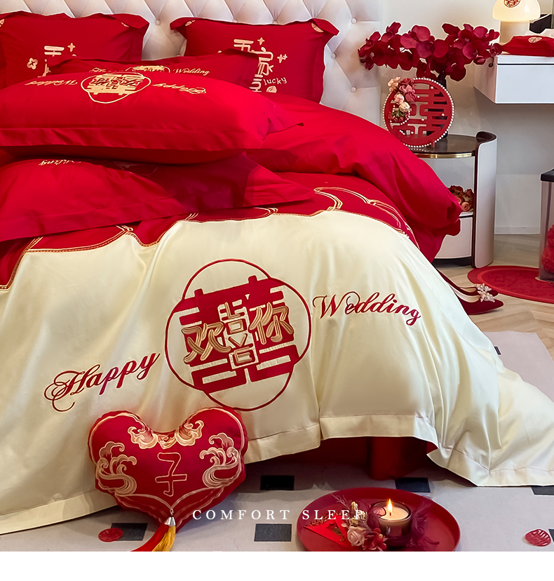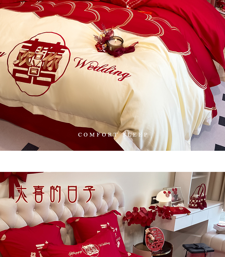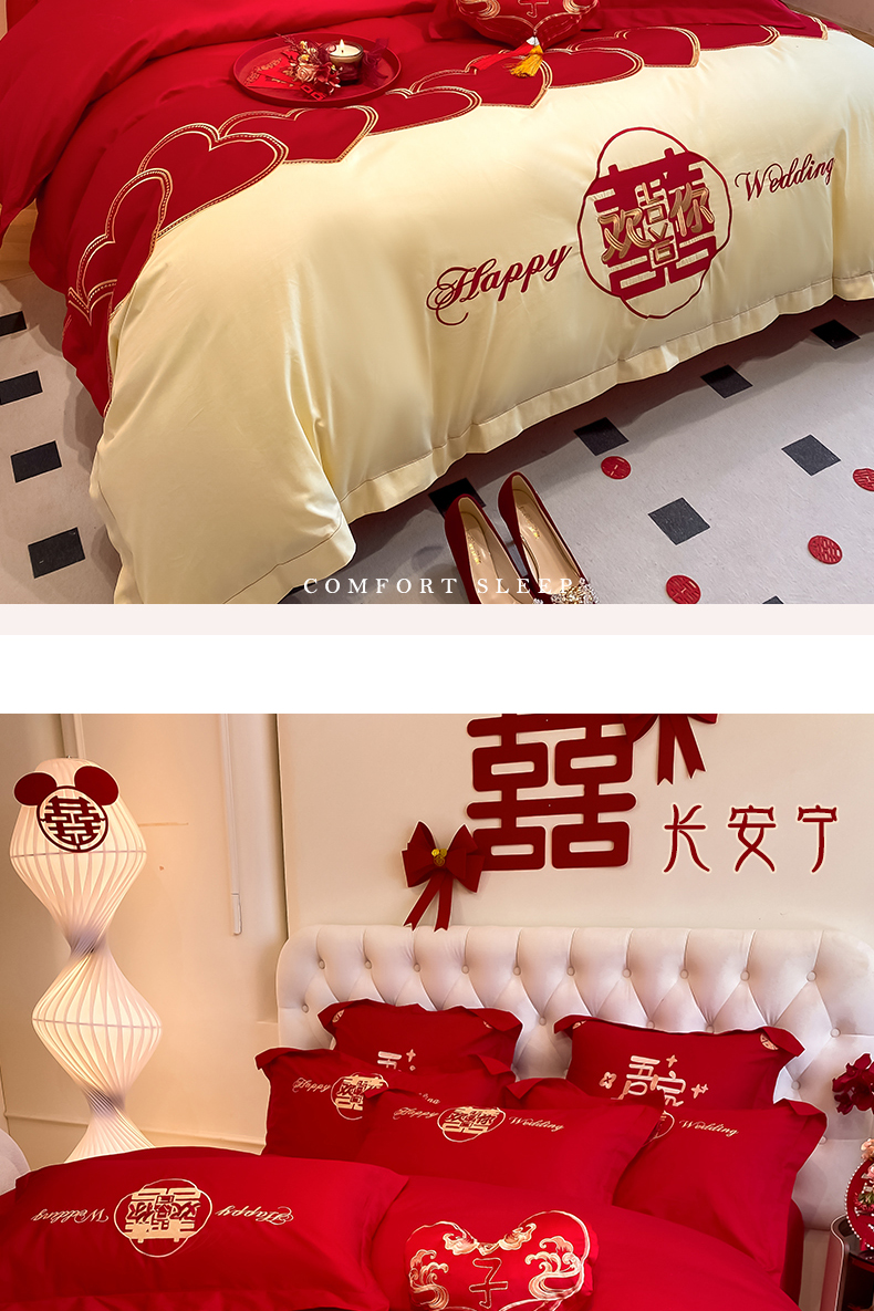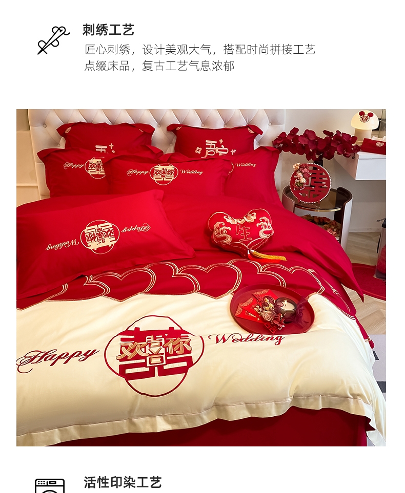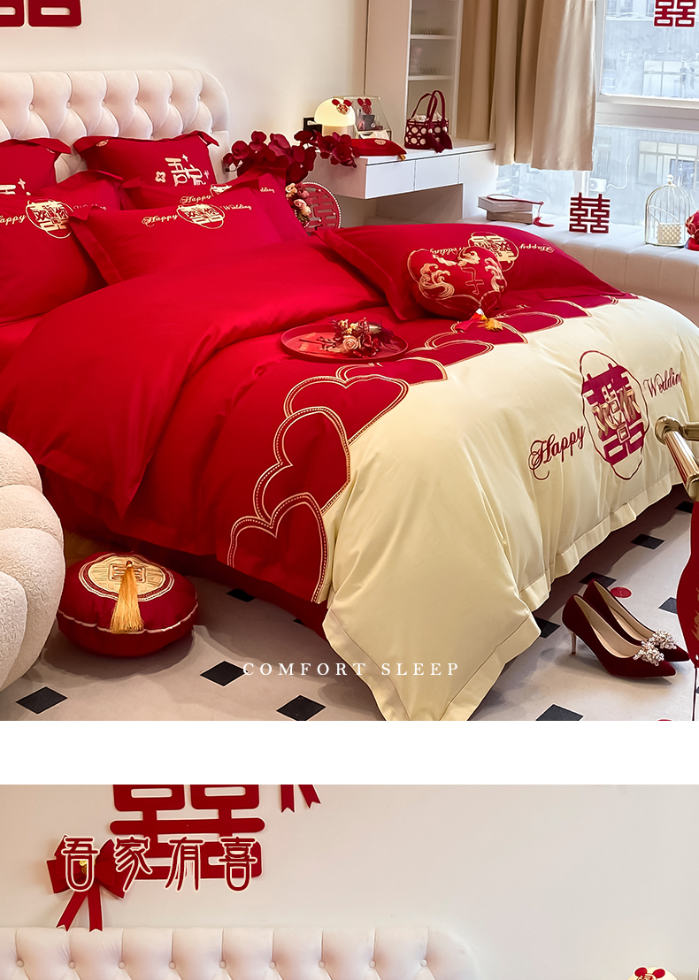 当前位置: 91家纺网 > 商品网购 > 床品套件 > 四件套 > 婚庆四件套 > 玉雅家纺 2025新款60支长绒棉时尚拼色浮雕刺绣婚庆四件套 佳偶
