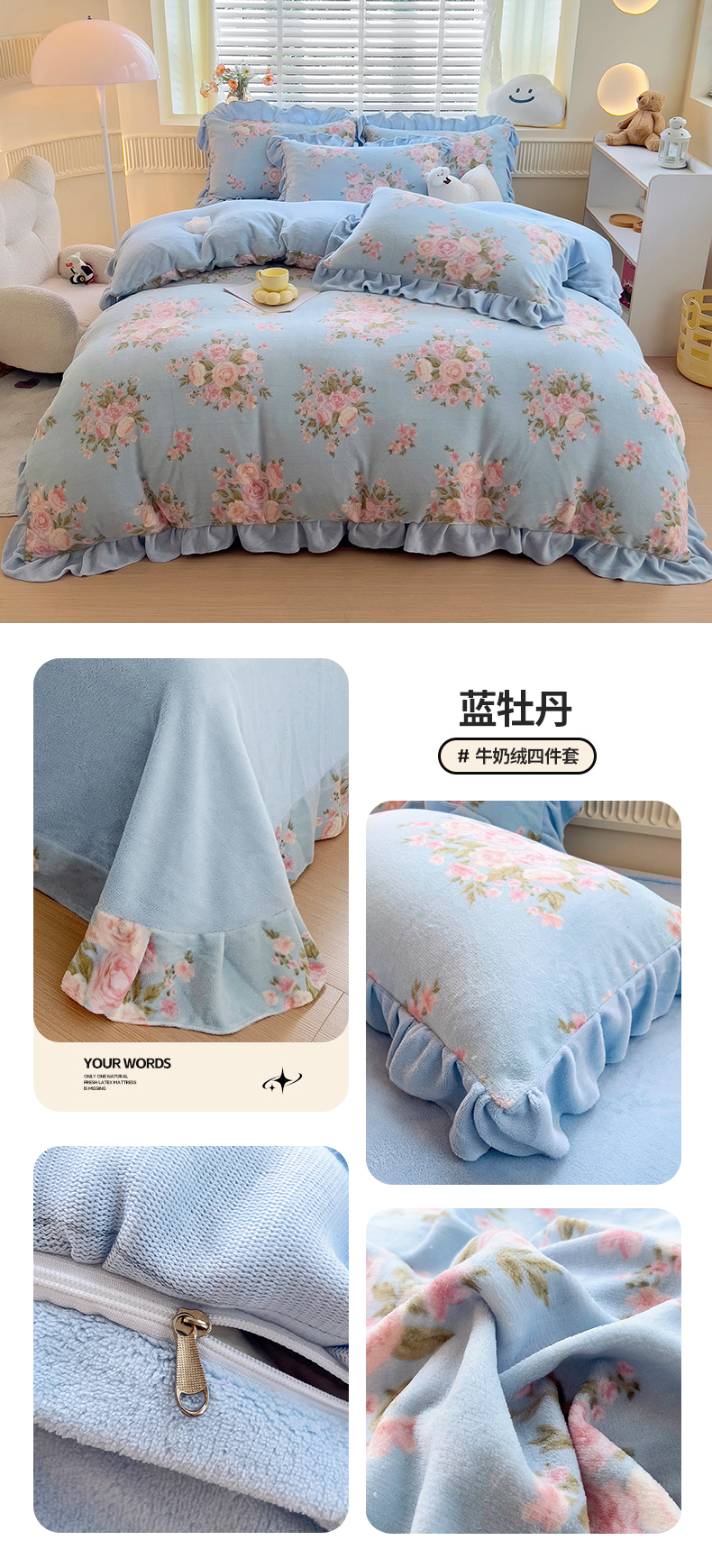 商品名称:找底底家纺 2024新款牛奶绒印花四件套 蓝牡丹