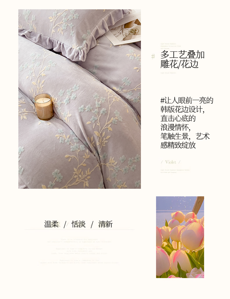 2024新品A类牛奶绒韩版雕花四件套 梨花海棠-浅咖