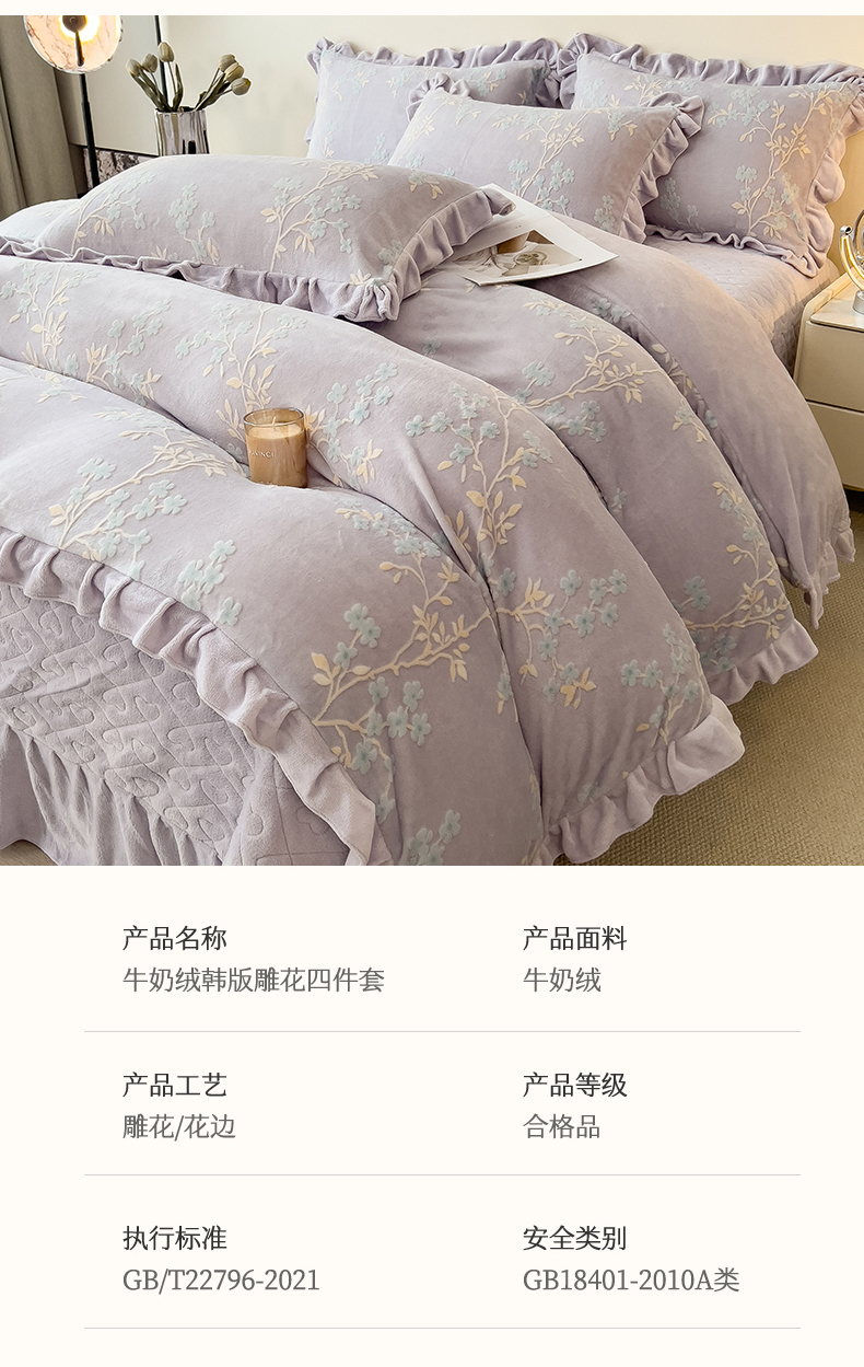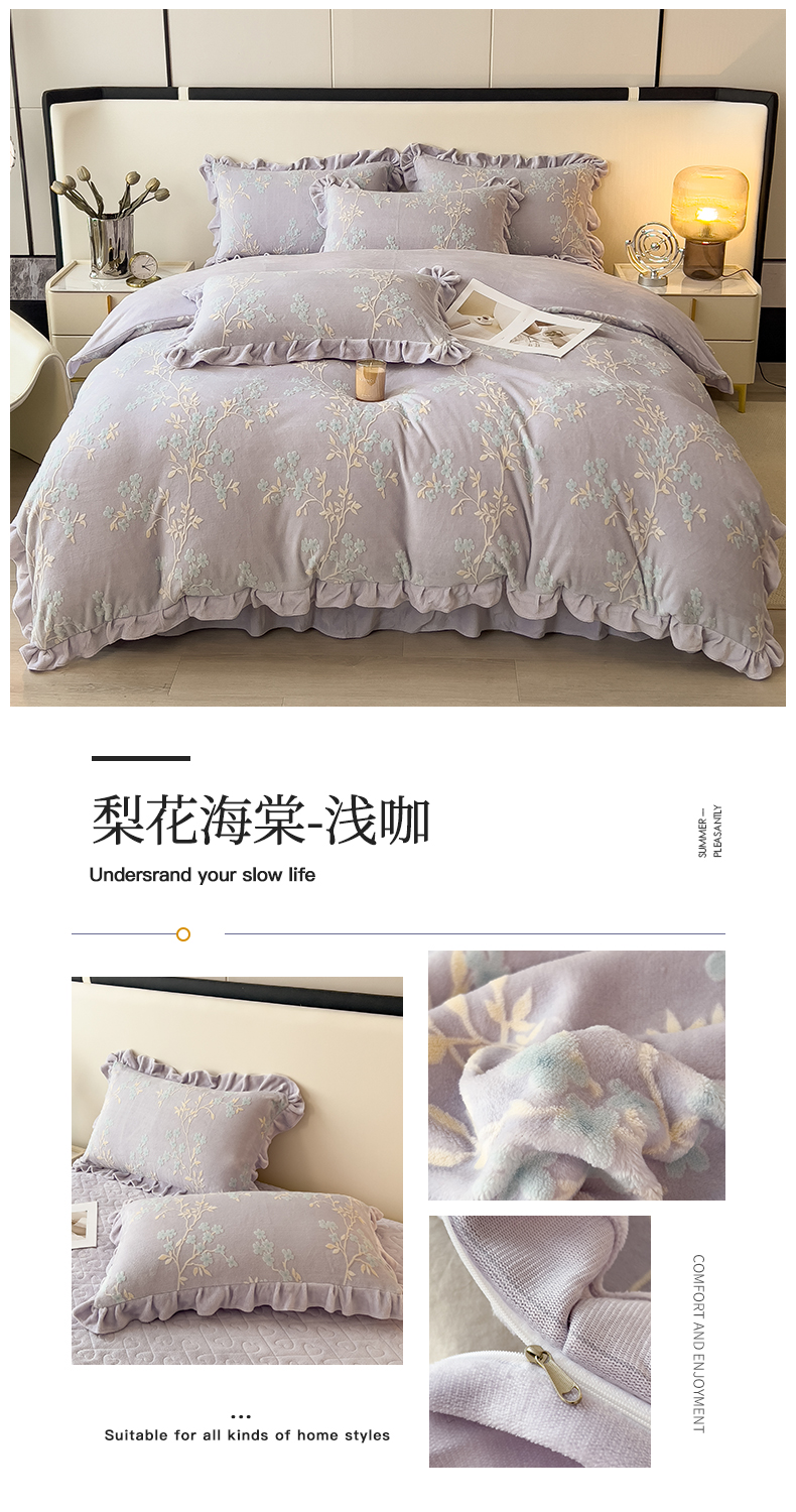 商品名称:2024新品A类牛奶绒韩版雕花四件套 梨花海棠-浅咖