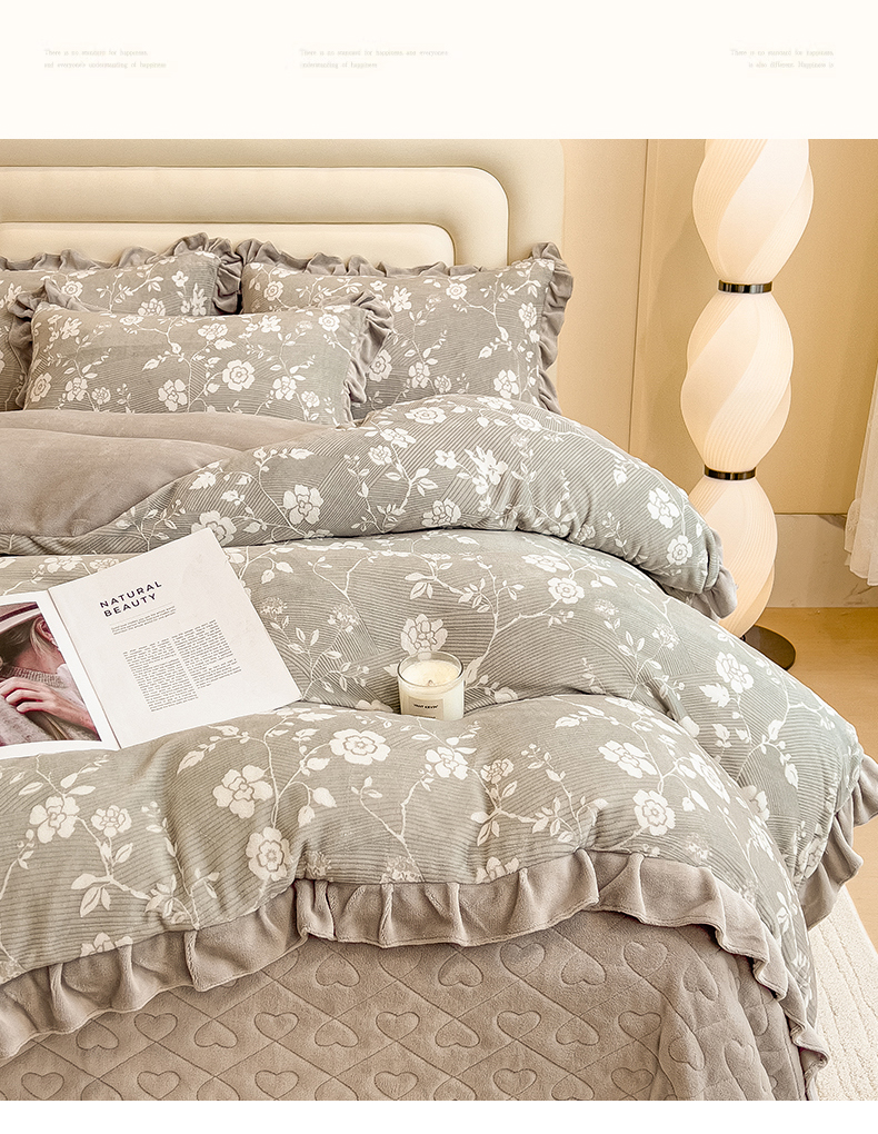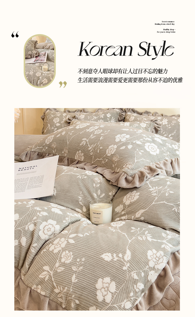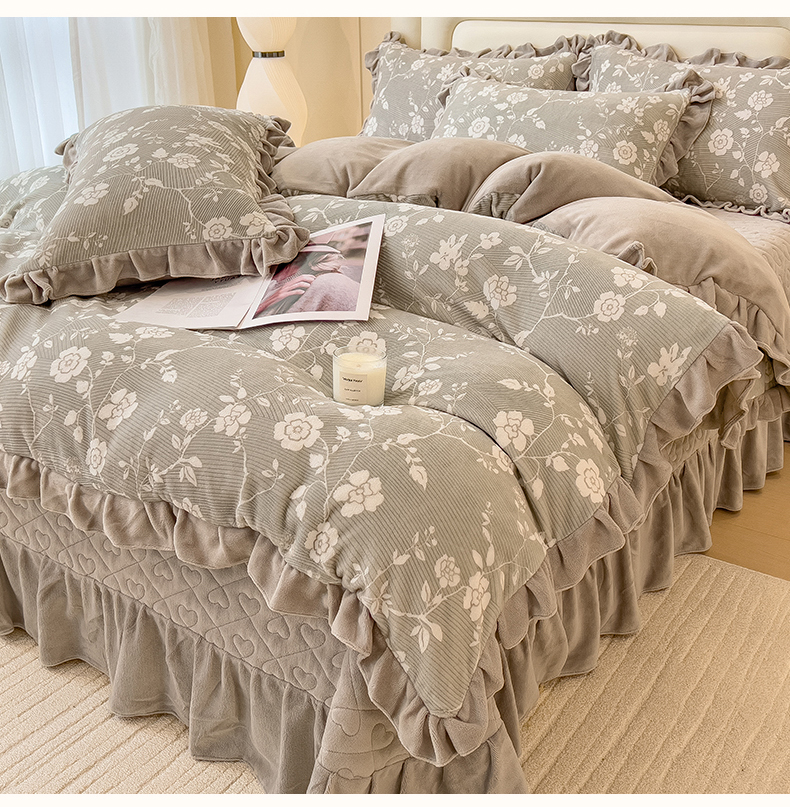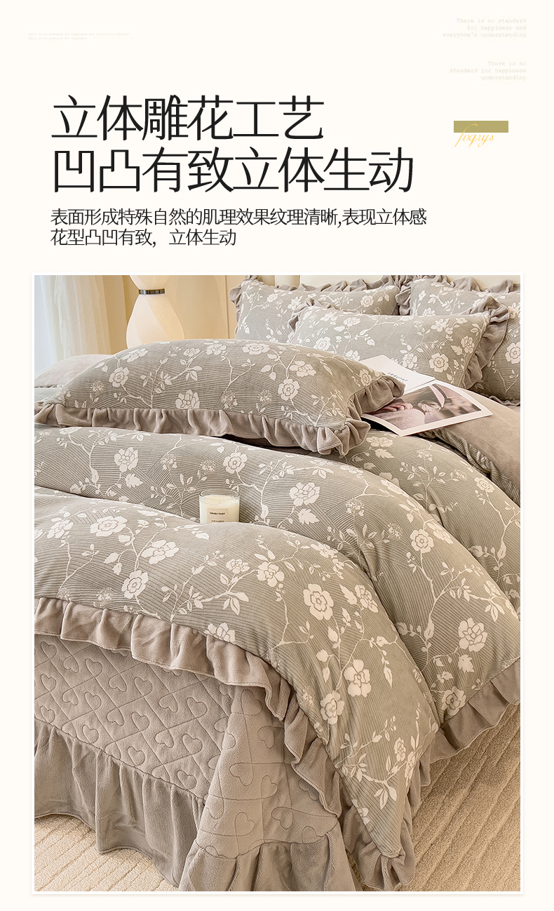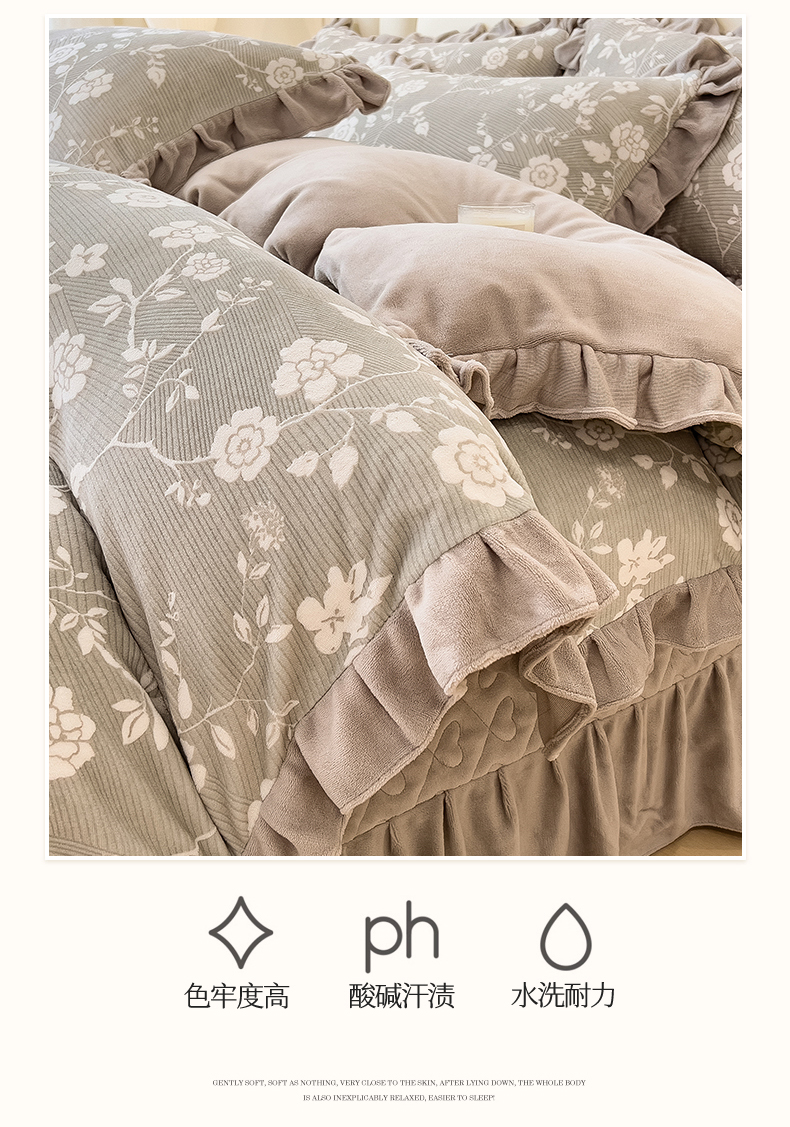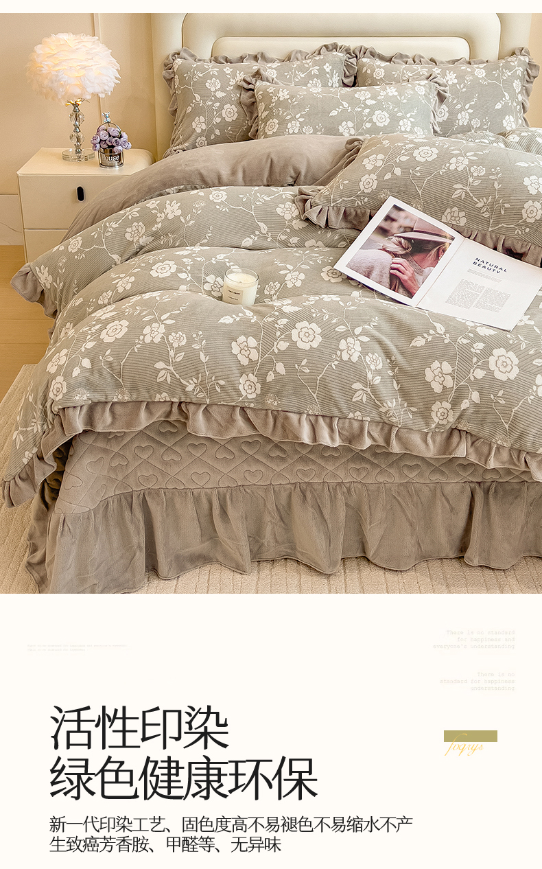 (总)恒爱 2022秋冬水晶绒翩翩花舞夹棉床裙四件套,大红色,豆沙红,橄榄绿,公主粉,桔色,咖啡色,孔雀绿,拉菲红,罗兰紫,玫红色,美人玉,米白色,米驼色,抹茶绿,浅灰色,紫色