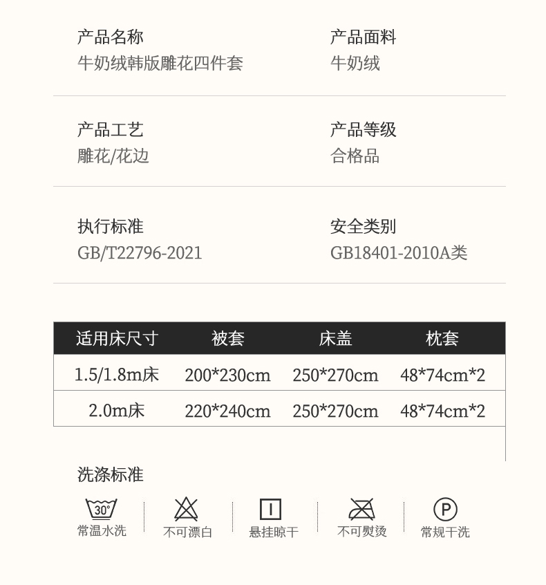 商品名称:2024新品A类牛奶绒韩版雕花四件套 蔷薇-浅咖