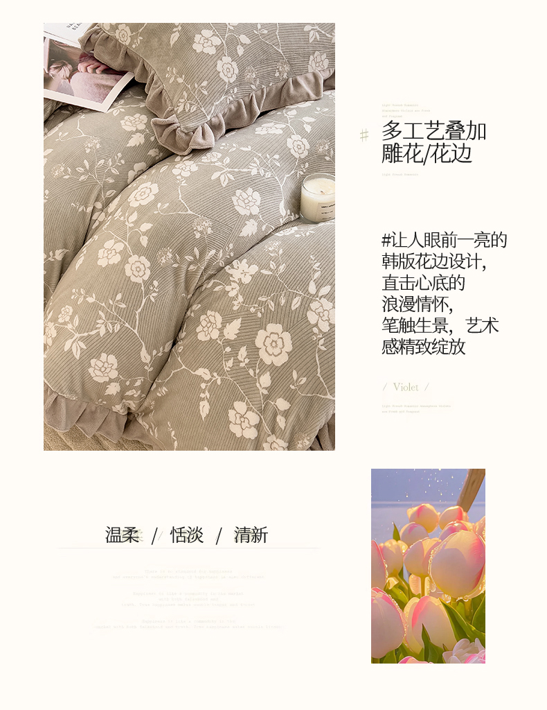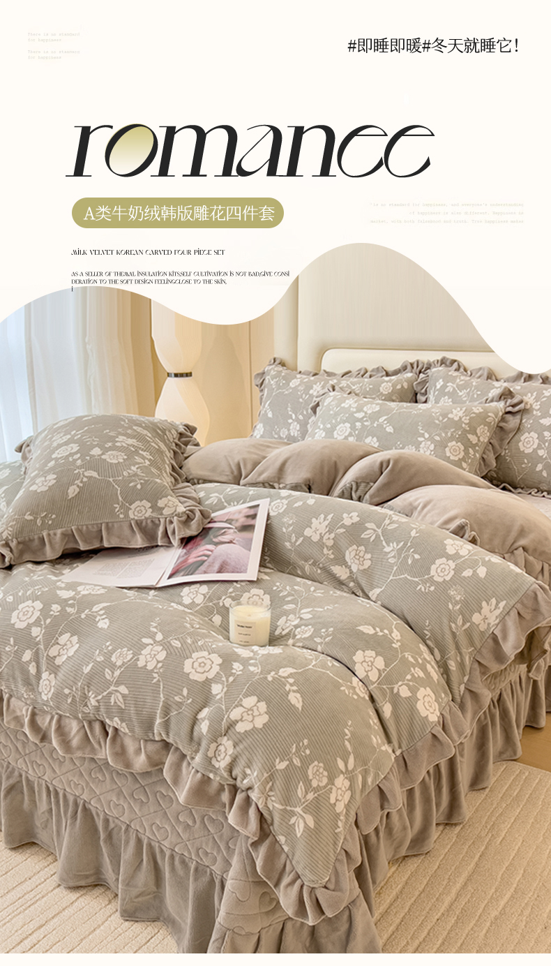 2024新品A类牛奶绒韩版雕花四件套 蔷薇-浅咖