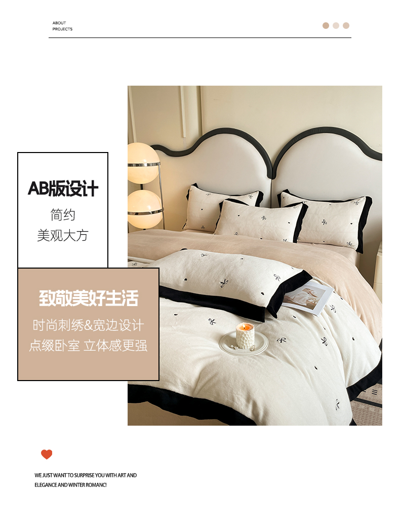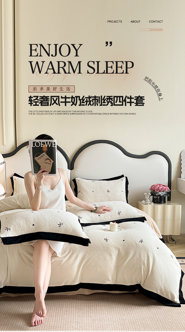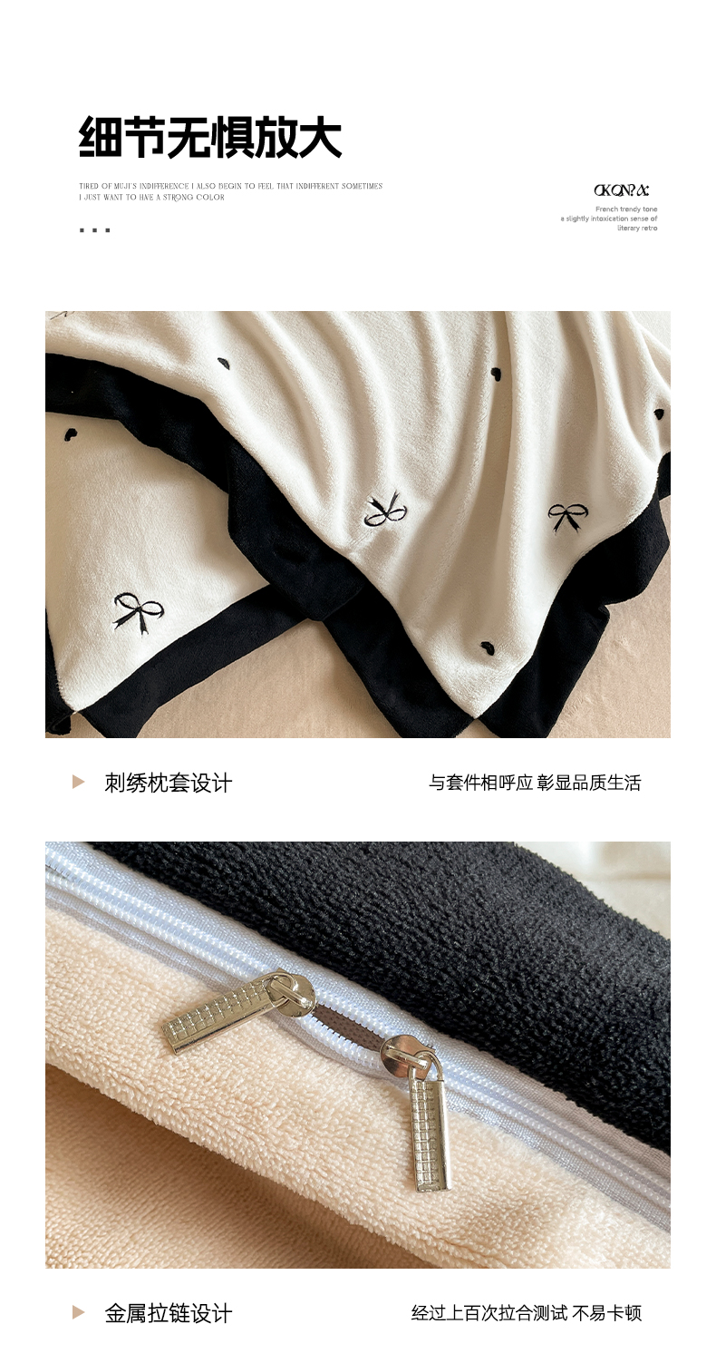商品名称:宇航家纺 2025新款轻奢风宽边牛奶绒绣花四件套-蝴蝶结爱心 绒蝴蝶结-白拼卡其