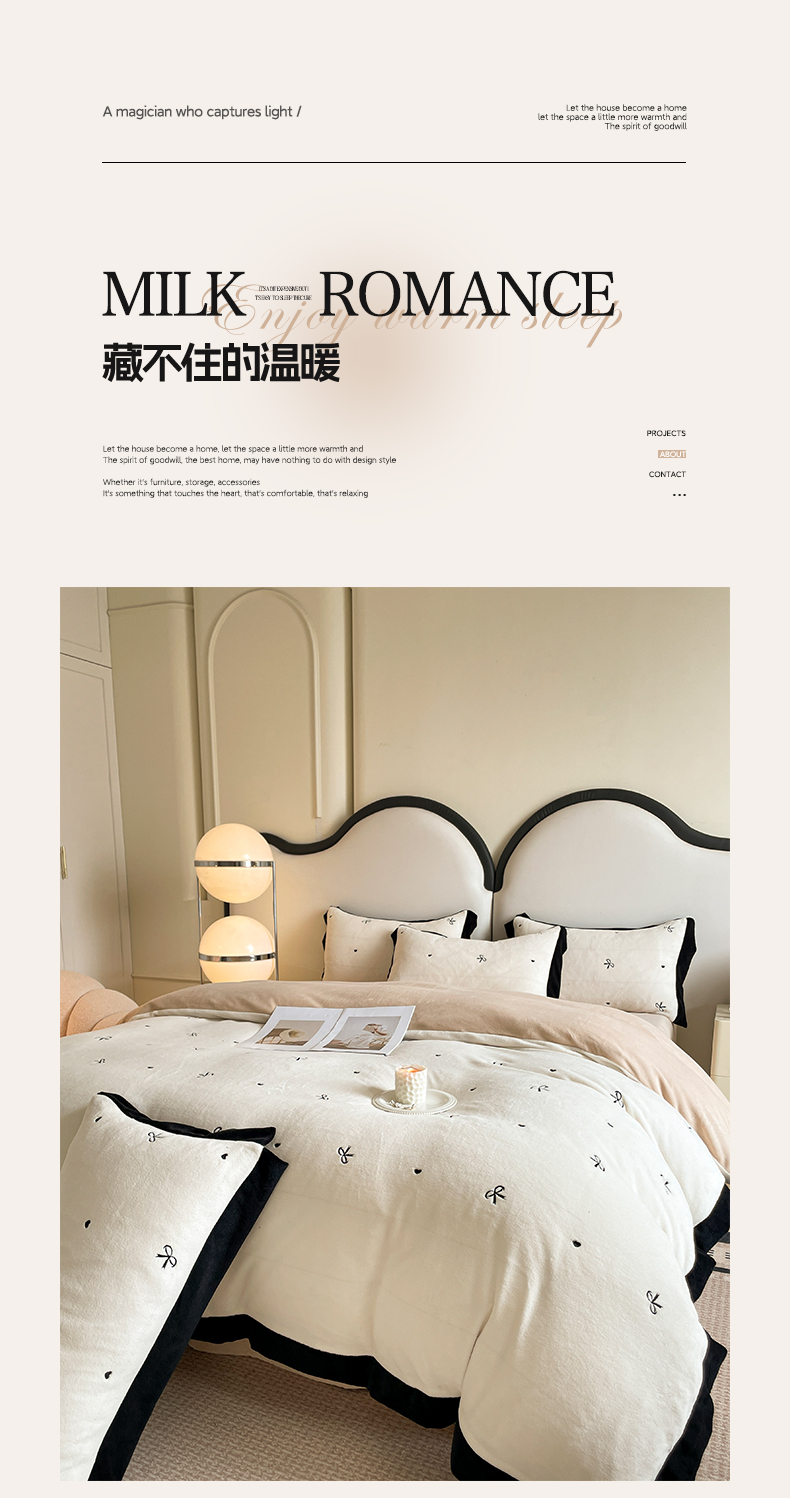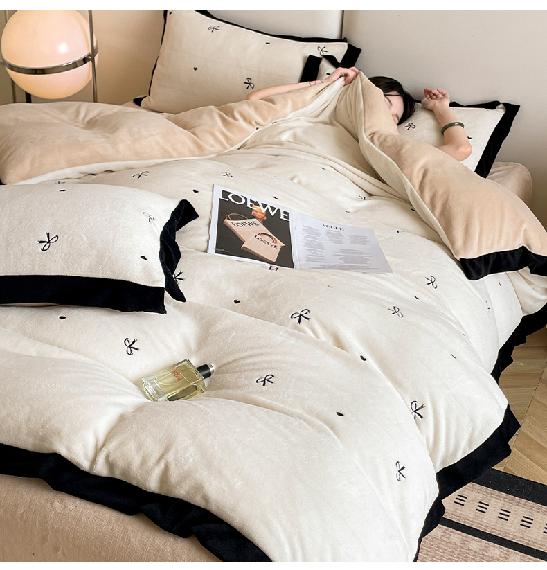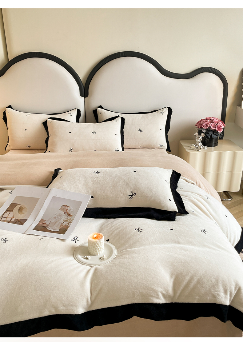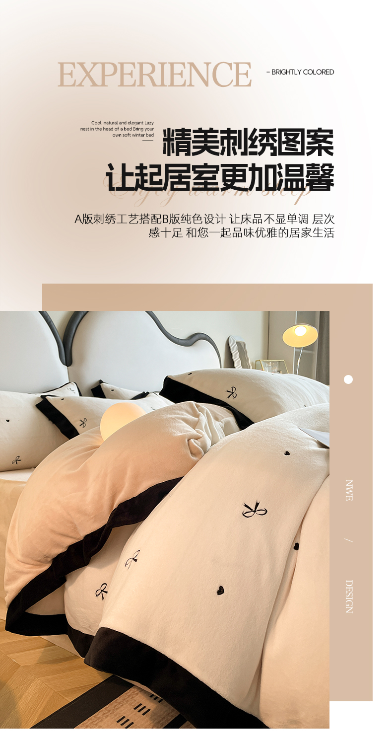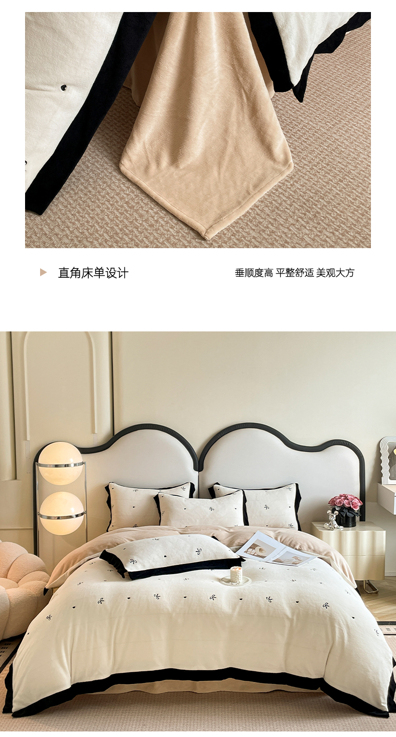 宇航家纺 2025新款轻奢风宽边牛奶绒绣花四件套-蝴蝶结爱心 绒蝴蝶结-白拼卡其