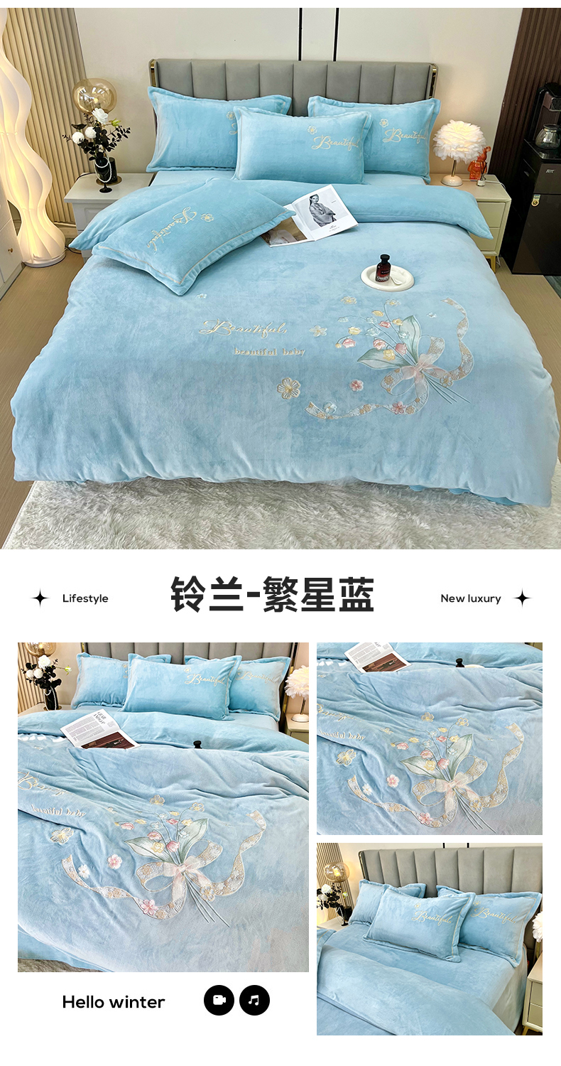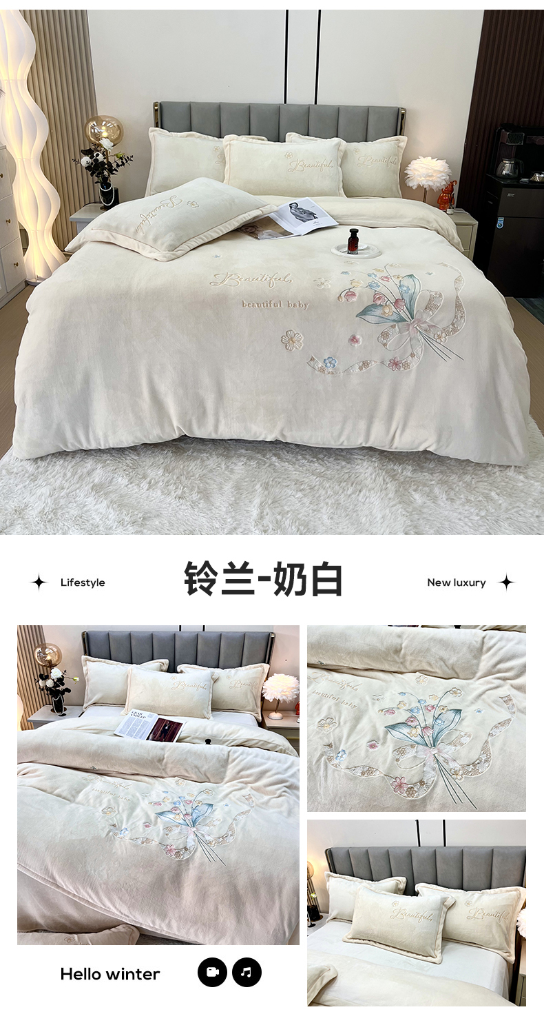 商品名称:鑫利来家纺 2024新款牛奶绒四件套加厚保暖绣花四件套铃兰系列 铃兰-粉玉