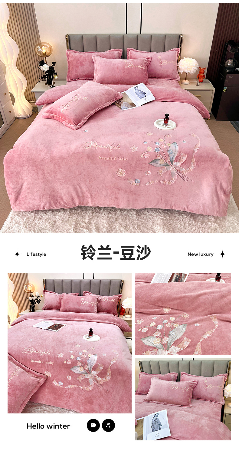鑫利来家纺 2024新款牛奶绒四件套加厚保暖绣花四件套铃兰系列 铃兰-粉玉