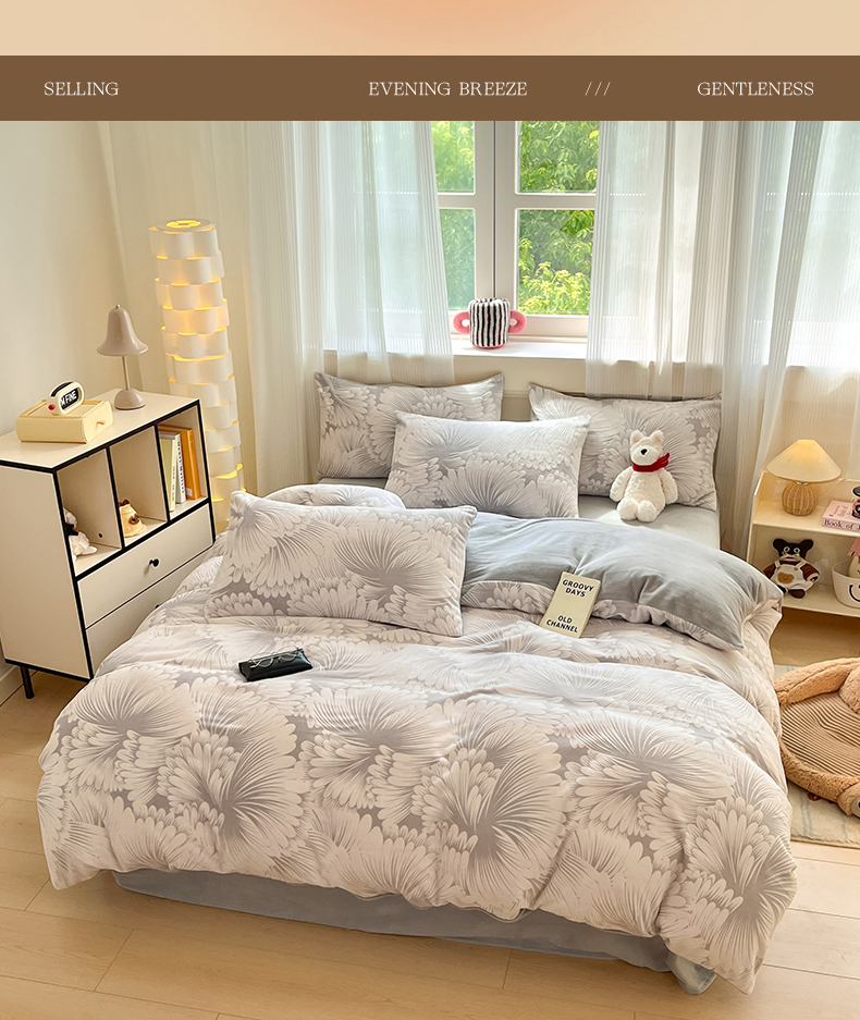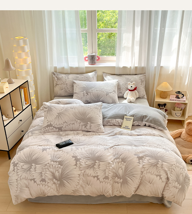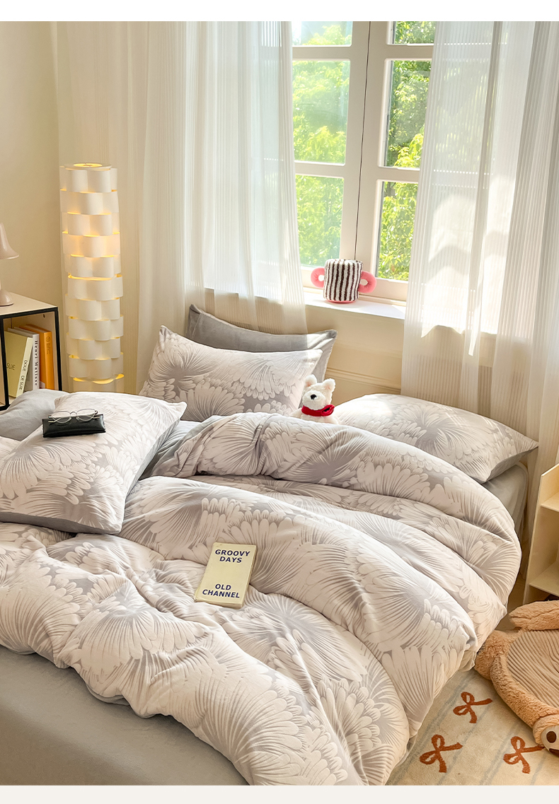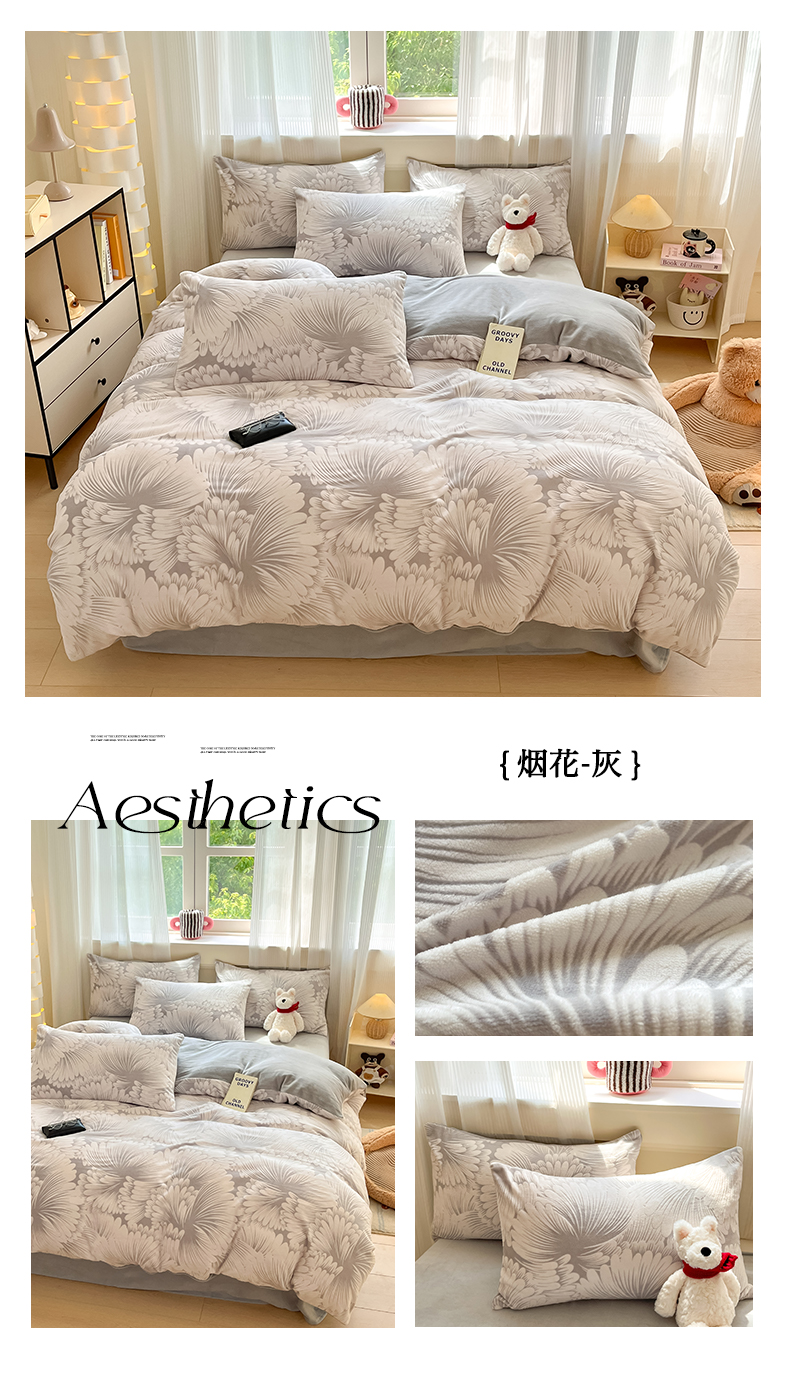 商品名称:莱茵家居 2024新款a类加厚立体雕花牛奶绒四件套 烟花-灰
